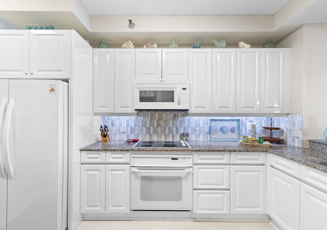 The gourmet kitchen is a chef's dream, equipped with top-of-the-line appliances, granite countertops, and all the dishware, cookware, and utensils you need to create your favorite meals. The living area is perfect for family movie nights, with a plush L-shaped sectional, an additional cushioned chair, and a large flat-screen HDTV.