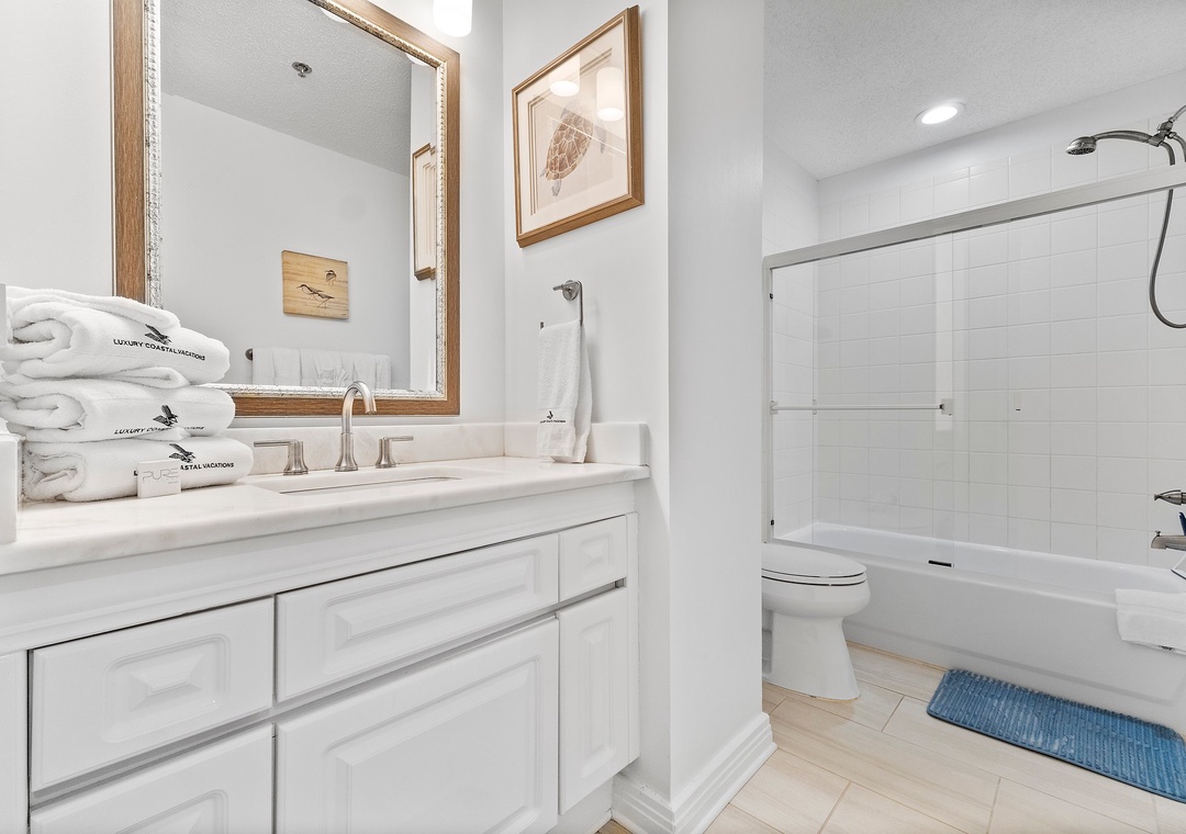 The living area includes comfortable yet stylish furnishings, perfect to gather with family and friends. You will certainly indulge in some much needed rest and relaxation in the master retreat, boasting a cozy king bed with a premium mattress set and high thread count linens. The attached bath offers a vanity area with plenty of space, a walk in shower and large garden tub. There is also a second full bathroom accessible from the guest room and hallway!