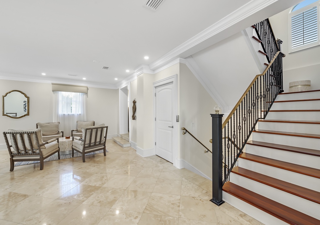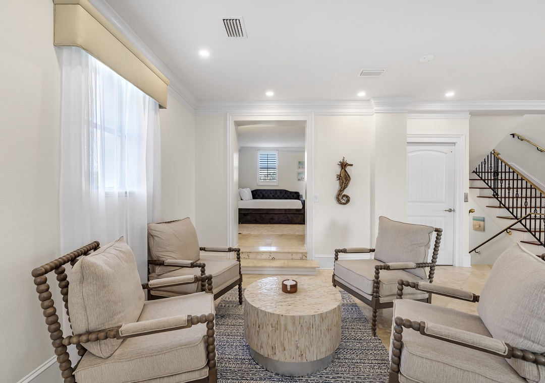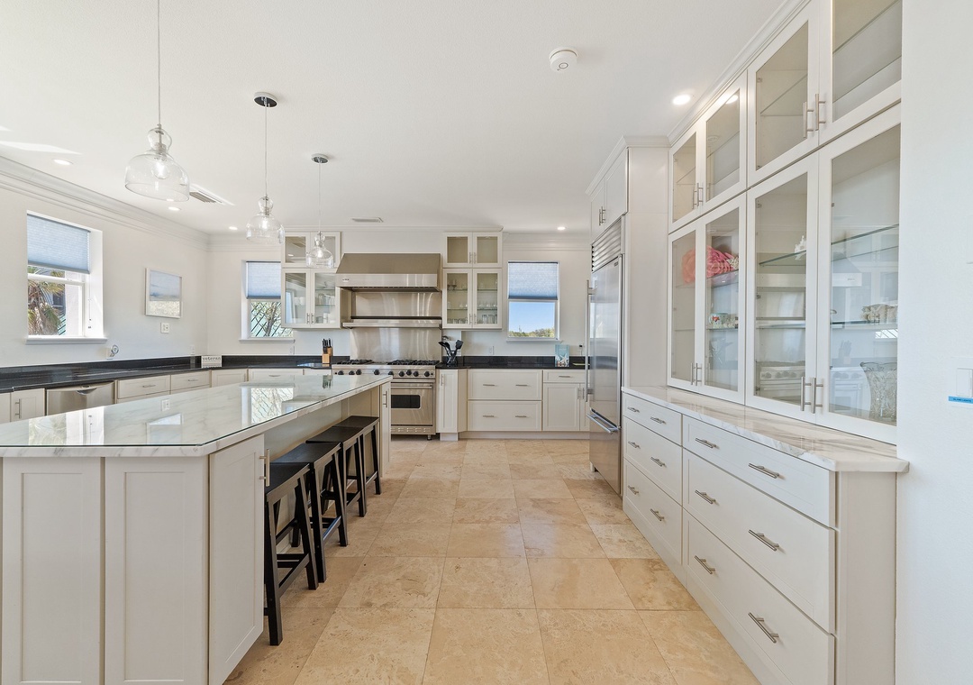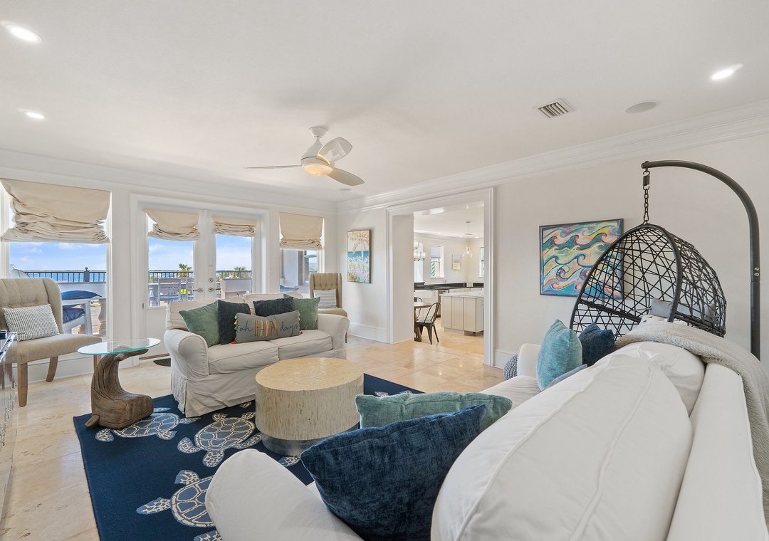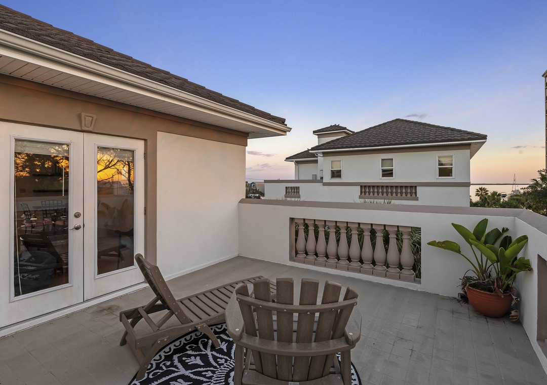 The Estate comprises two roomy Villas and a loft suite, comfortably accommodating up to 32 guests. The Waterfront Villa offers 3 bedrooms, a deluxe Chef's kitchen that will delight any culinary maestro, an elevator, and 3 balconies affording amazing beach views from each.Â