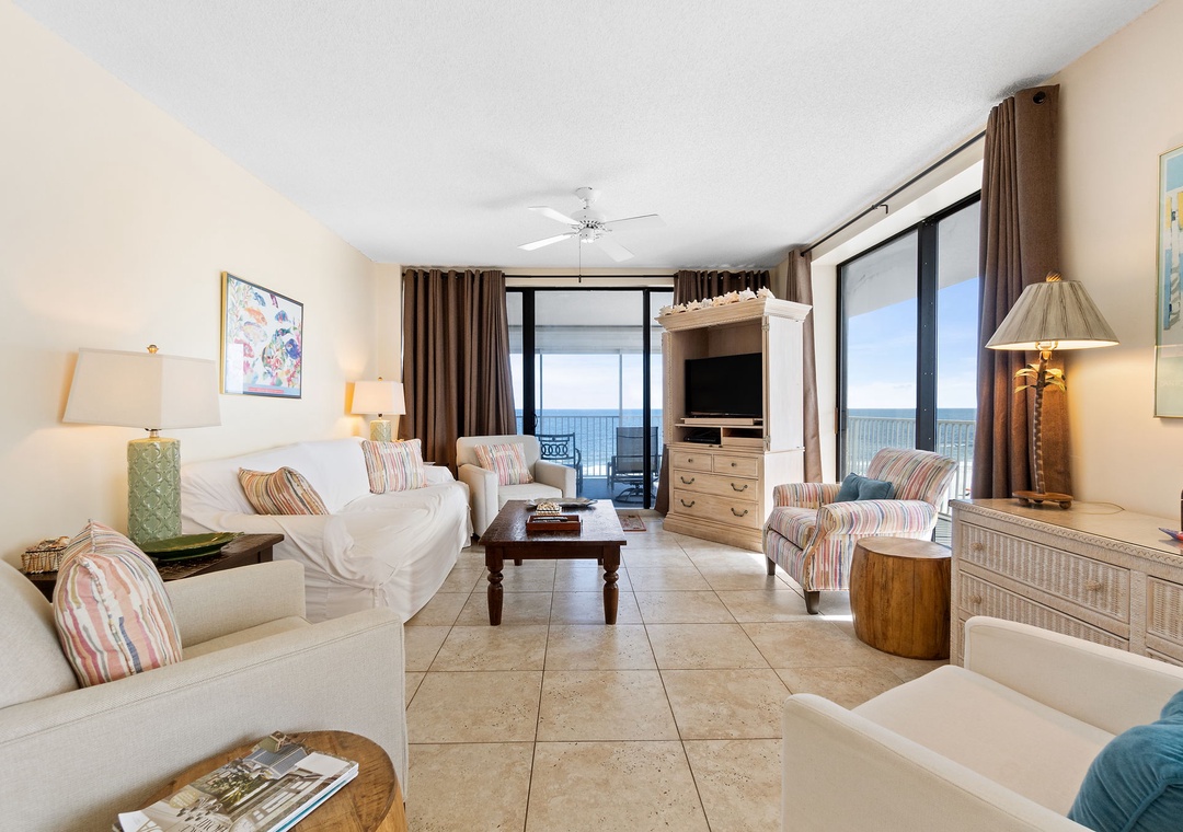 Turn your dream vacation into a reality when you stay in this stunning 3 bedroom, 2 bath spacious unit at Bluewater in Orange Beach! This fabulous 8th floor unit offers endless upgrades and luxury touches, including an open and spacious floor plan, updated electronics and a huge beachfront balcony with million-dollar views! The living area affords plenty of seating, including a plush sofa and additional side chairs. Catch up on some overdue relaxation and watch the game or your favorite movie on the huge LCD television! The best feature of the living area is beachfront balcony access! Floor-to-ceiling sliding glass doors open to the covered terrace, and with plenty of seating where you can enjoy your morning coffee, an after-dinner cocktail and even a delicious meal while delighting in the splendor of coastal living. The 8th floor affords panoramic views of the shimmering gulf!