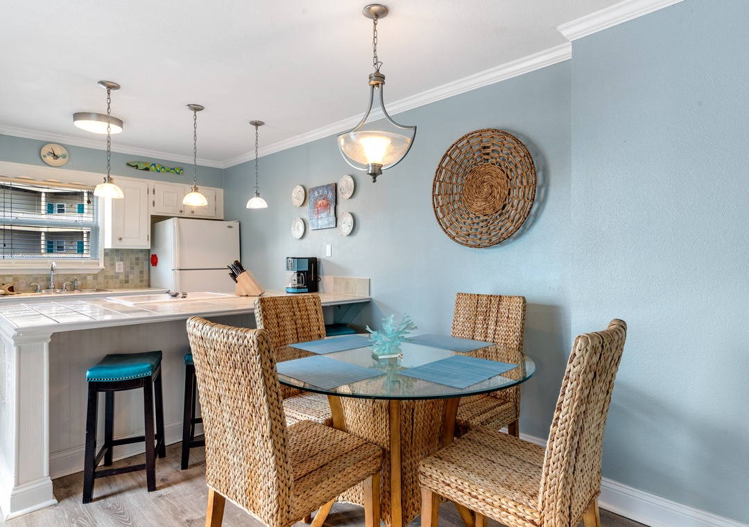This unit is thoughtfully decorated in a modern nautical-inspired aesthetic, with shades of turquoise, aqua and sea-glass blue paired with calming neutrals and wood finishes to create a breathtaking environment that was designed for relaxing and unwinding. Gather the whole family in the spacious living area for movie night, boasting a huge wall-mounted flat screen HDTV, roomy L-shaped leather chaise sectional sofa, leather side chair with ottoman, and balcony access! Large sliding glass doors open to the expansive covered balcony with ample seating. The kitchen is sure to ignite your inner-chef with a huge breakfast bar, and all the small appliances, utensils and cookware needed to whip up a delicious meal and impress your family and friends! The dining table affords seating for 4, with additional space for 4 at the breakfast bar.