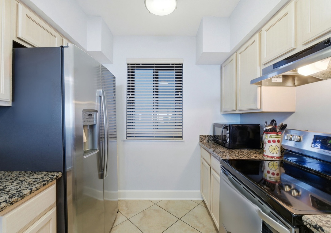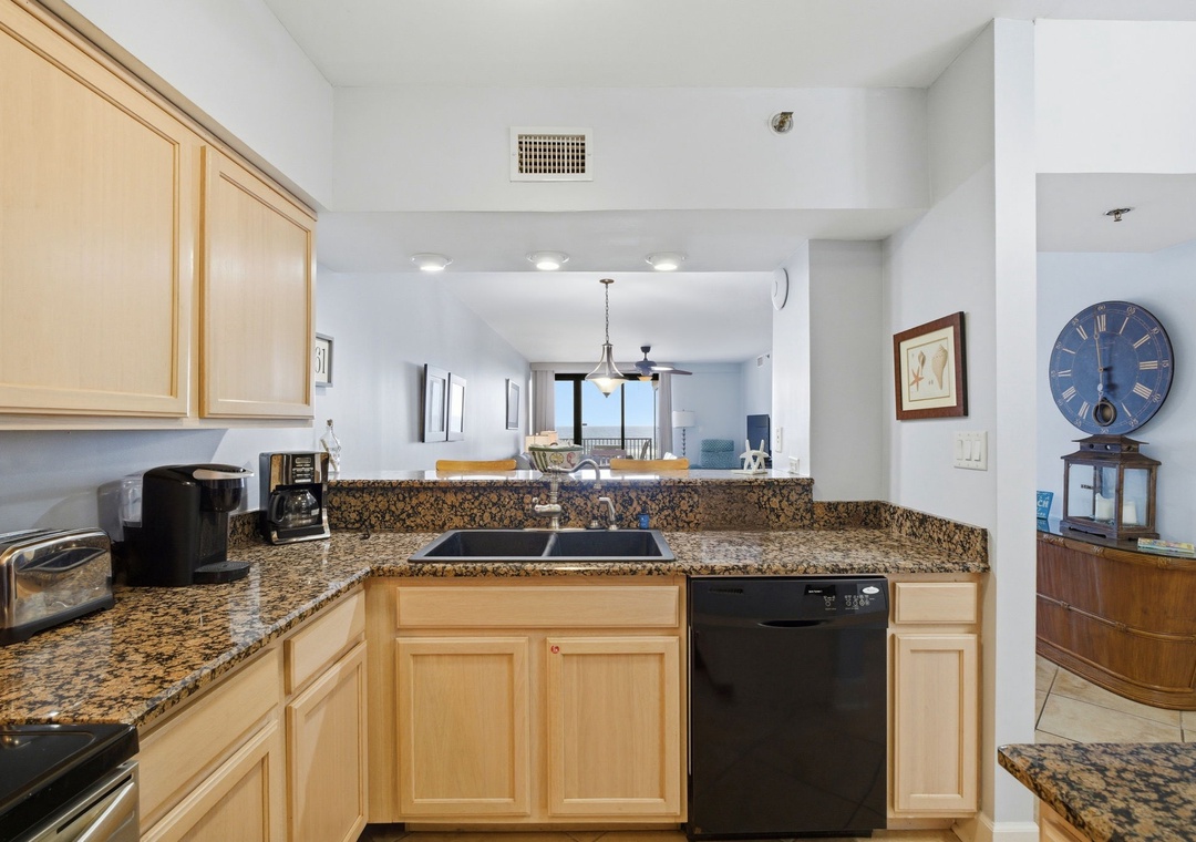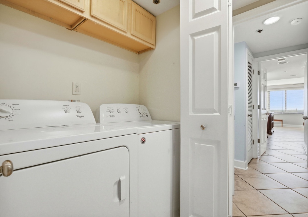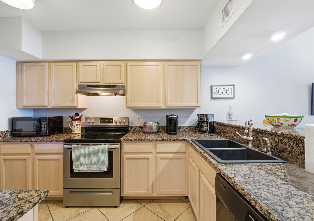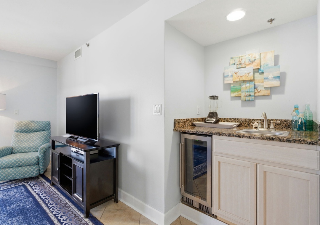 The impressive master suite boasts a queen bed with luxurious linens and a premium mattress, and an LCD television with DVD player. The oversized attached master bath offers a large jetted tub, a separate glass walk-in shower, and his and her vanities. You’ll definitely indulge in some much needed relaxation in this master retreat! The second bedroom is elegantly appointed with two twin beds and luxury bedding, an LCD television and an attached bath. This luxury unit also features a full size high efficiency front loading washer and dryer. You get all of the conveniences of a larger condo without the large price tag! Book your vacation today!