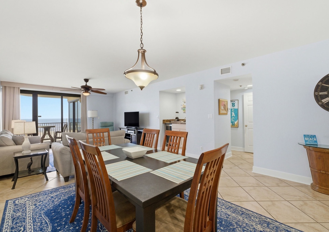 The kitchen is equipped with everything you’ll need to create the perfect meal, including upgraded appliances, a breakfast bar and all the small appliances and utensils necessary to get cooking! The dining area features a beautiful wood table with seating for 6.