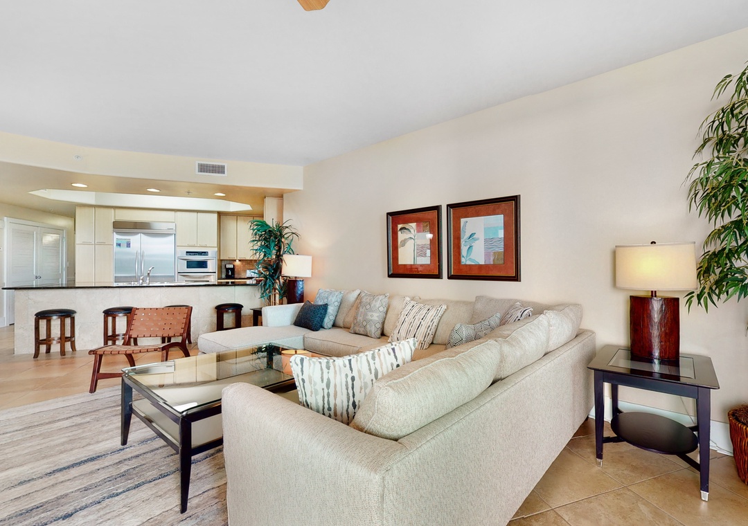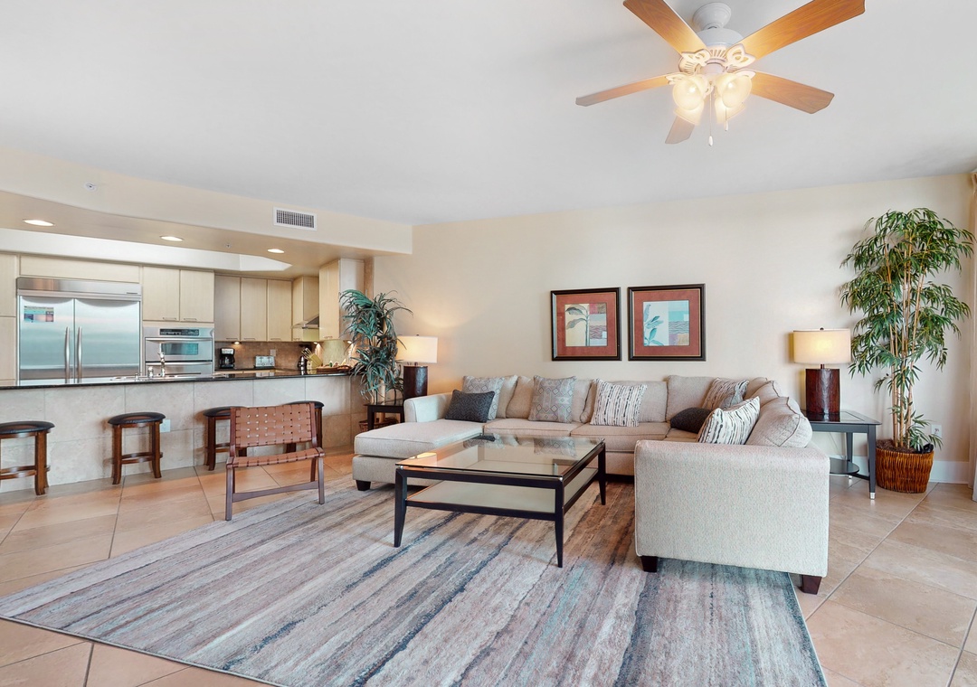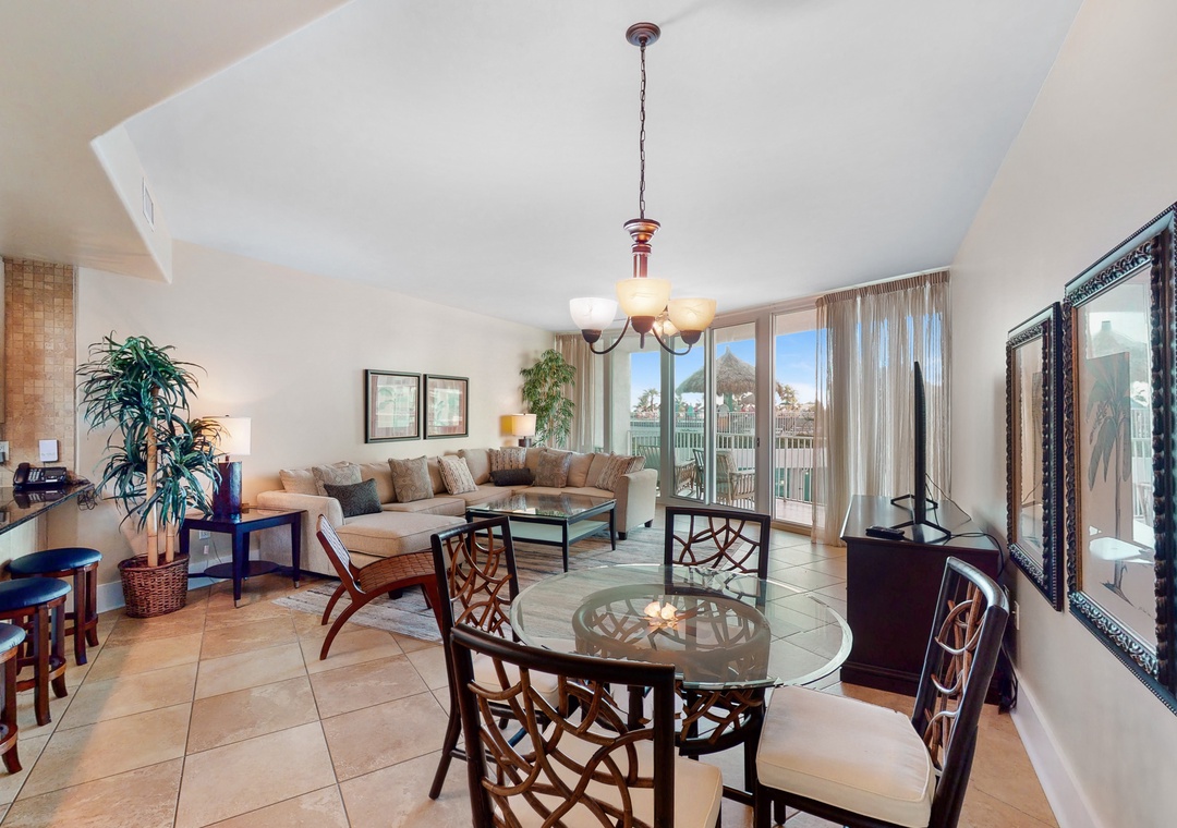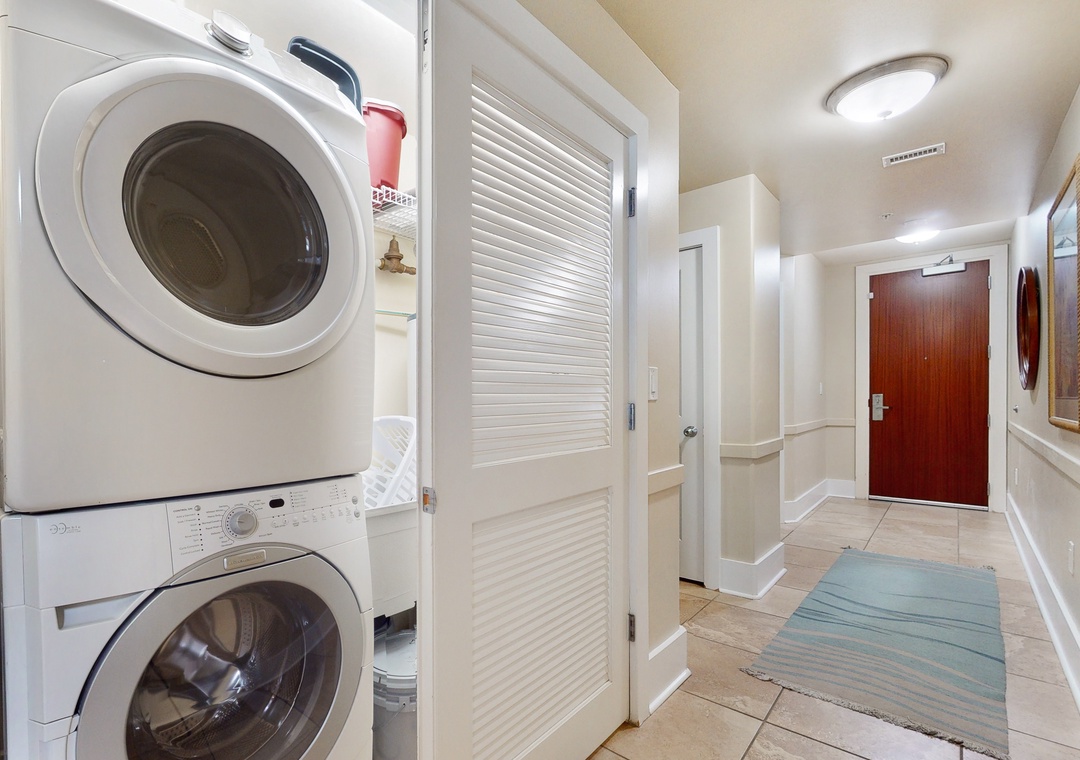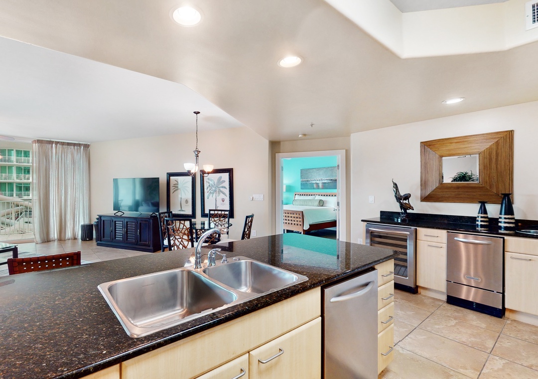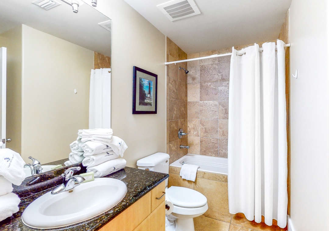 The impressive master suite boasts a king bed with luxurious linens and a premium mattress and an attached bath. The second bedroom offers a queen bed, and the living room sofa can be converted into a queen sleeper, affording comfortable accommodations for up to 6 throughout! Additional unit features include a full size washer and dryer, plush 100% oversize bath towel sets.