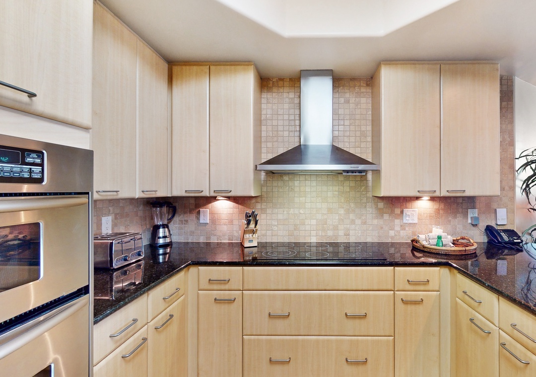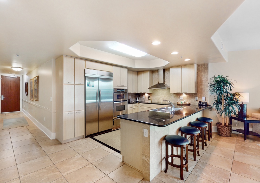The gourmet kitchen features granite countertops, custom cabinetry, stainless steel appliances including a side by side fridge with ice dispenser, plus all the cookware, dishware, utensils and small appliances needed to prepare a culinary masterpiece. Eat breakfast at the bar right off the kitchen with seating for 4 guests on stools and enjoy your supper while watching the sky change from tranquil blue to fiery pink from your gorgeous wooden dining room table with enough room to seat 4 as well!