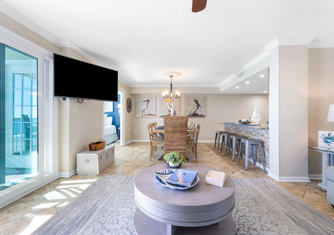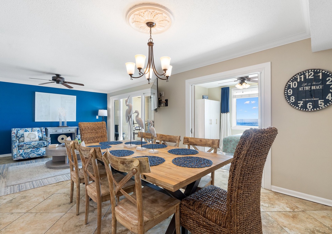 This memory maker is a LARGE updated 5th floor BEACH FRONT unit with STUNNING GULF VIEWS and walking distance to many restaurants, shops and other attractions. Your whole group will enjoy being just steps from The Hangout, Sea ‘n Suds, the sugary white beach, the indoor/outdoor pool, or just watching dolphins from the fabulous balcony. This one has it all so come join us at “LIVING COASTAL”.