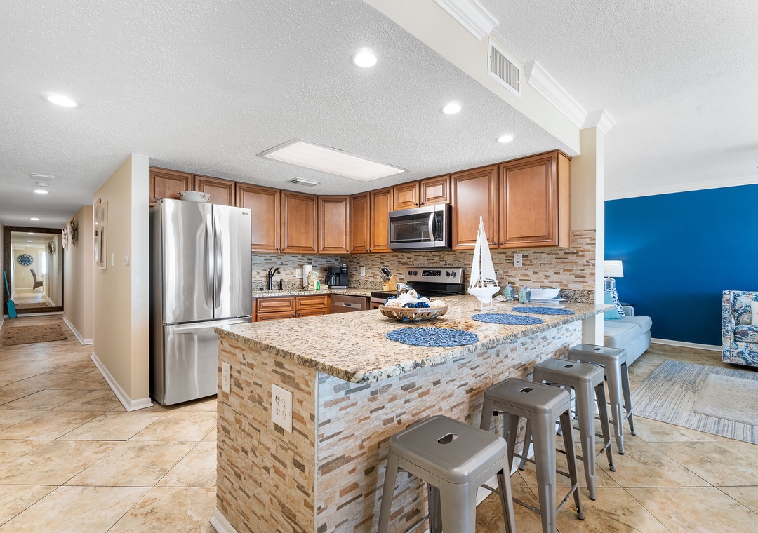 This updated amazing unit offers stunning Gulf of Mexico in this 4BR/2BA condo with 1800 ft.² of luxury, elegance and comfort that has been professionally decorated in coastal decor. Relax or play on the sugary white sands of the private beach that is only steps away where you will always have a front row seat. This updated large concept layout, direct beach access, close proximity to restaurants and attractions make this a dream vacation and will definitely exceed your expectations! Enjoy your morning sunrise cup of coffee or evening sunset glass of wine with this breathtaking balcony view, or just relax and listen to the waves. Bring the whole family to this large 4BR condo and add to your beach getaway with in-unit cards, games, puzzles, tic-tac-toe, and beach Monopoly in the evening after making memories on the amazing beaches of the Gulf of Mexico. You will feel like this condo is your “home away from home“ and you will want to bring your family and friends back year after year. This complex is walking distance to the best shopping, restaurants and attractions, including The Hang Out, Sea ‘n Suds, Island Pancake House and the Gulf State Park & Pier. Walk to the perfect spot to enjoy an outdoor lunch, an evening of nightlife or concert. This unit is close to the pool, with a pool view from the balcony, and just steps to the ocean. It comfortably sleeps 10 and has an in-unit washer and dryer. Book “Living Coastal” at Castaways D5 now for a vacation of a lifetime!!