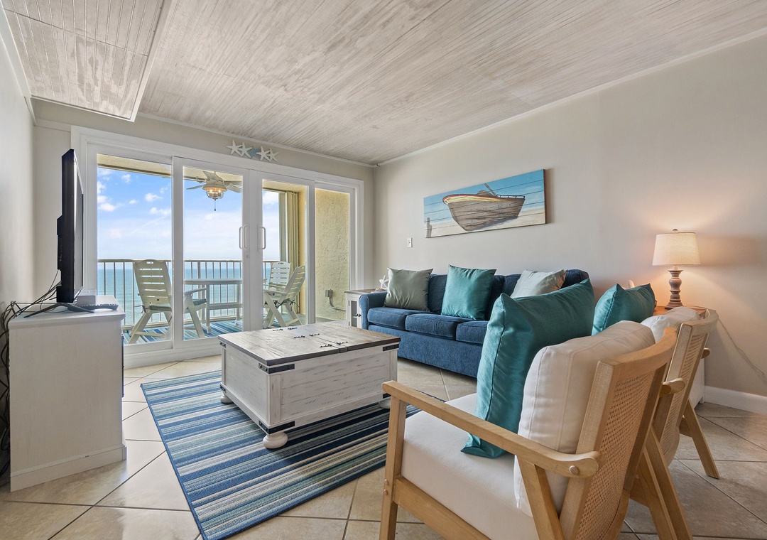 Welcome to Castaways 7B, your 7th-floor beachfront escape in the heart of Gulf Shores! This 2-bedroom, 2-bath condo sleeps up to 6 guests and combines updated furnishings with sweeping Gulf views. The bright, open-concept living space includes a comfy sofa bed, a large flat-screen TV, and direct access to your private balcony—perfect for sipping coffee at sunrise or unwinding with a cocktail at sunset.
