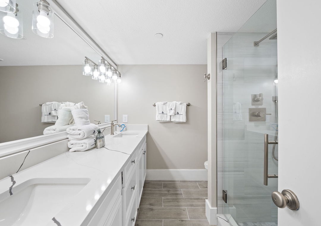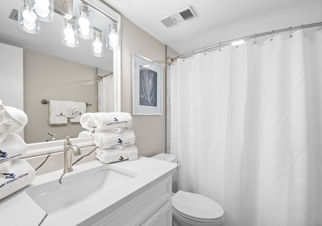 Retire after a long day of recreation to one of 2 luxuriously appointed bedrooms and catch some serious zzz’s! With premium mattress sets, high thread-count linens and posh bedding, you’re sure to enjoy quality rest and relaxation during your much-deserved beach getaway. Pamper yourself after a day on the beach in the master’s glamour bath, complete with plenty of counter and cabinet space and plush oversize 100% cotton bath towel sets! The living room sofa can be converted into a queen sleeper, affording comfortable accommodations for 6 throughout.