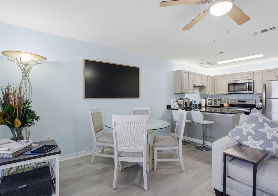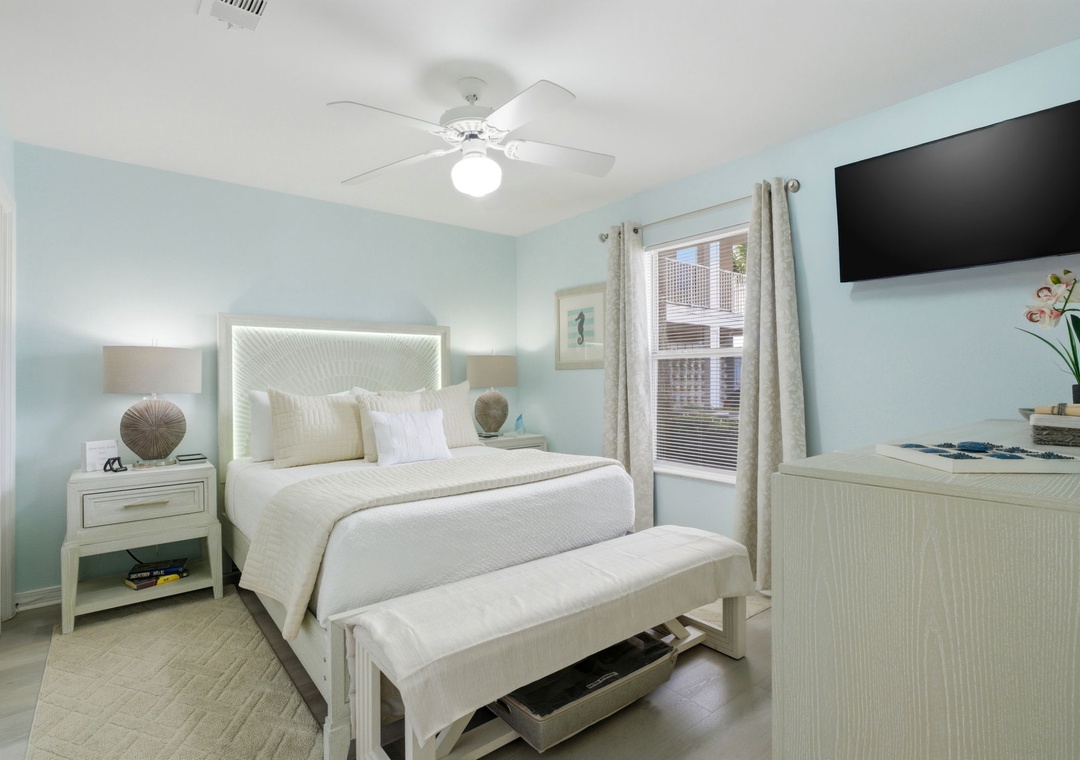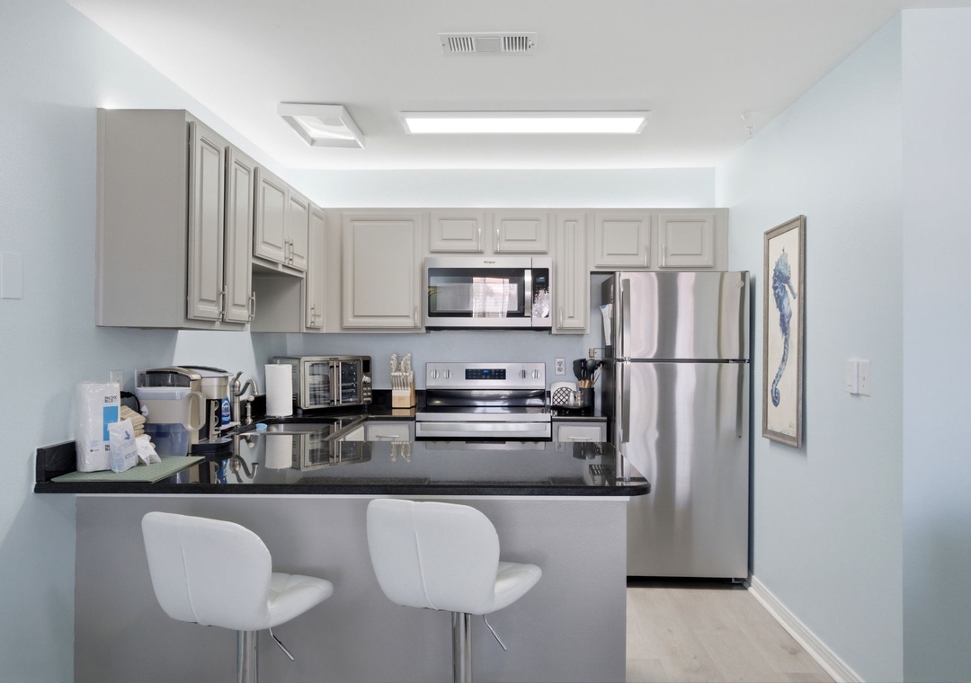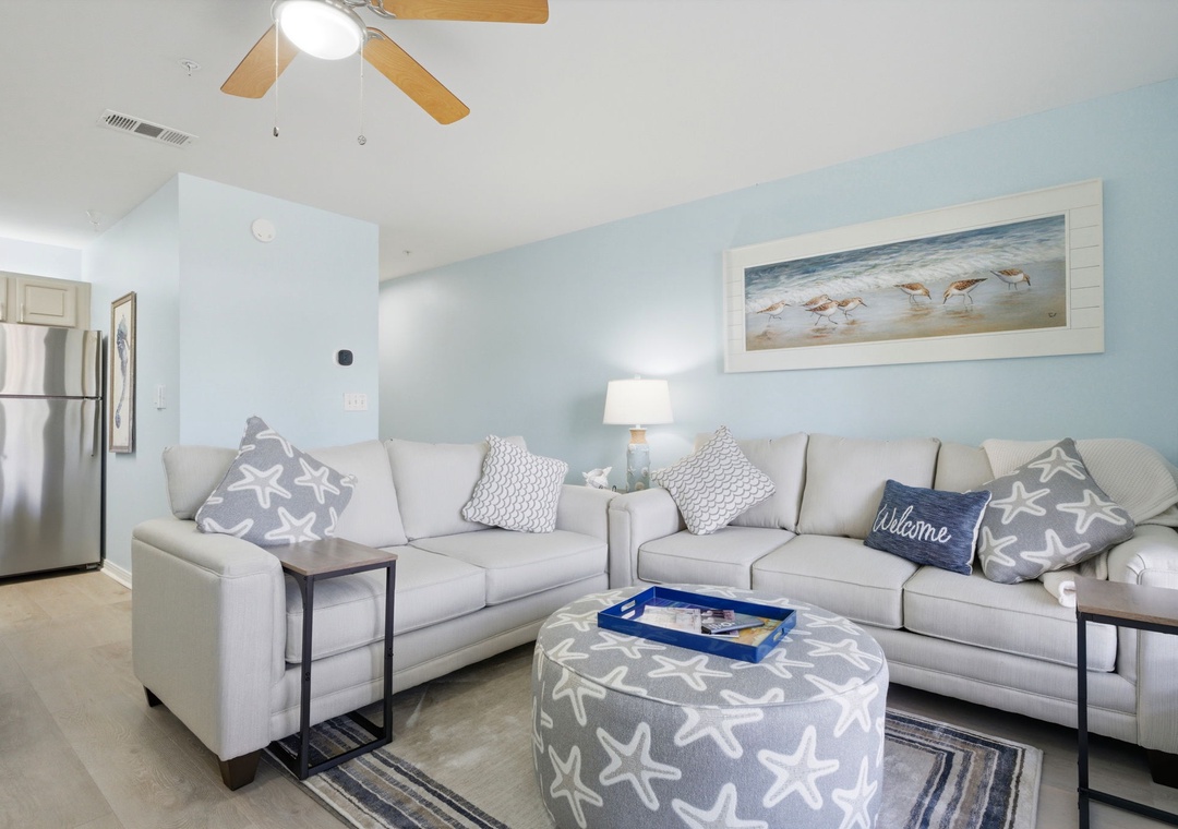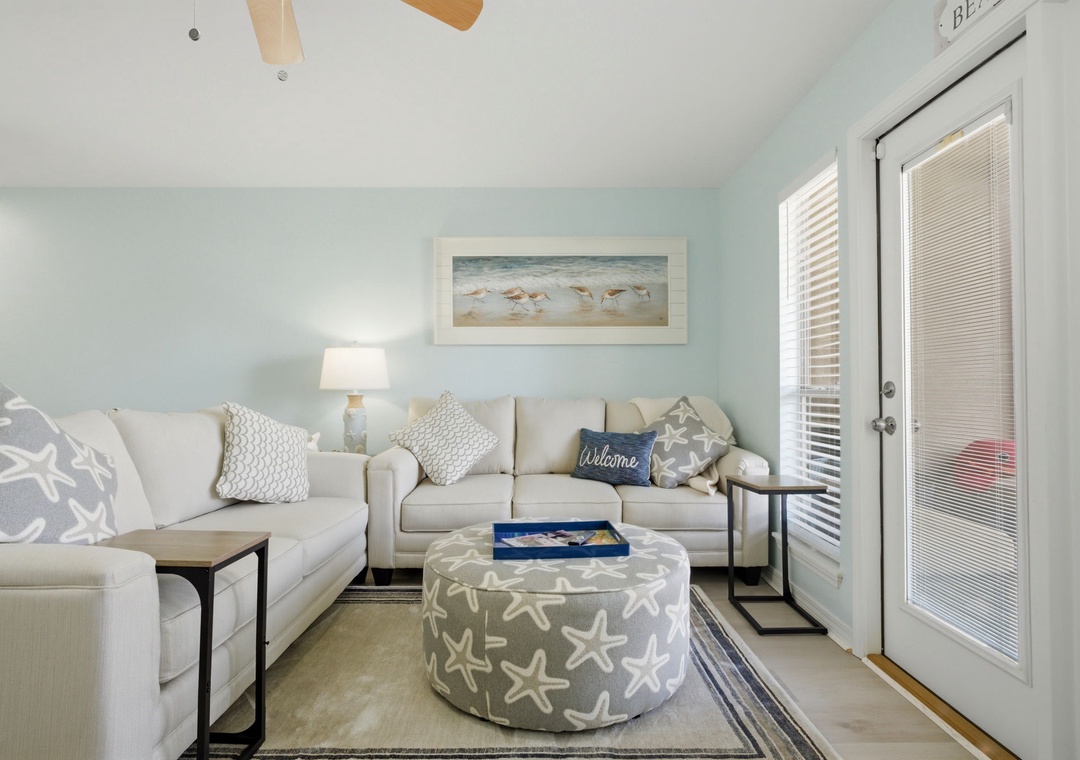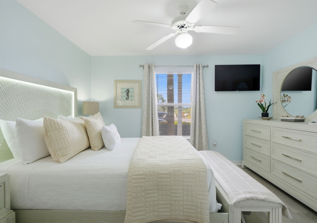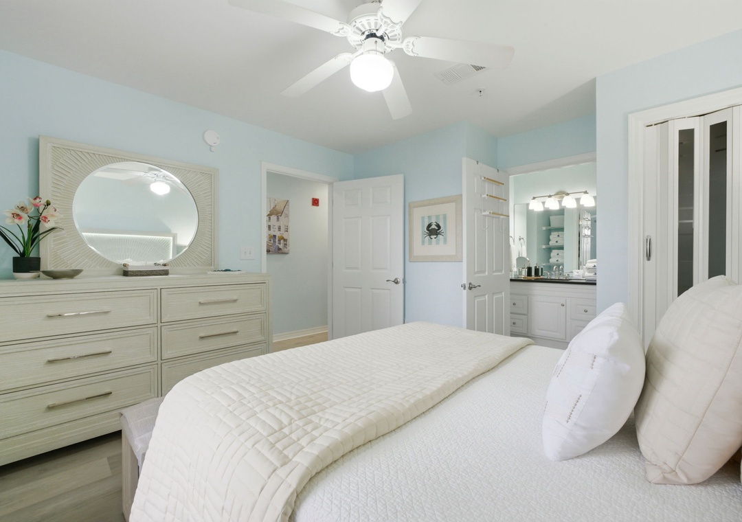 The spacious primary bedroom features a comfortable queen-size bed with cozy linens, creating the perfect place to unwind after a day at the beach. The fully stocked kitchen has everything a chef needs, whether you're preparing a quick breakfast before heading out or cooking a full meal to enjoy after sunset.