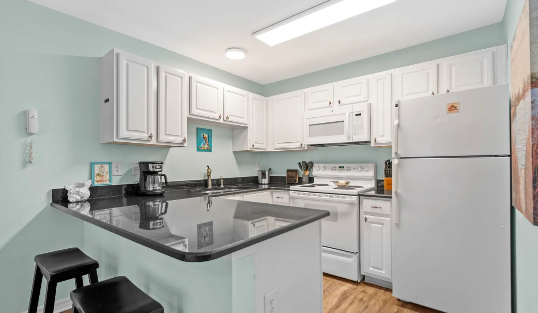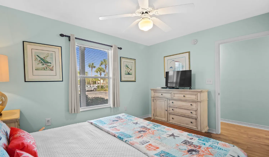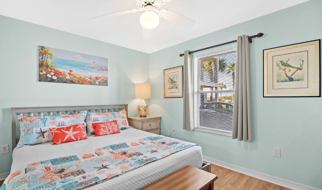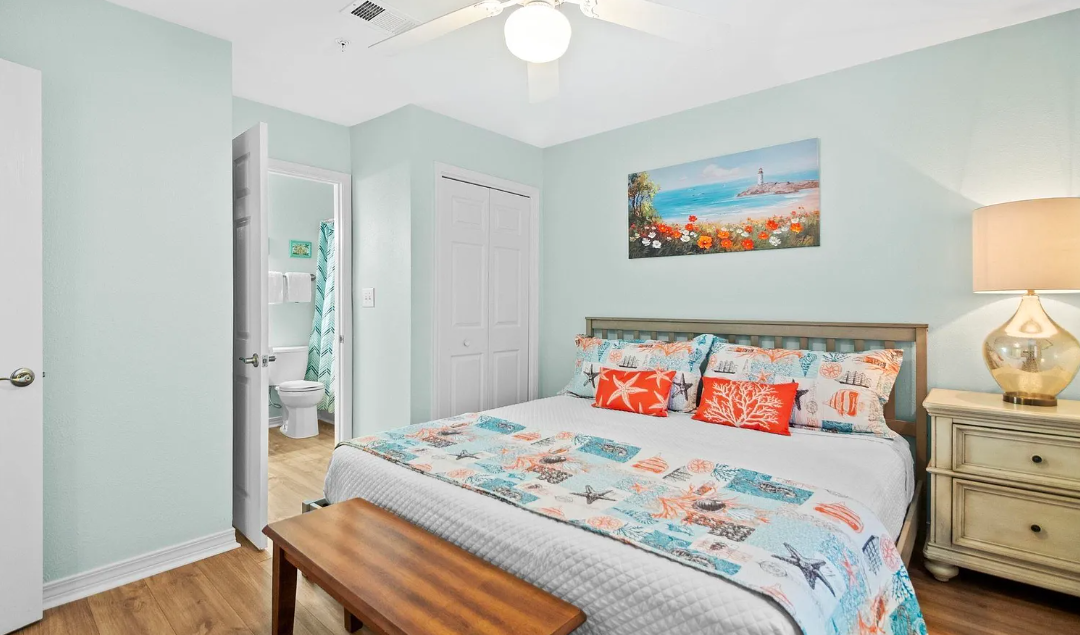 The spacious primary bedroom features a comfortable king-size bed with cozy linens, creating the perfect place to unwind after a day at the beach. The fully stocked kitchen has everything a chef needs, whether you're preparing a quick breakfast before heading out or cooking a full meal to enjoy after sunset.