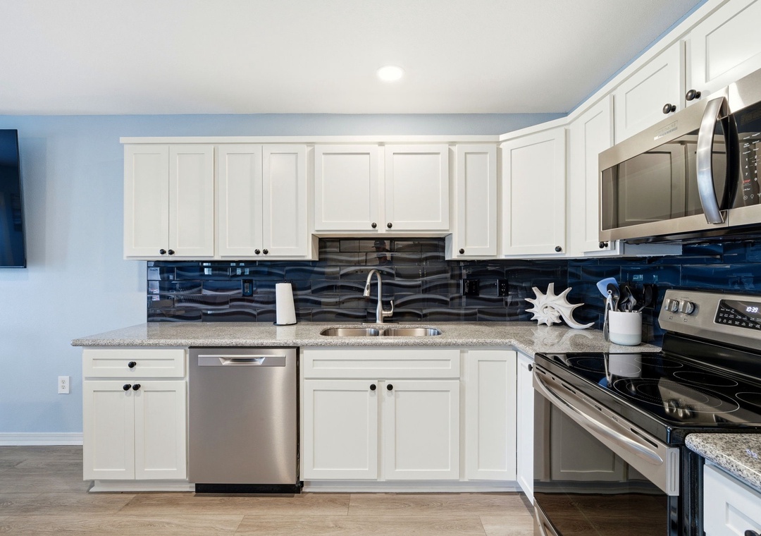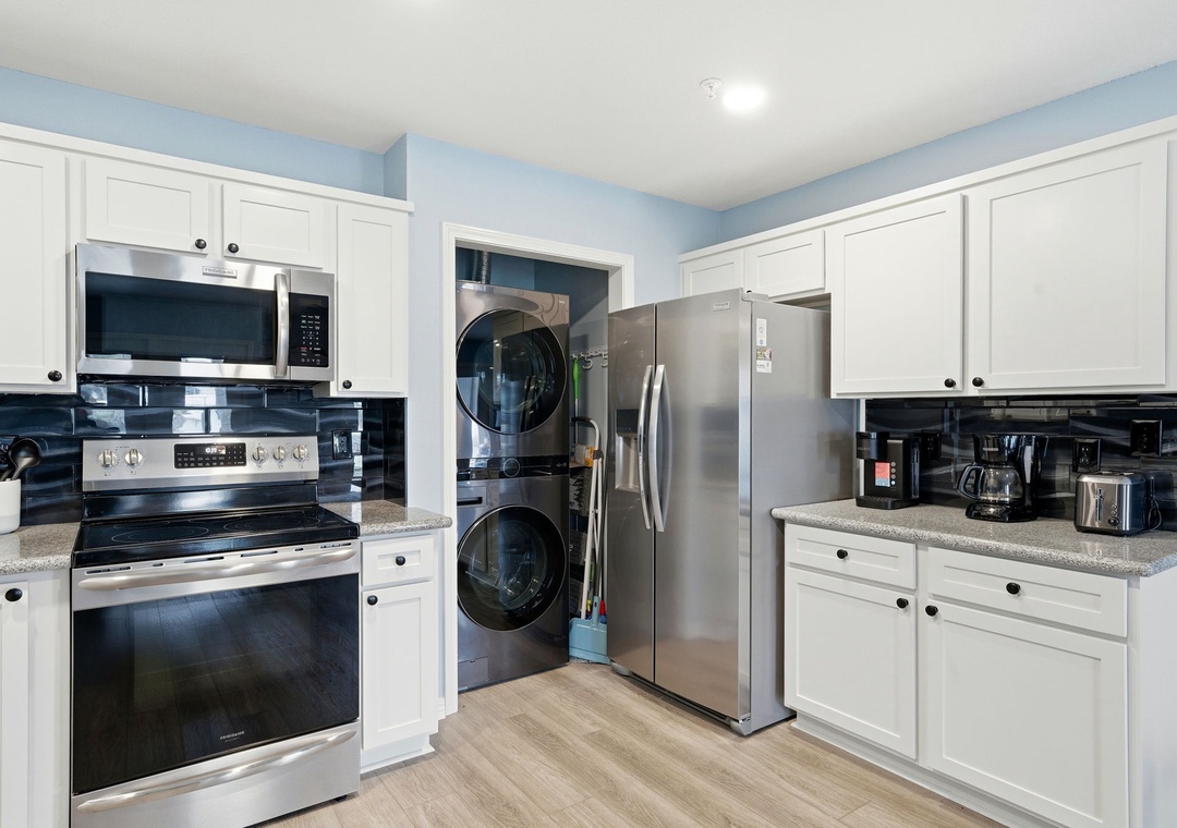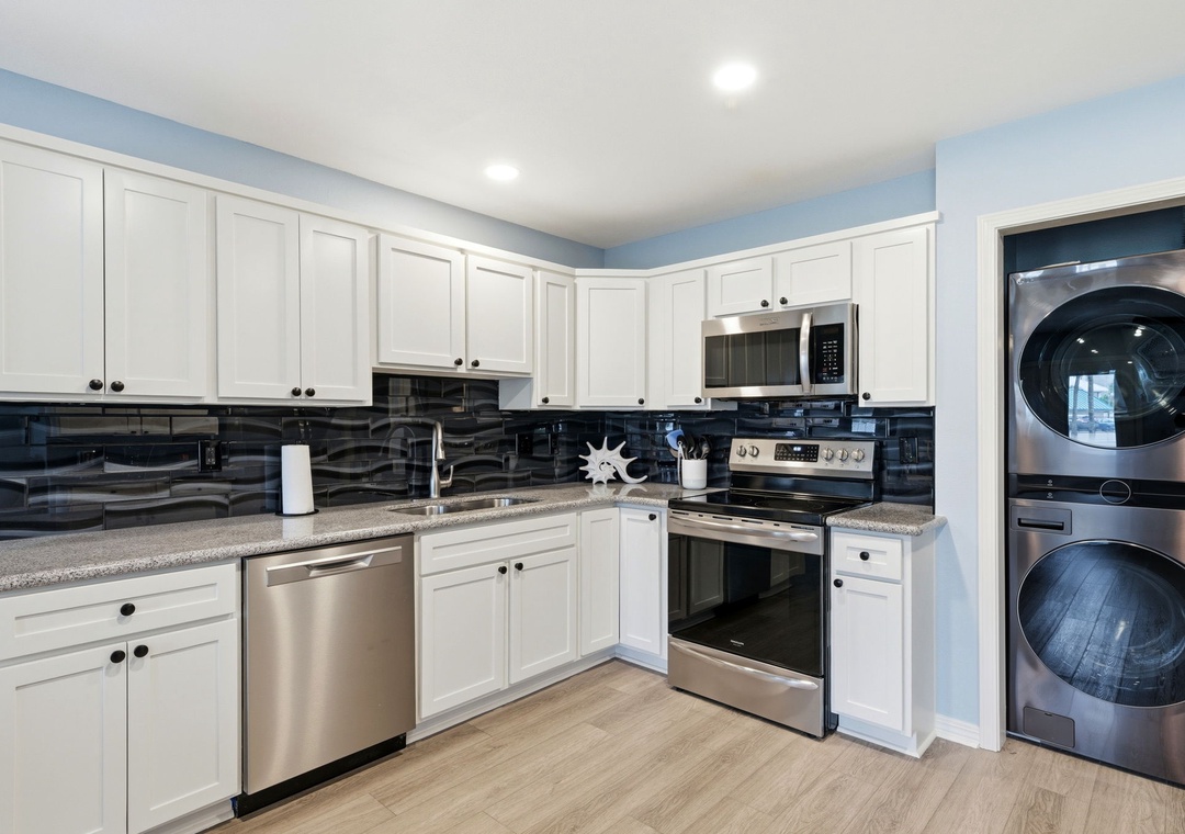 The well-equipped full-size kitchen features all brand new stainless steel appliances plus all the cookware, dishware, and utensils needed to prepare your favorite meal. This kitchen is equipped with a Mr. Coffee and a Keurig for your preference. You can choose to eat your breakfast outside to enjoy the oversized back porch. Additionally, the unit features a new stackable washer and dryer, as well as an outdoor storage chest stocked with beach supplies. These items include two beach chairs, tanning chairs, beach umbrella sand toys and a beach cart for transportation.