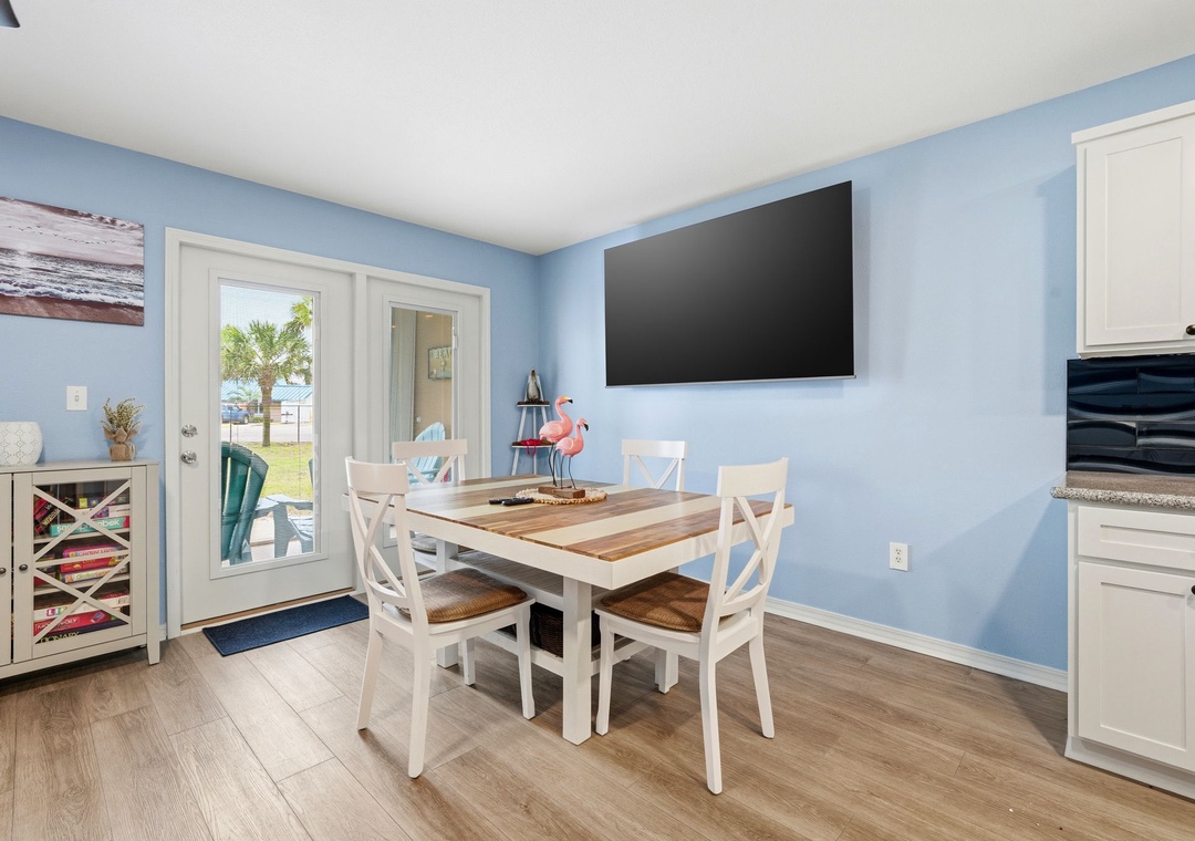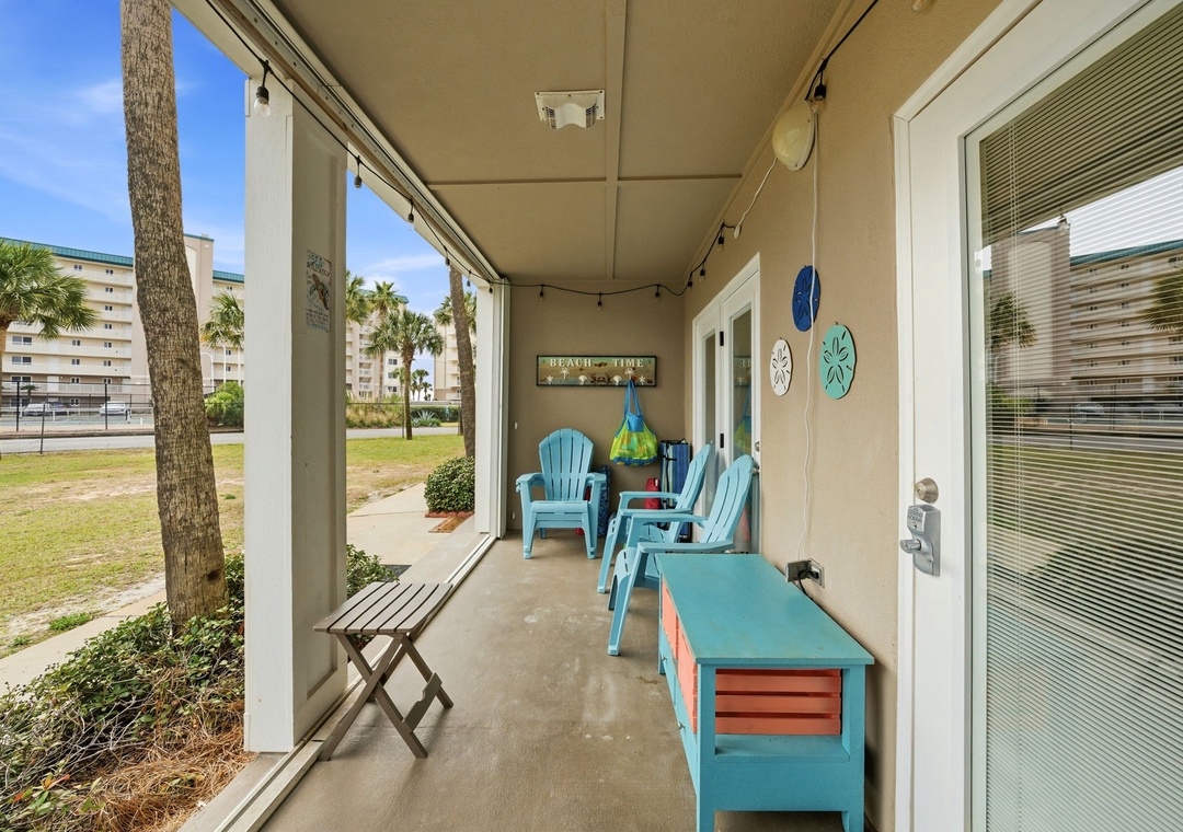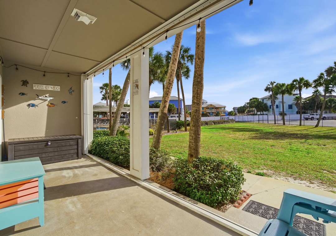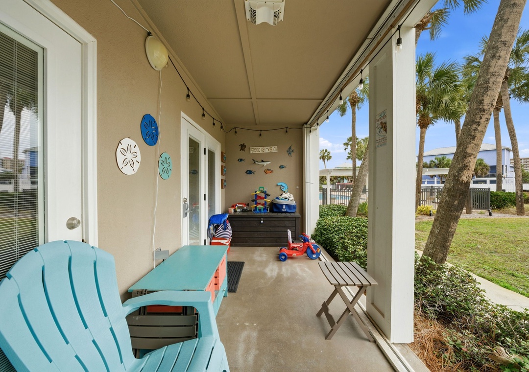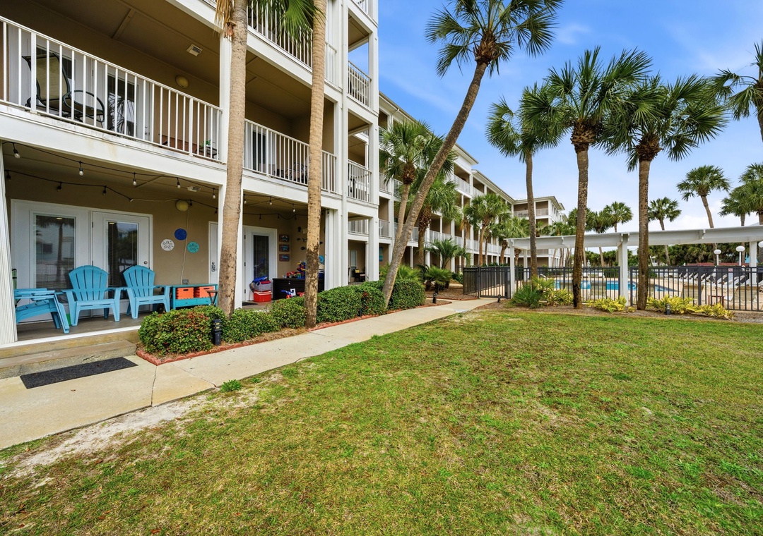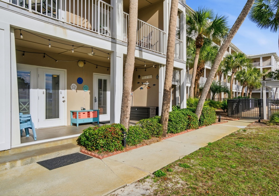 You can also enjoy the community pool with hot tub, outdoor grills and picnic tables. This resort also offers outdoor showers and a water hose for washing off beach equipment. This condo is in a gated community, a code is needed to enter and exit the resort. To get to the beach exit the door of the back porch, take the pathway to the back gate, and you’re just steps away from the beach.