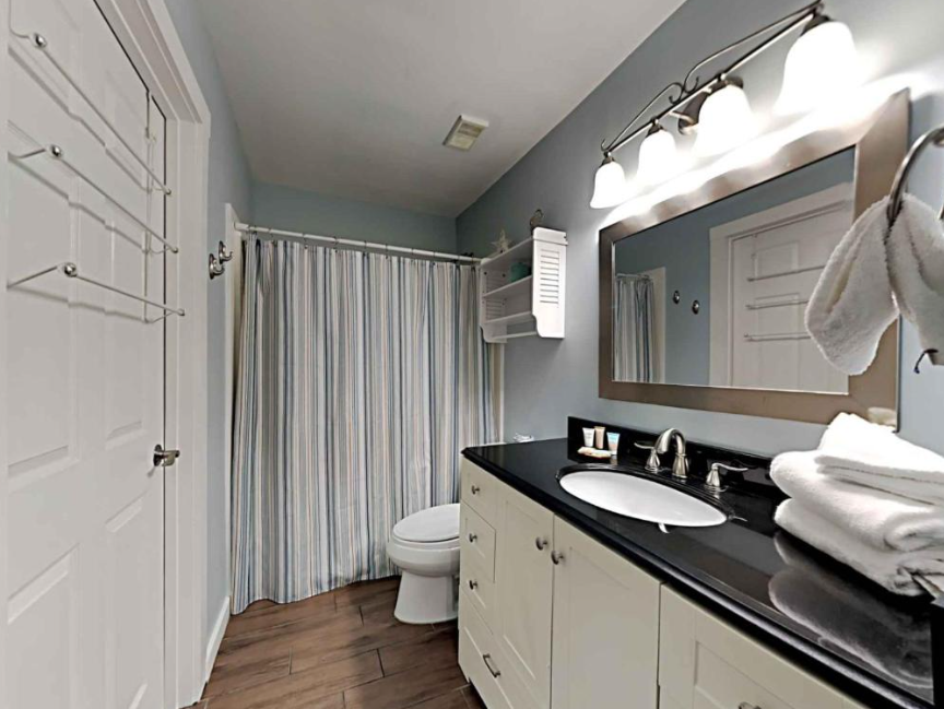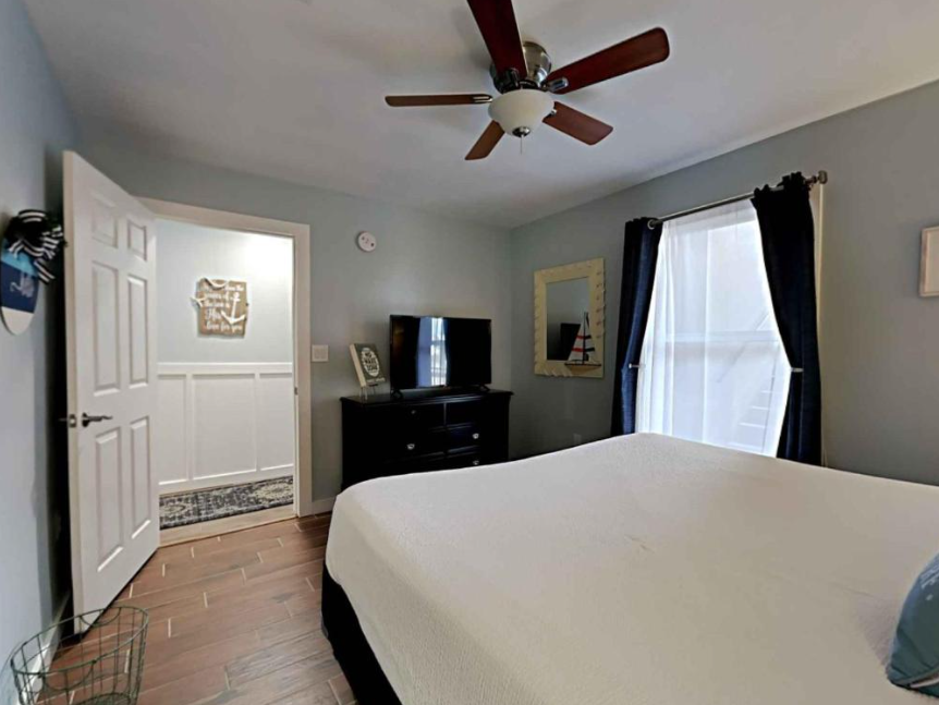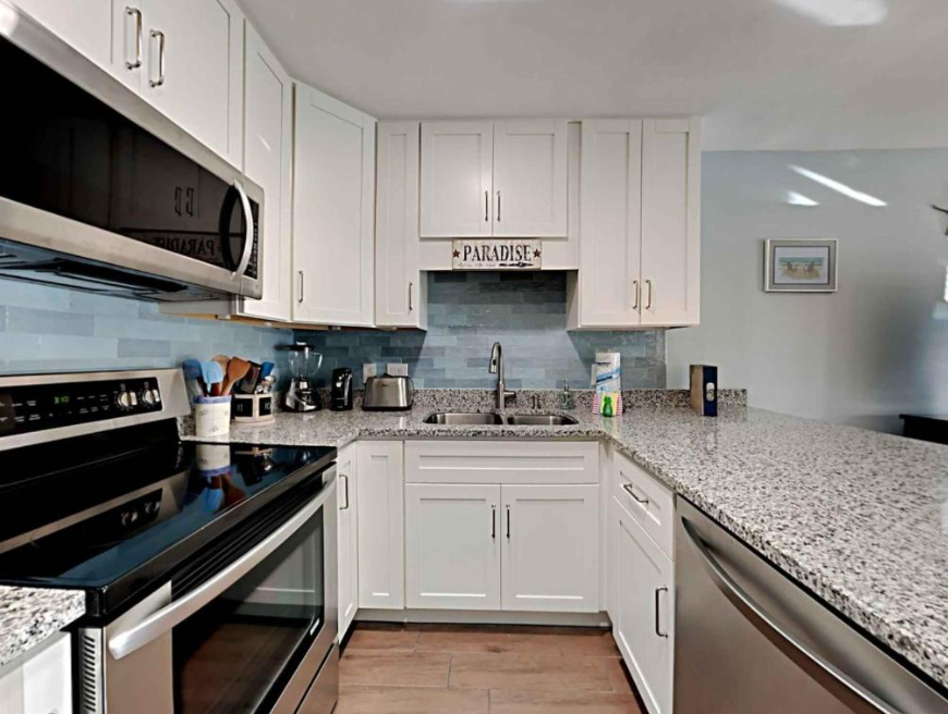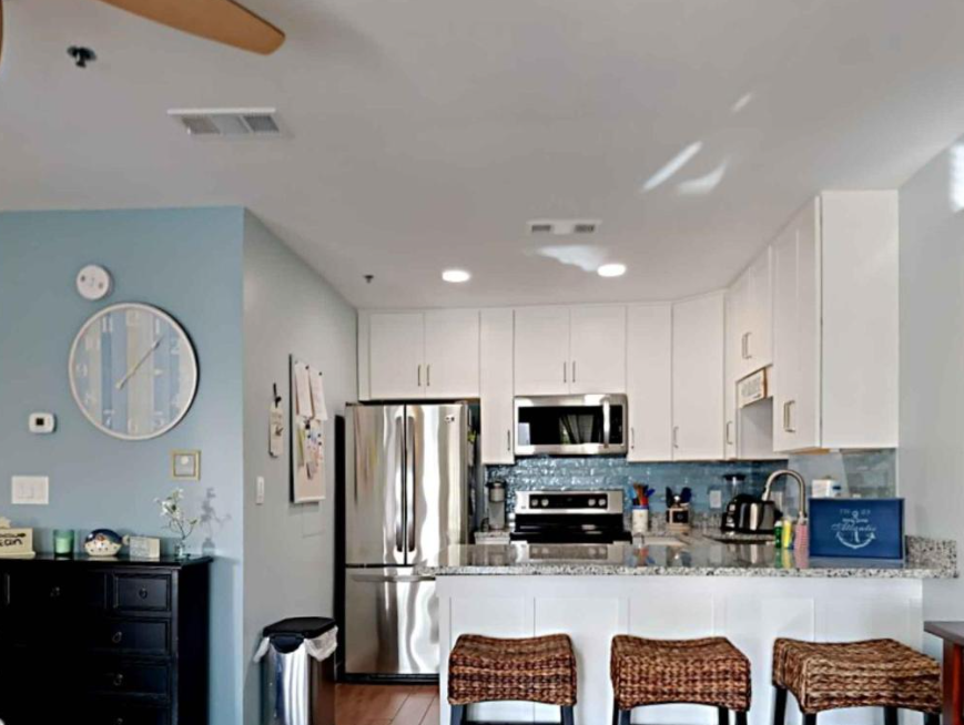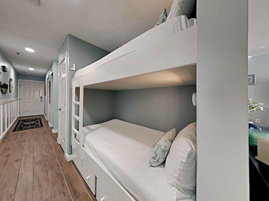 The primary bedroom boasts a King bed with luxurious linens and a premium mattress. There is a twin size bunk bed in the hallway alcove, accommodating up to 4 guests. Additional unit features include a stackable washer and dryer, plush 100% oversize bath towel sets.