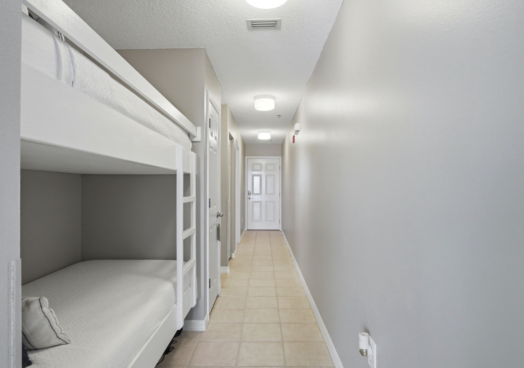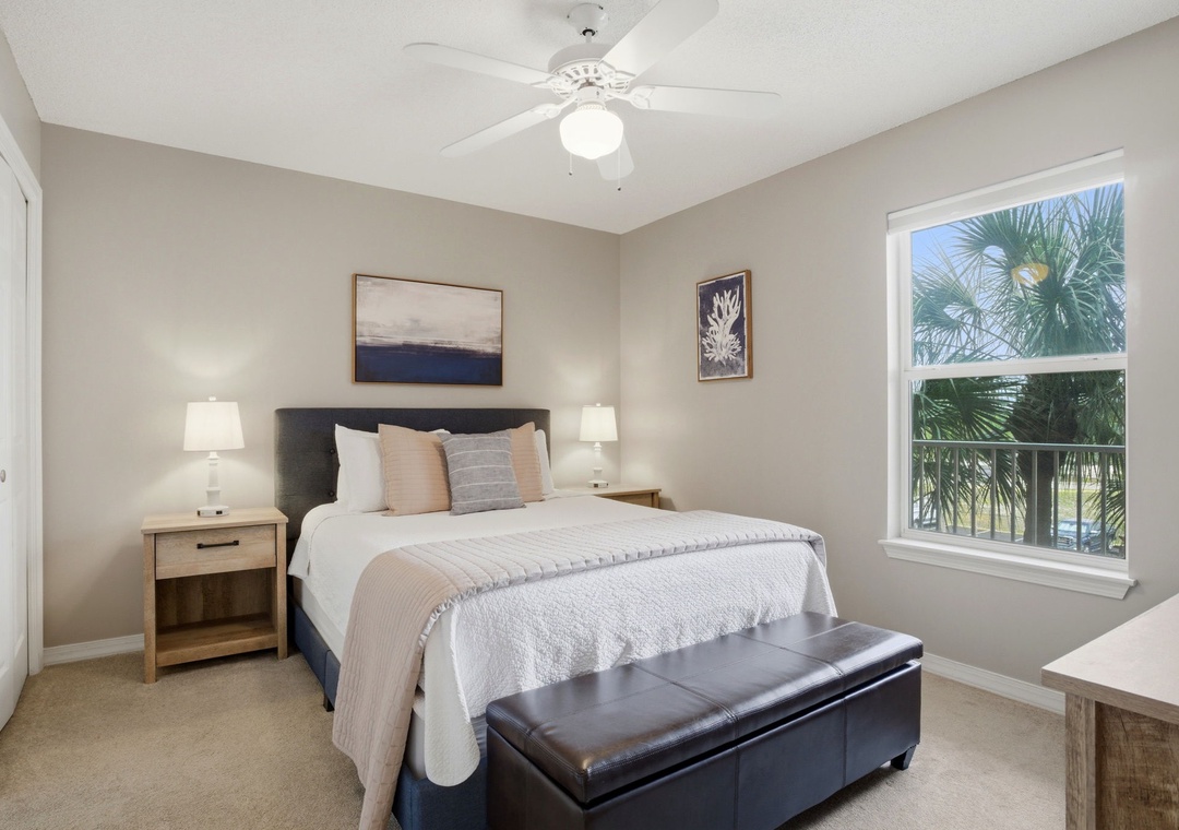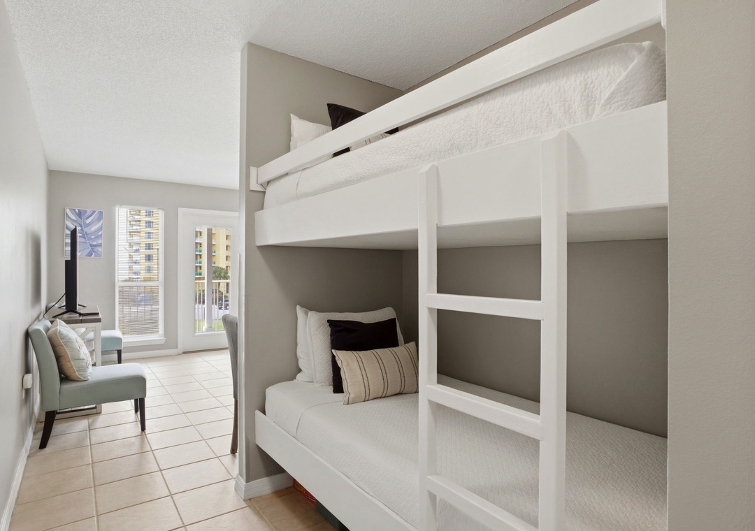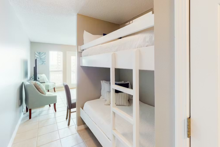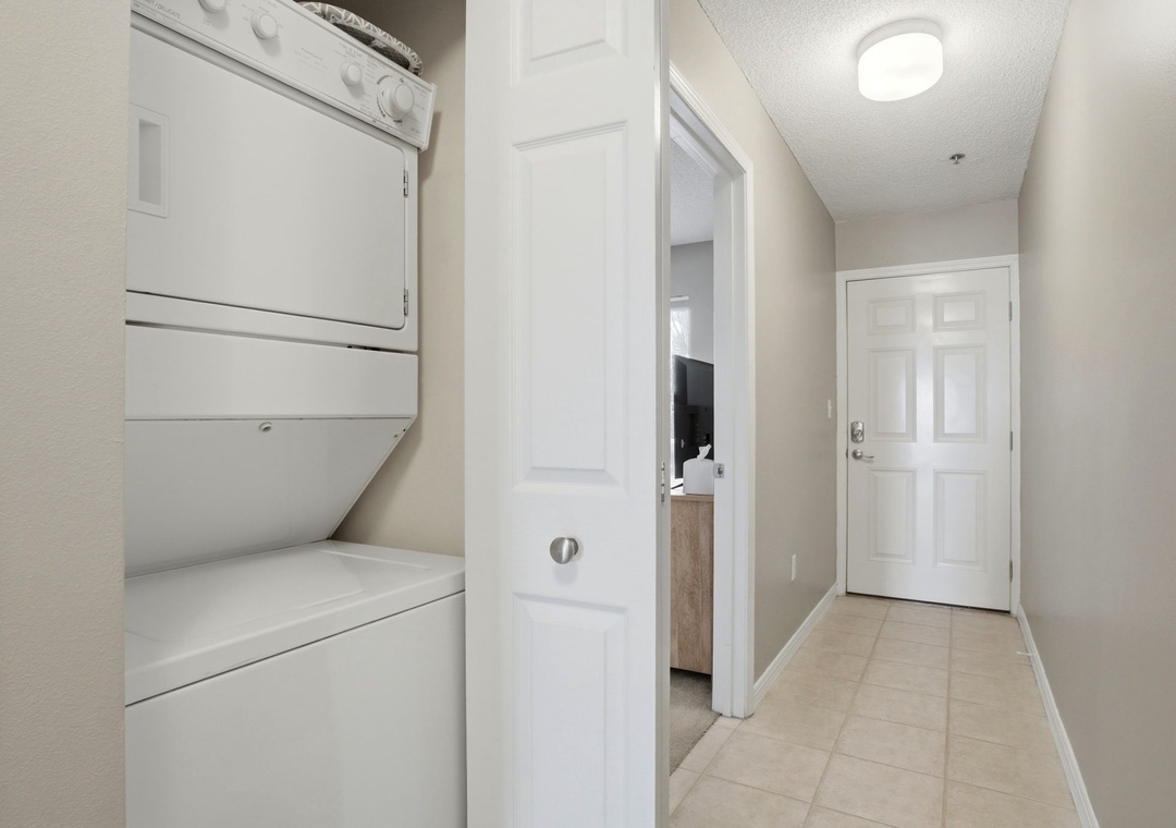 The master bedroom boasts a queen bed with luxurious linens and a premium mattress. There is a twin bunk alcove in the hallway and the living room includes a queen sleeper sofa, which accommodates enough sleeping room for up to 6 guests! Additional unit features include a stackable washer and dryer, plush 100% oversize bath towel sets.