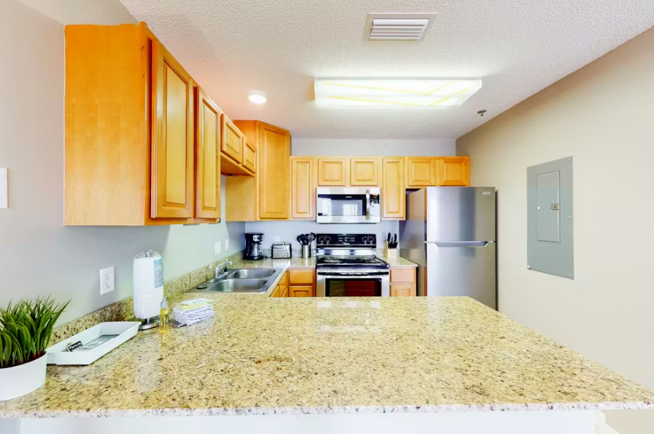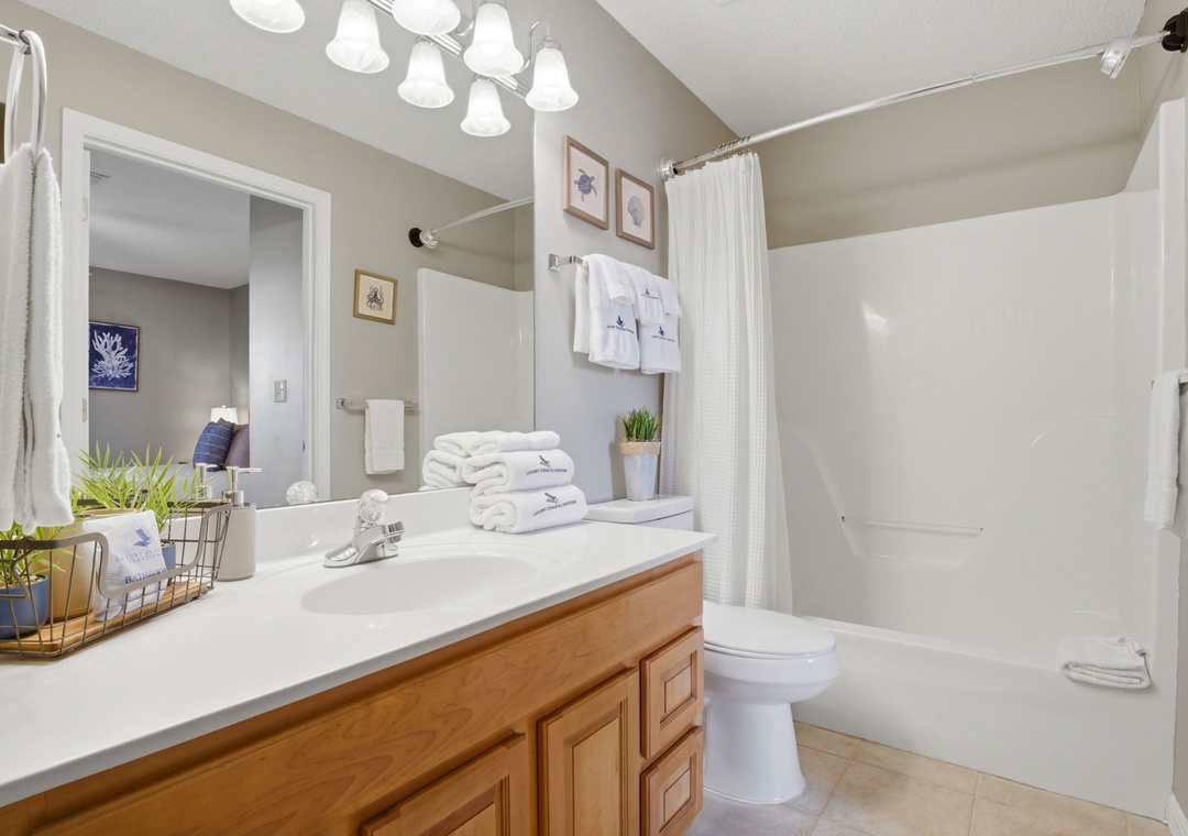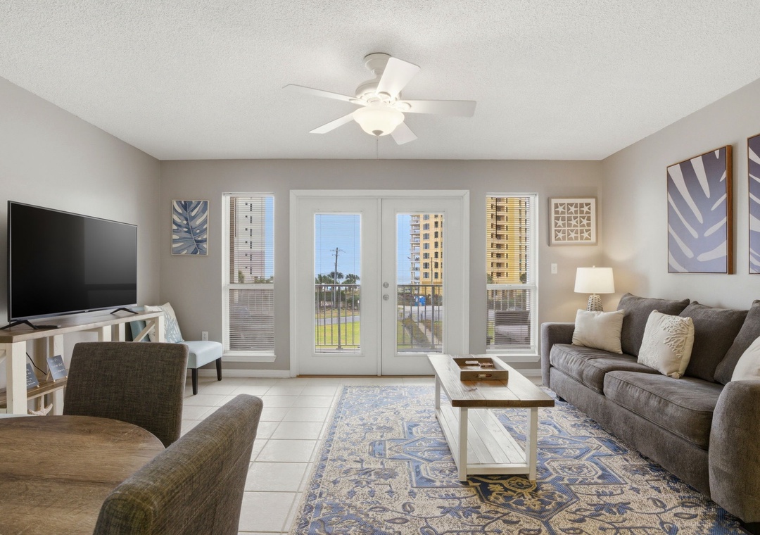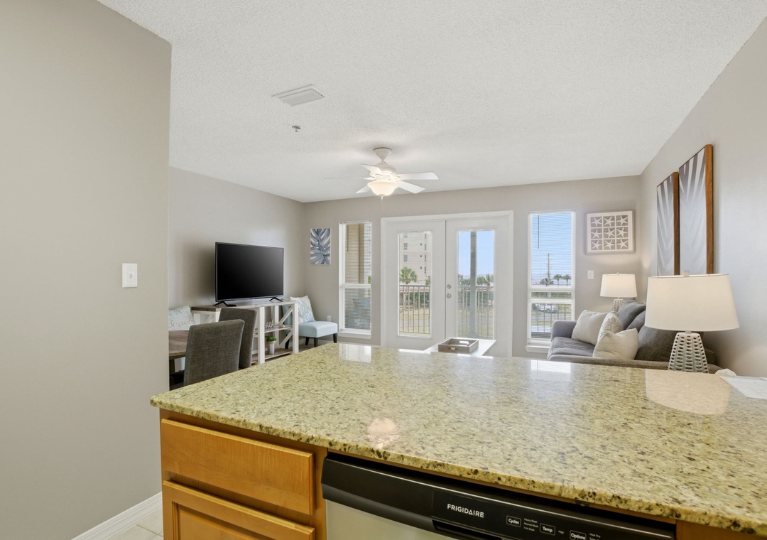 The master bedroom boasts a queen bed with luxurious linens and a premium mattress. There is a twin bunk alcove in the hallway and the living room includes a queen sleeper sofa, which accommodates enough sleeping room for up to 6 guests! Additional unit features include a stackable washer and dryer, plush 100% oversize bath towel sets.