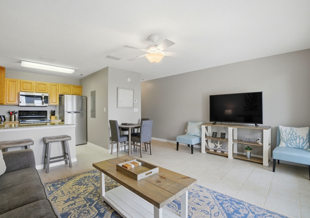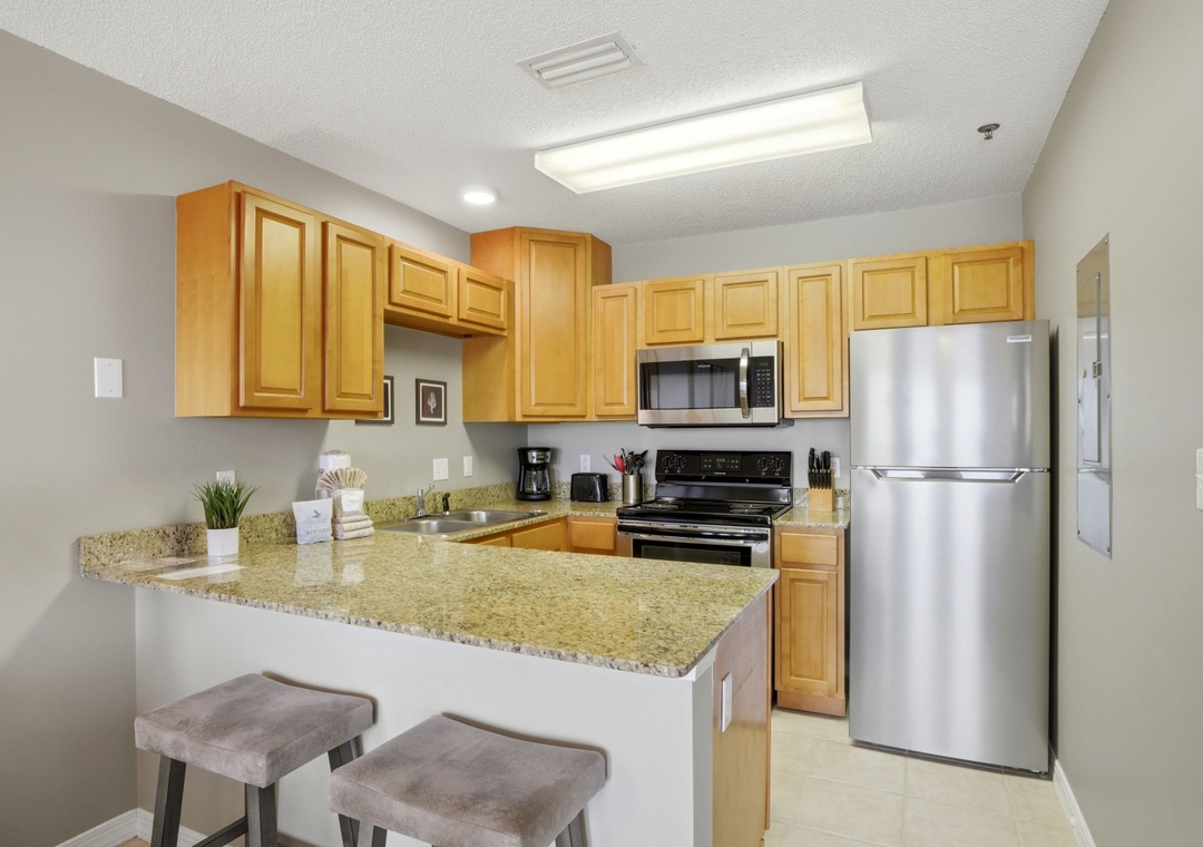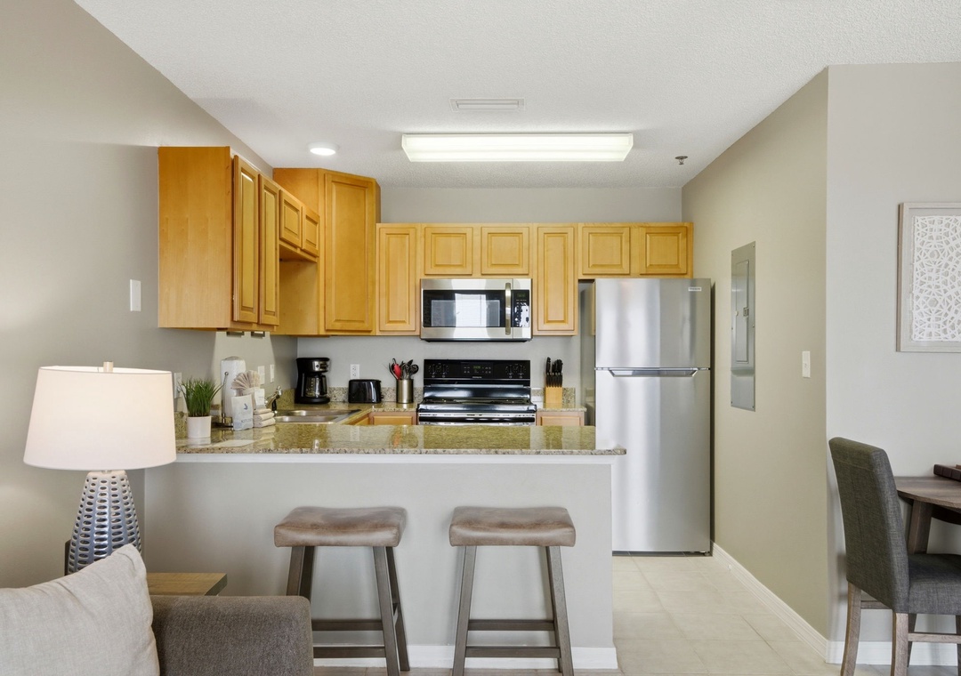 The full size kitchen features large and small appliances plus all the cookware, dishware, and utensils needed to prepare a culinary masterpiece. Eat breakfast at the bar right off the kitchen and enjoy your supper from the dining table which can accommodate 4.