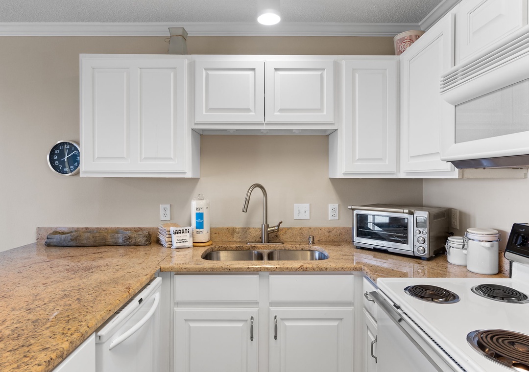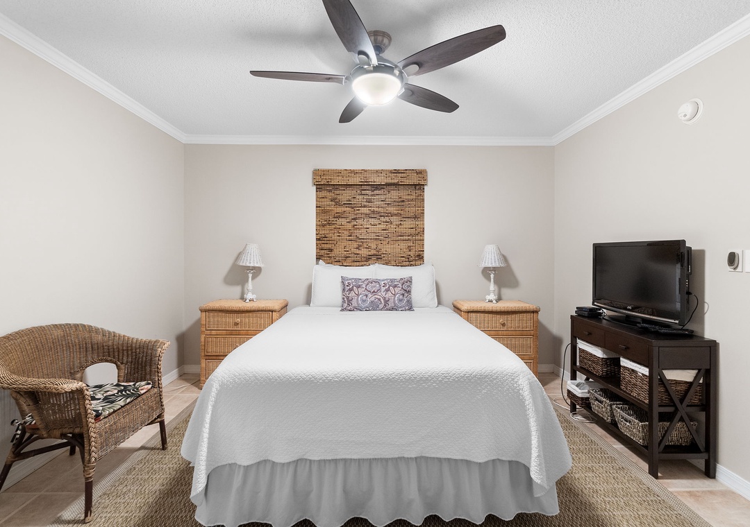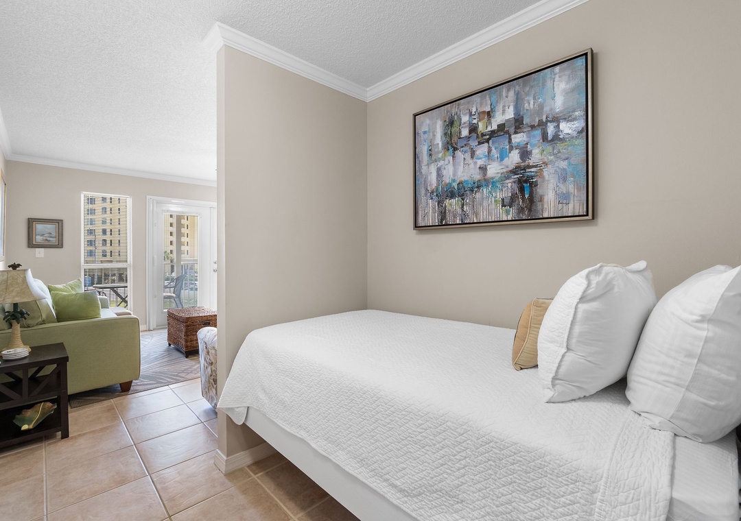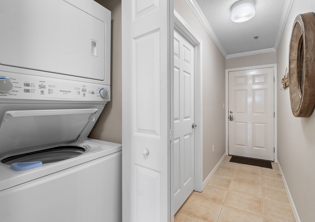 The master bedroom boasts a queen bed with luxurious linens and a premium mattress. There is a twin size bed in the hallway alcove and the living room includes a queen sleeper sofa, which accommodates enough sleeping room for up to 5 guests! Additional unit features include a stackable washer and dryer, plush 100% oversize bath towel sets.