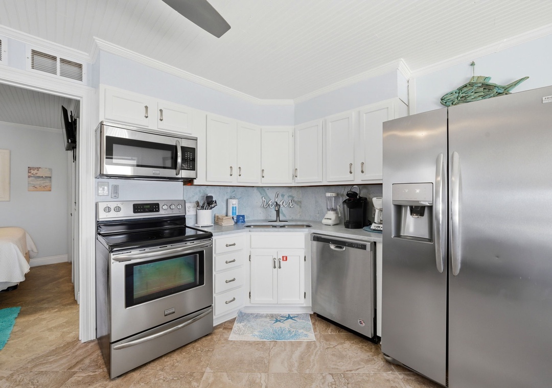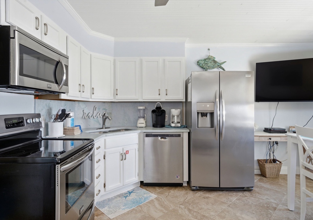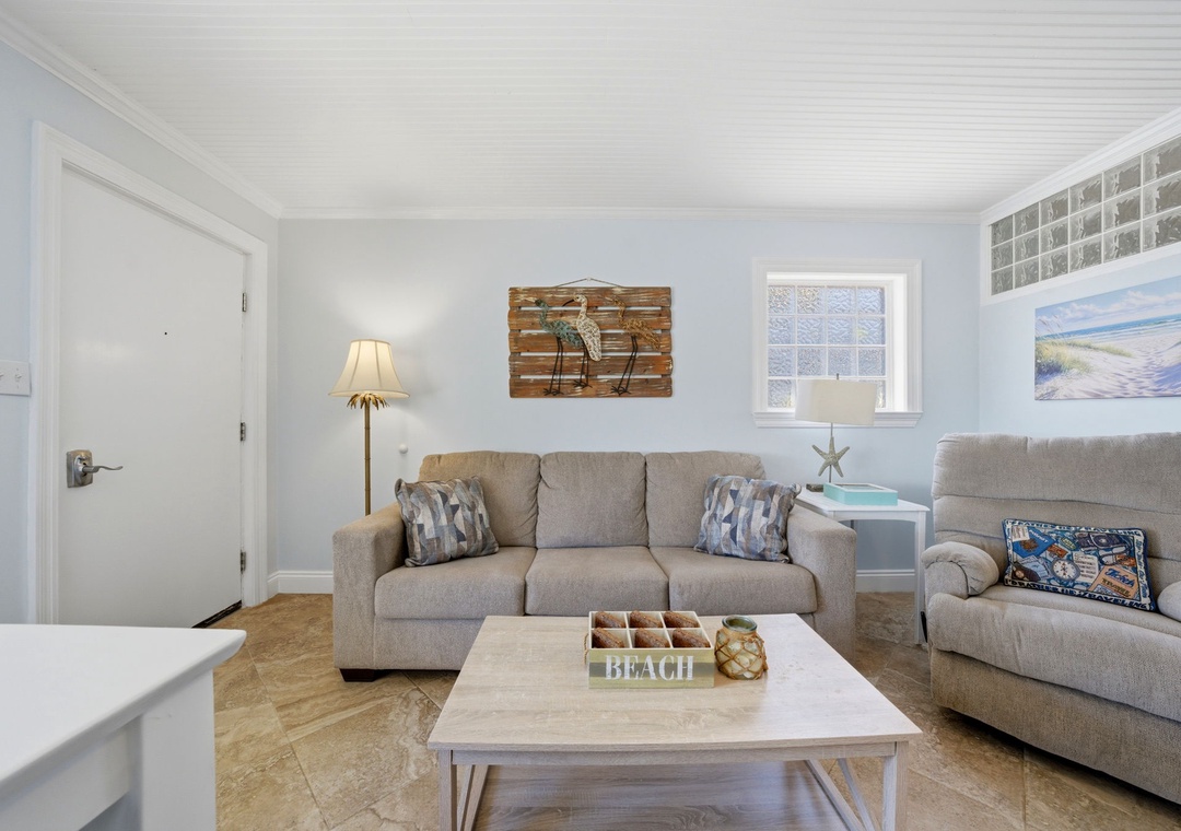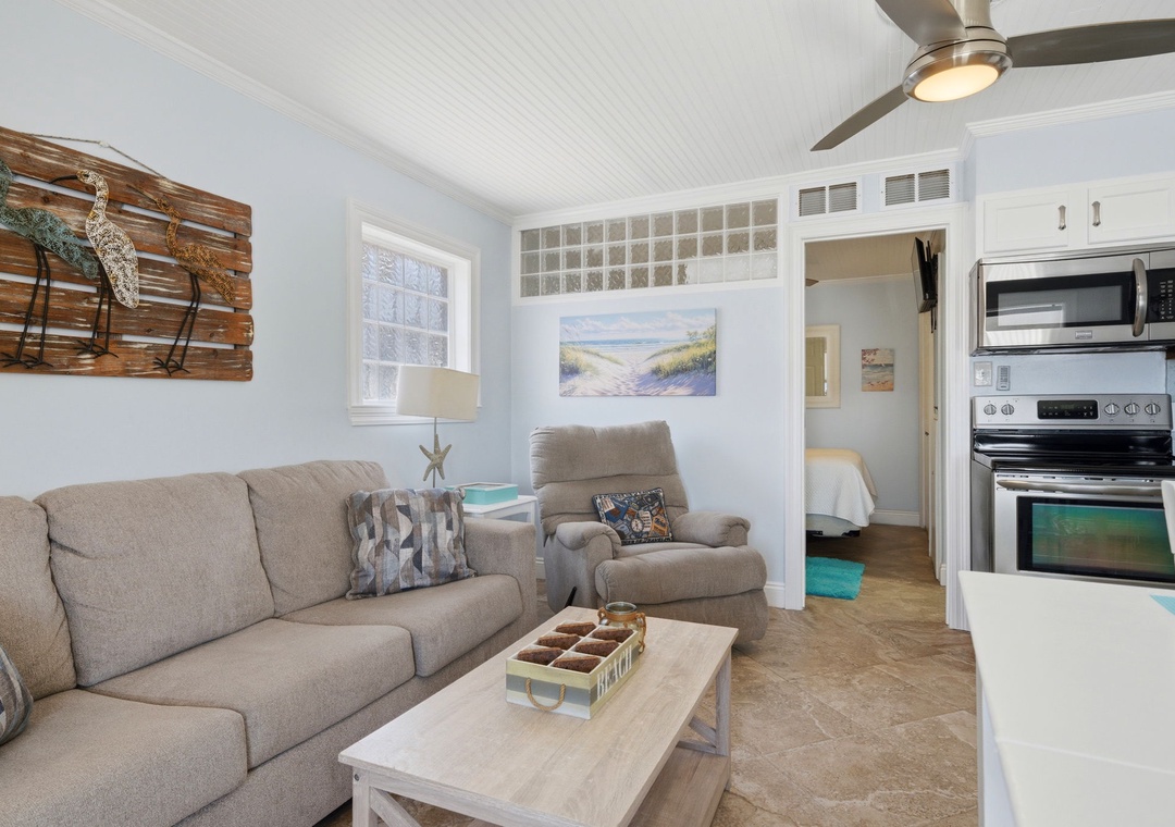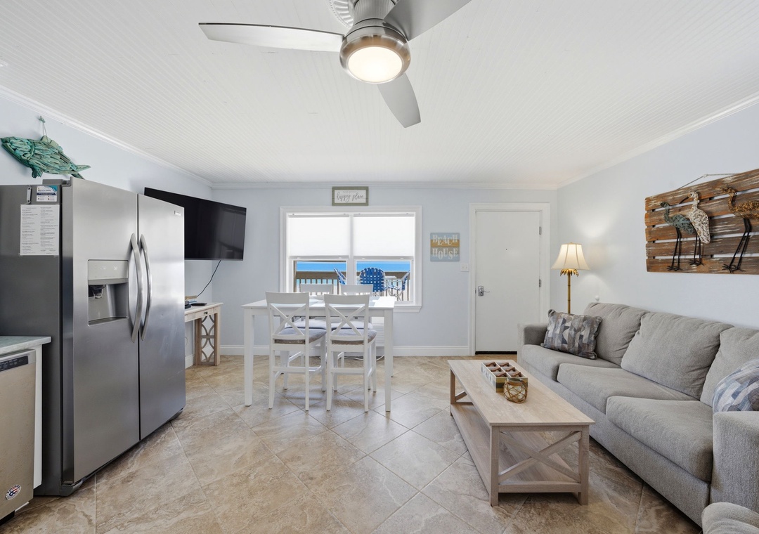 The thoughtfully designed layout includes a private bedroom with a queen bed, while the living room features a queen sofa sleeper, comfortably accommodating additional guests. The kitchen is equipped with updated appliances, perfect for preparing beach-day snacks or casual meals.