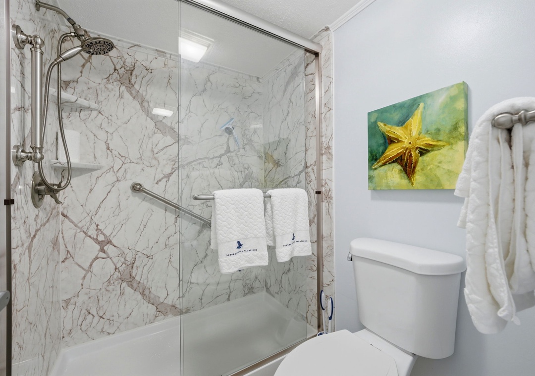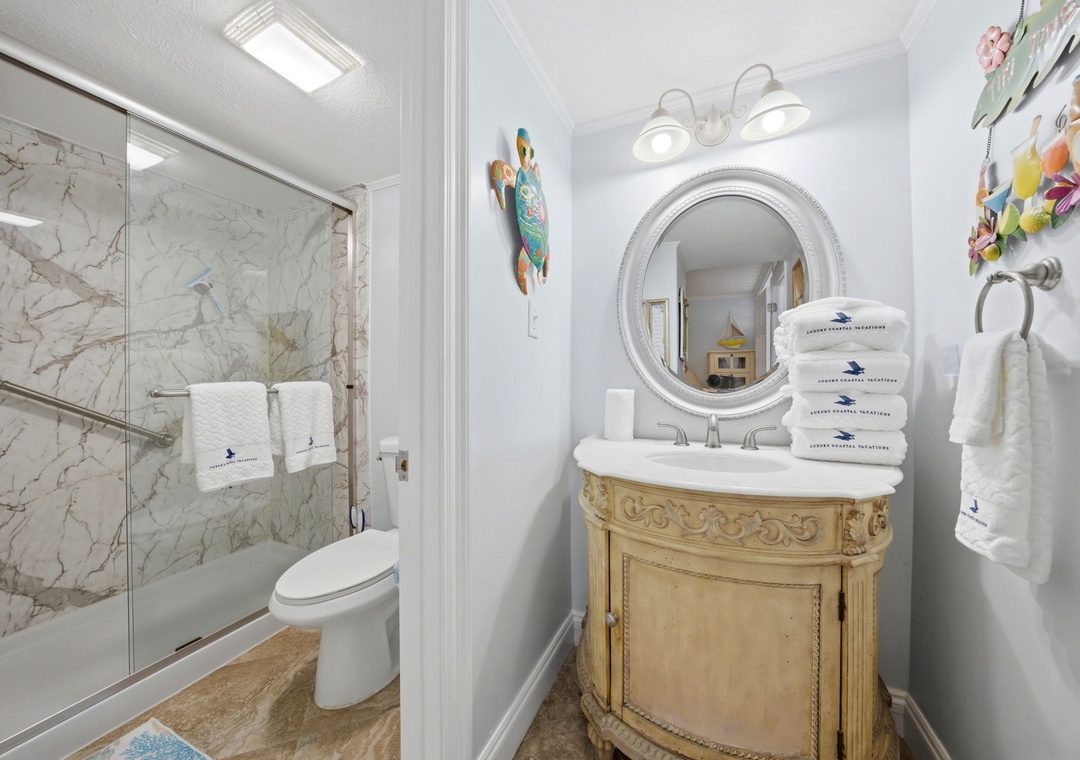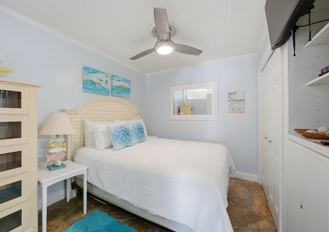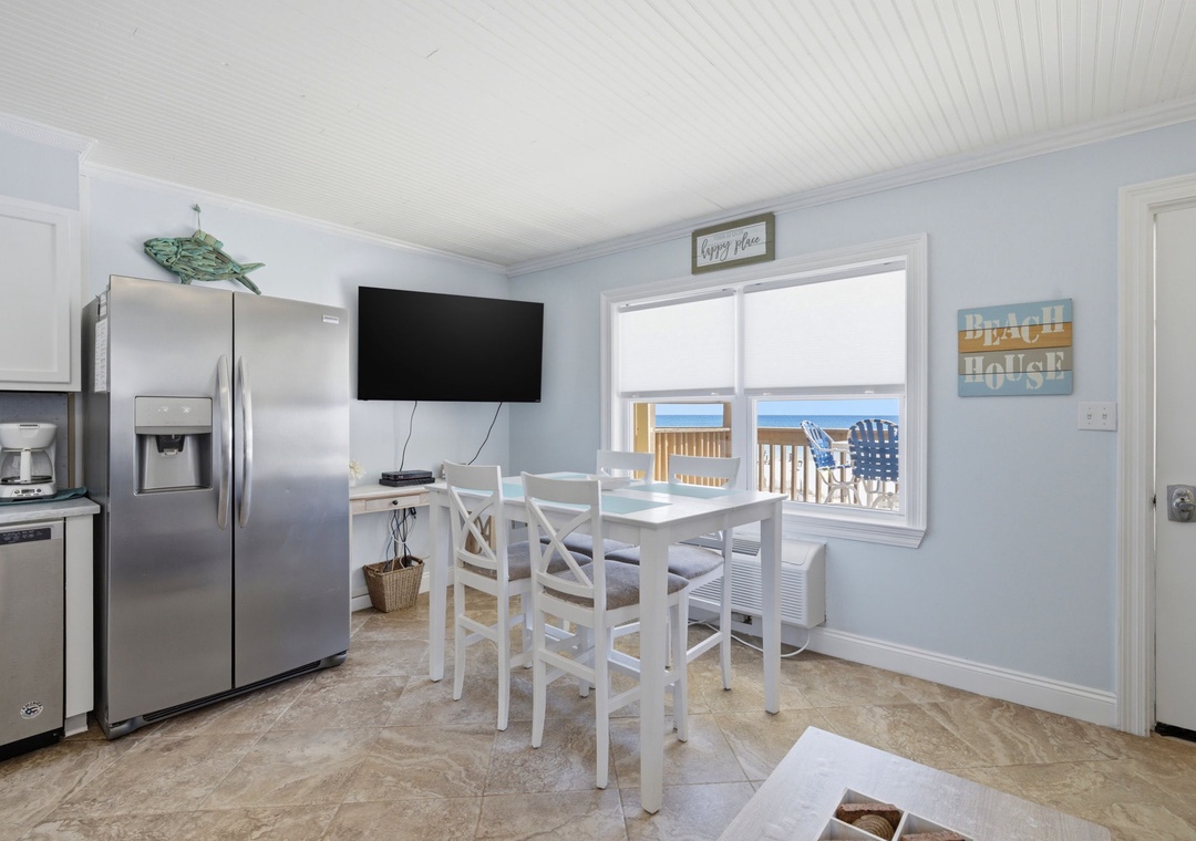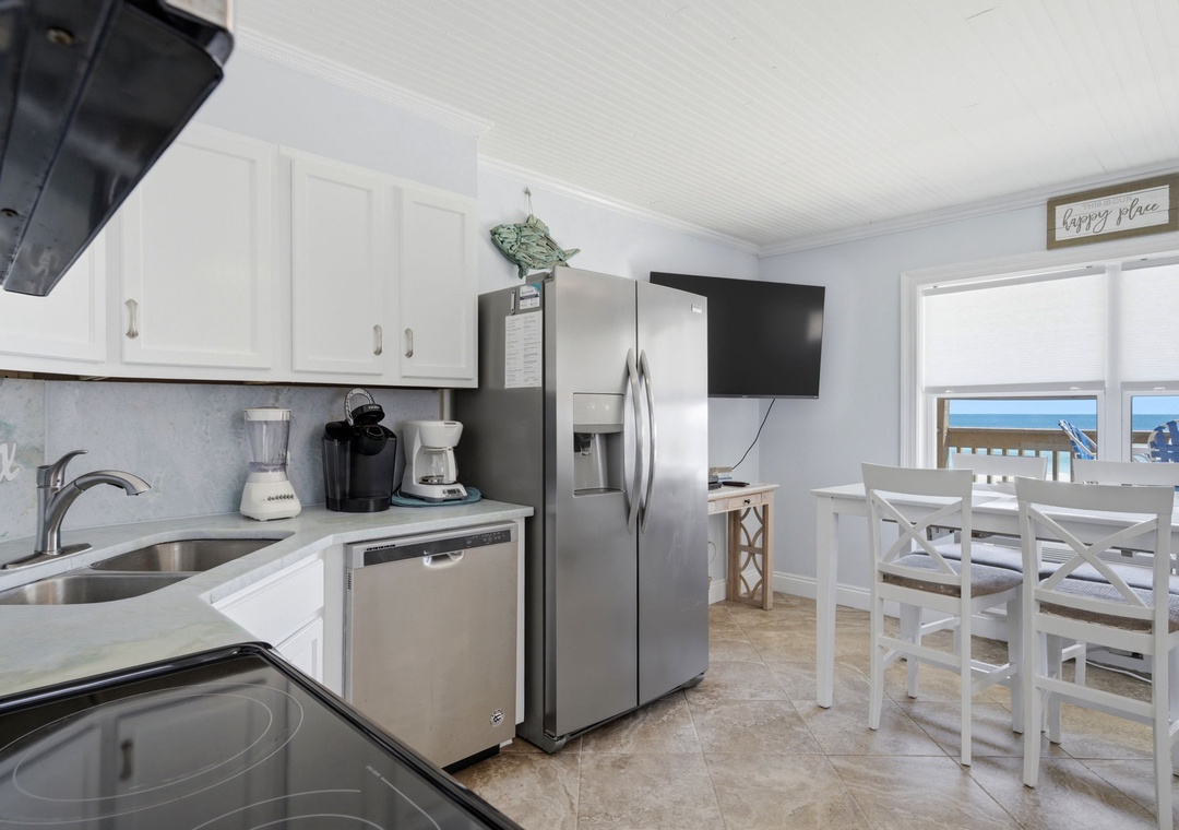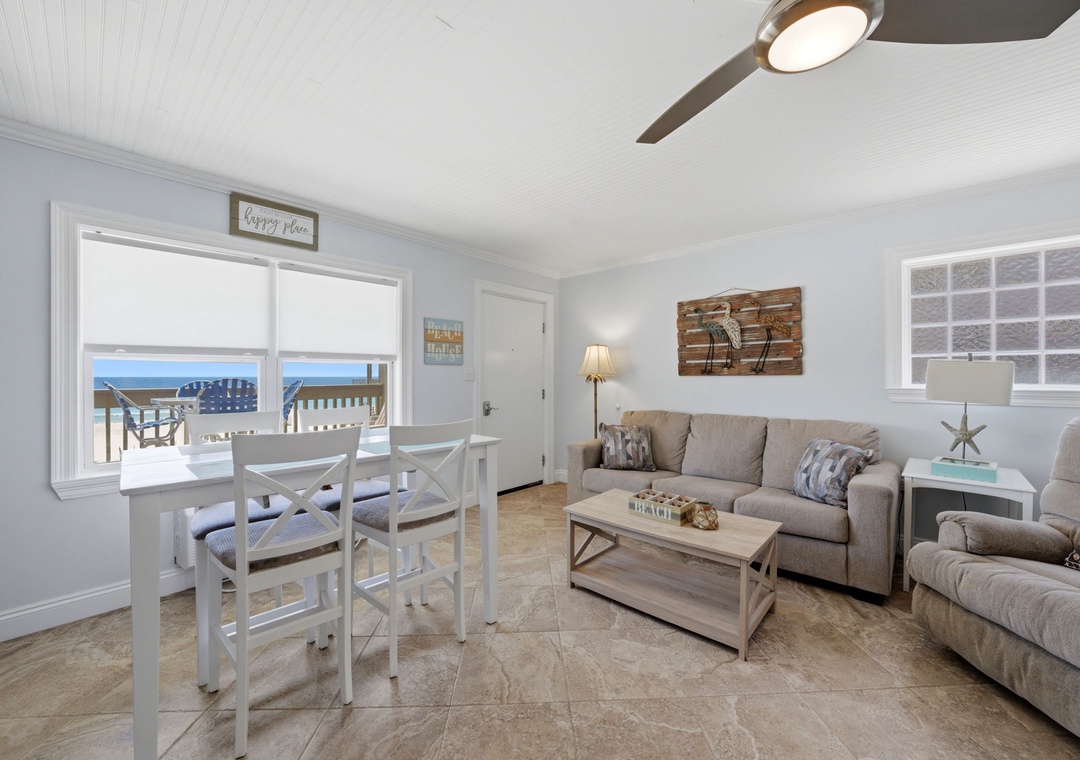 The thoughtfully designed layout includes a private bedroom with a queen bed, while the living room features a queen sofa sleeper, comfortably accommodating additional guests. The kitchen is equipped with updated appliances, perfect for preparing beach-day snacks or casual meals.
