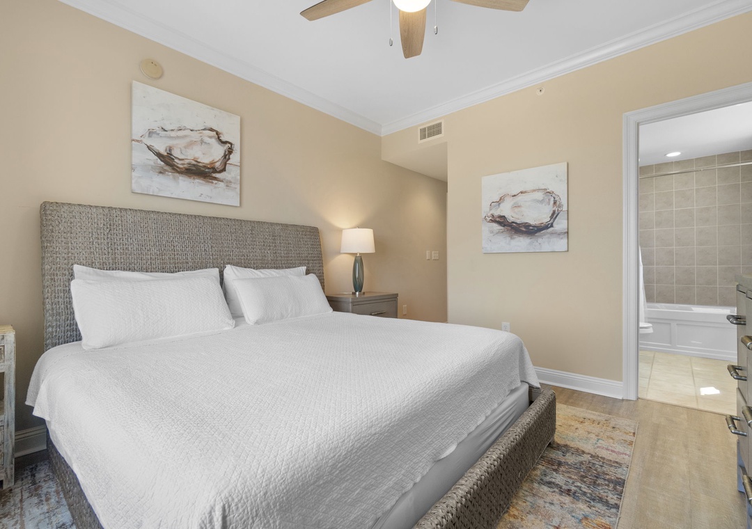 The gourmet kitchen is fully equipped with upgraded stainless-steel appliances, granite countertops, and travertine floors, making meal preparation a breeze. Enjoy meals at the elegant dining table for ten, with additional seating for two at the breakfast bar. The master suite features a king bed, gulf-front balcony access, and a spa-like bathroom with a glass and travertine walk-in shower and a jetted garden tub. The second bedroom also has a king bed, while the third bedroom offers two full beds, each with an attached bath. The fourth bedroom includes a Twin over Full bunk bed. All bedrooms are adorned with custom drapery, luxury linens, and LCD TVs. Additional amenities include a full-size washer and dryer and plush oversized bath towels. For those seeking luxury and comfort, this stunning Indigo unit in Perdido Key promises a dream vacation.