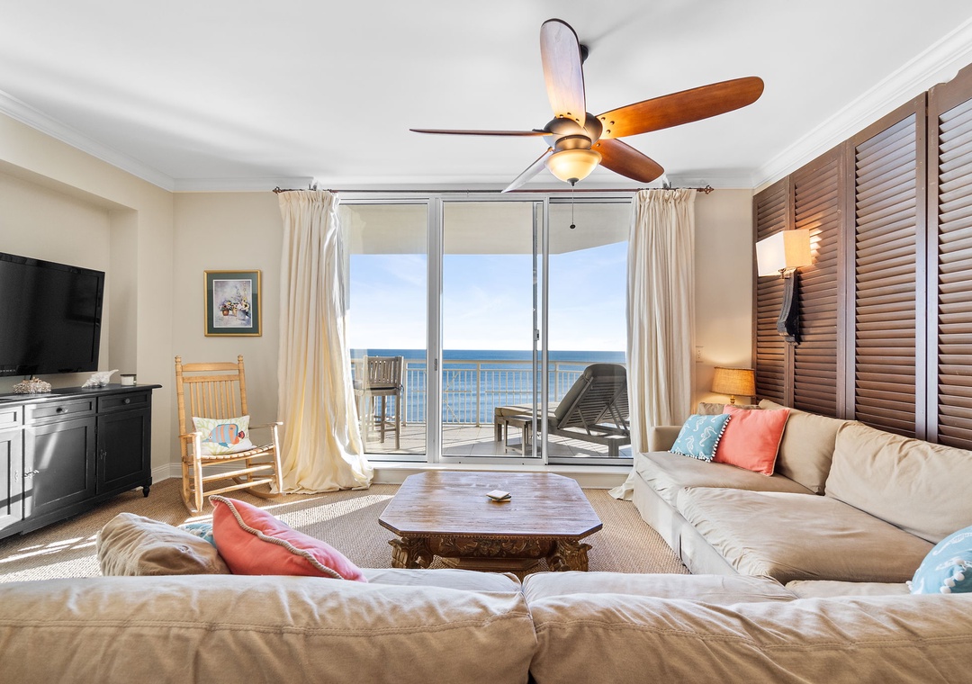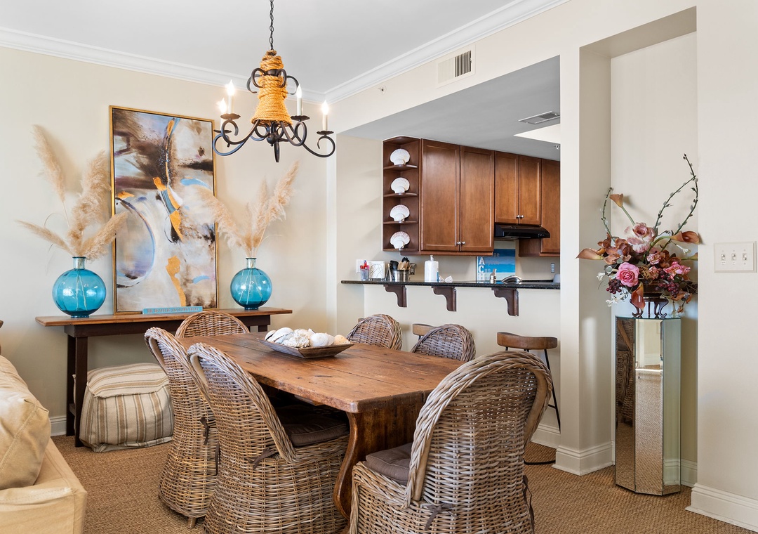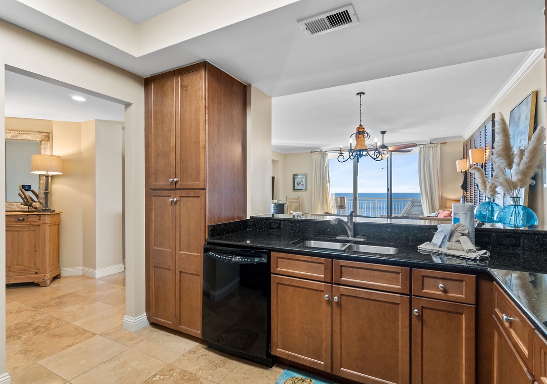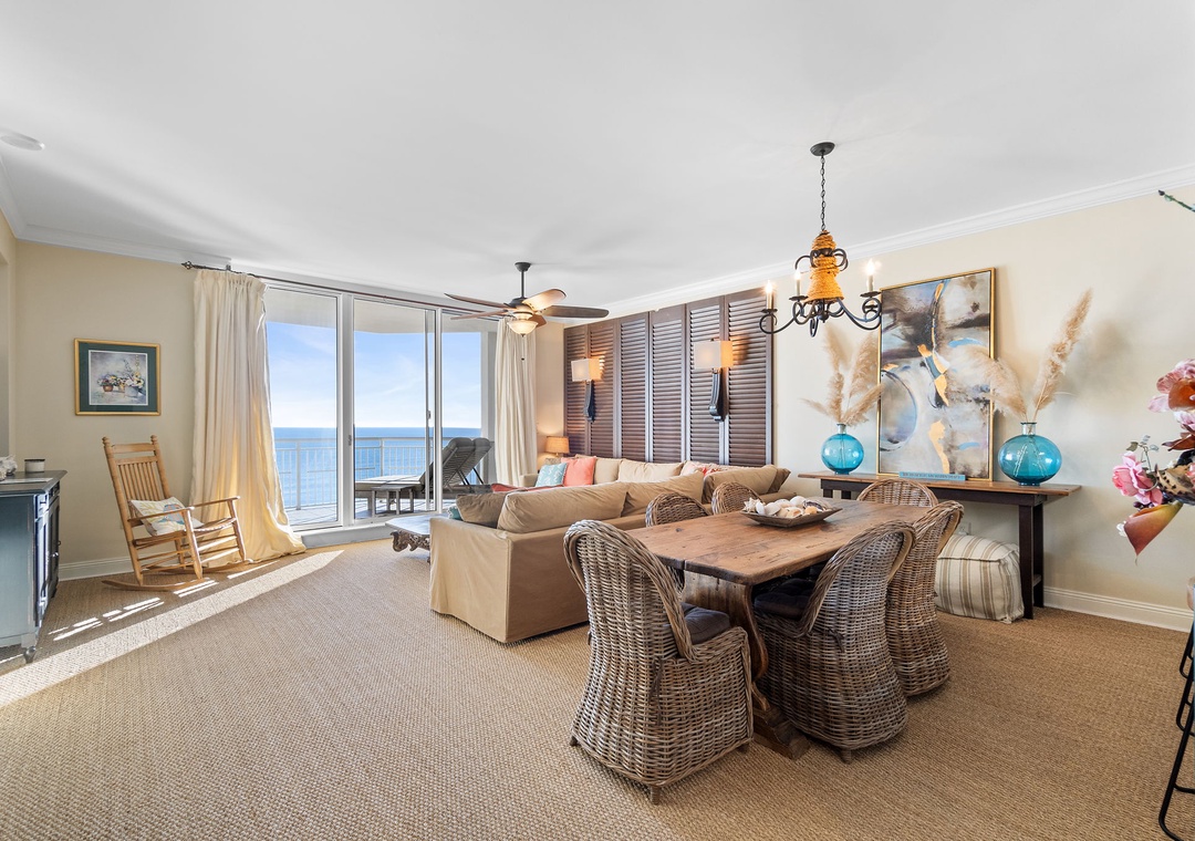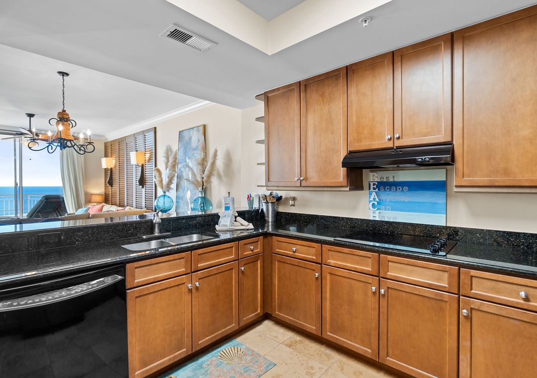 Step into a bright and inviting coastal living space designed for comfort and relaxation when you vacation at this amazing 14th floor 3 bedroom, 3 bathroom condo. This beautifully furnished living room features expansive floor-to-ceiling sliding glass doors that open to a private balcony with breathtaking ocean views, filling the space with natural light and fresh sea air. Neutral tones, textured flooring, and tasteful coastal accents create a warm, airy atmosphere. A spacious sectional sofa offers plenty of seating for family and guests, complemented by a charming wooden coffee table and cozy rocking chair. Elegant plantation-style wall panels, soft drapery, and ambient lighting add character and sophistication. This space is perfect for unwinding after a day at the beach or entertaining with a view, blending style, comfort, and seaside charm. Prepare a culinary masterpiece in the fully equipped kitchen, appointed with all of the small appliances and cookware needed to create a delicious meal.