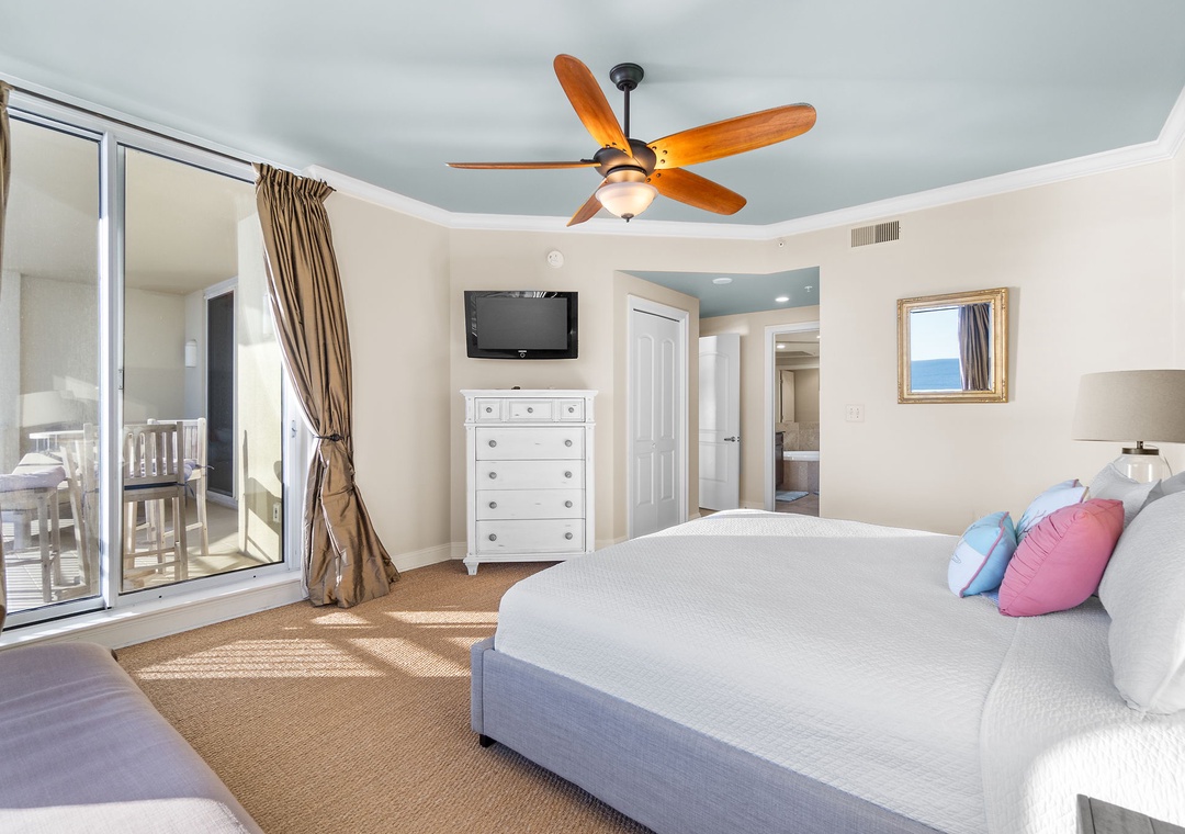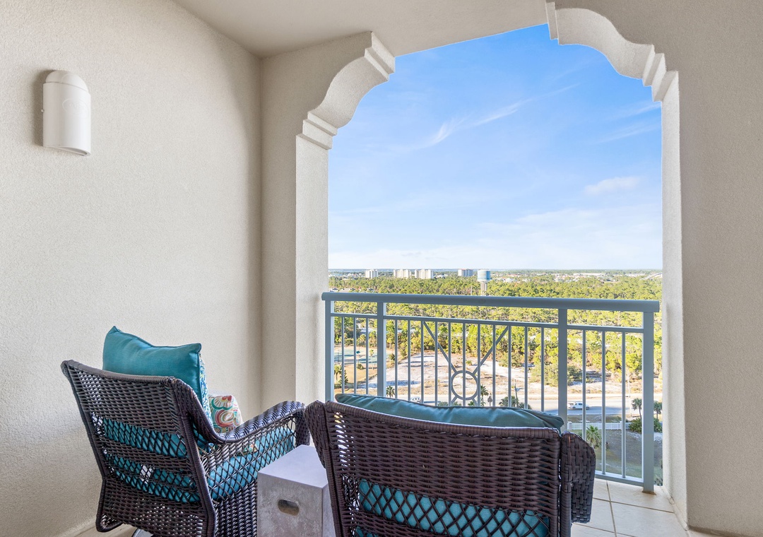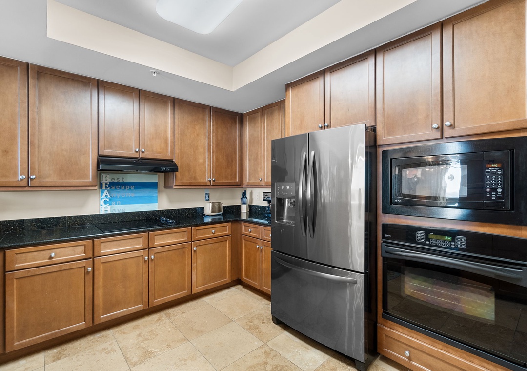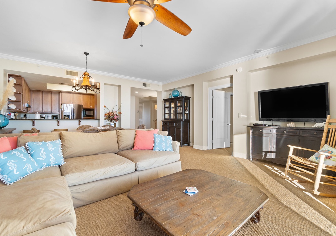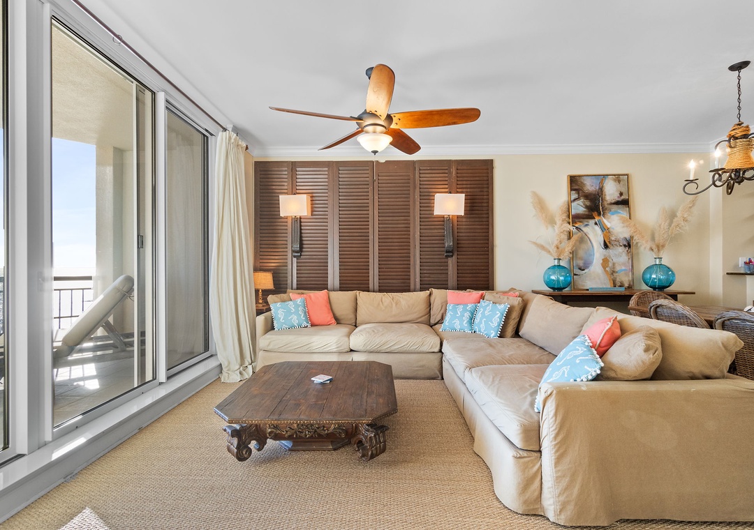 Step into a bright and inviting coastal living space designed for comfort and relaxation when you vacation at this amazing 14th floor 3 bedroom, 3 bathroom condo. This beautifully furnished living room features expansive floor-to-ceiling sliding glass doors that open to a private balcony with breathtaking ocean views, filling the space with natural light and fresh sea air. Neutral tones, textured flooring, and tasteful coastal accents create a warm, airy atmosphere. A spacious sectional sofa offers plenty of seating for family and guests, complemented by a charming wooden coffee table and cozy rocking chair. Elegant plantation-style wall panels, soft drapery, and ambient lighting add character and sophistication. This space is perfect for unwinding after a day at the beach or entertaining with a view, blending style, comfort, and seaside charm. Prepare a culinary masterpiece in the fully equipped kitchen, appointed with all of the small appliances and cookware needed to create a delicious meal.