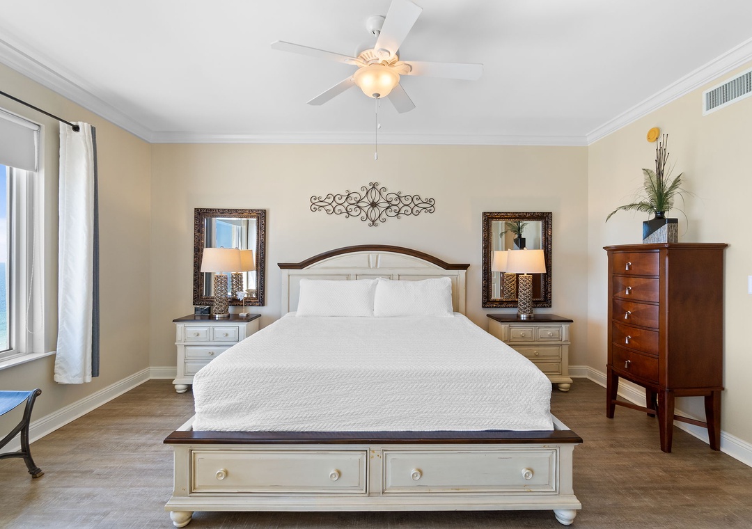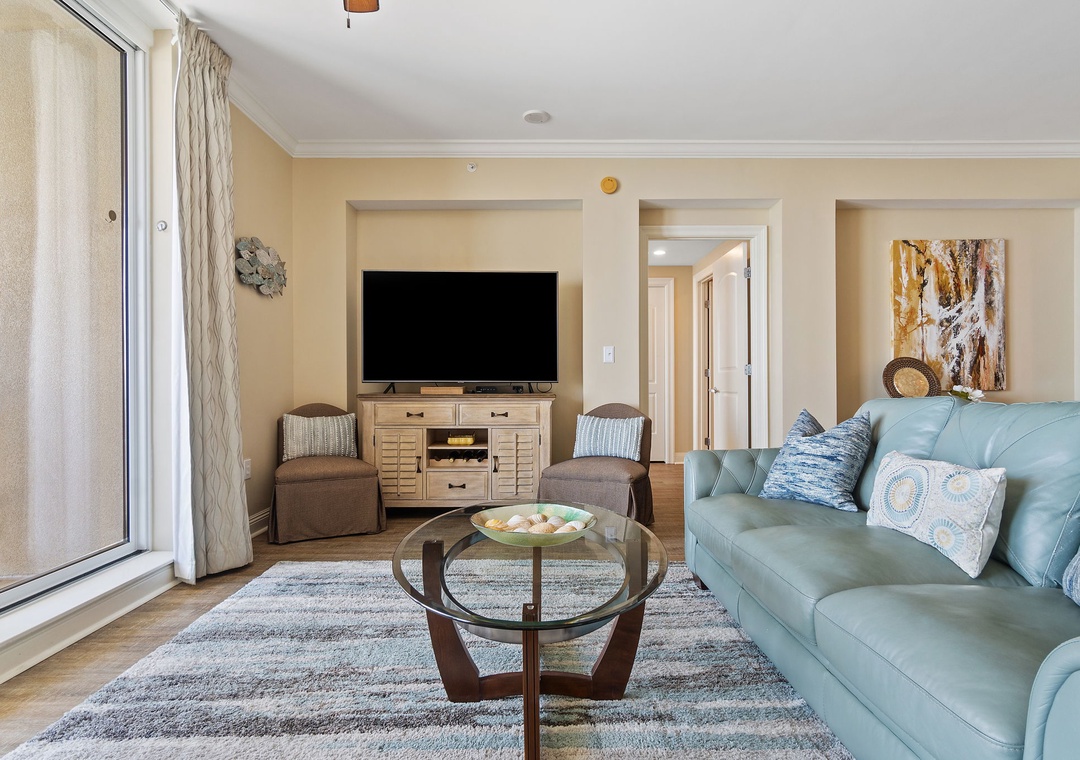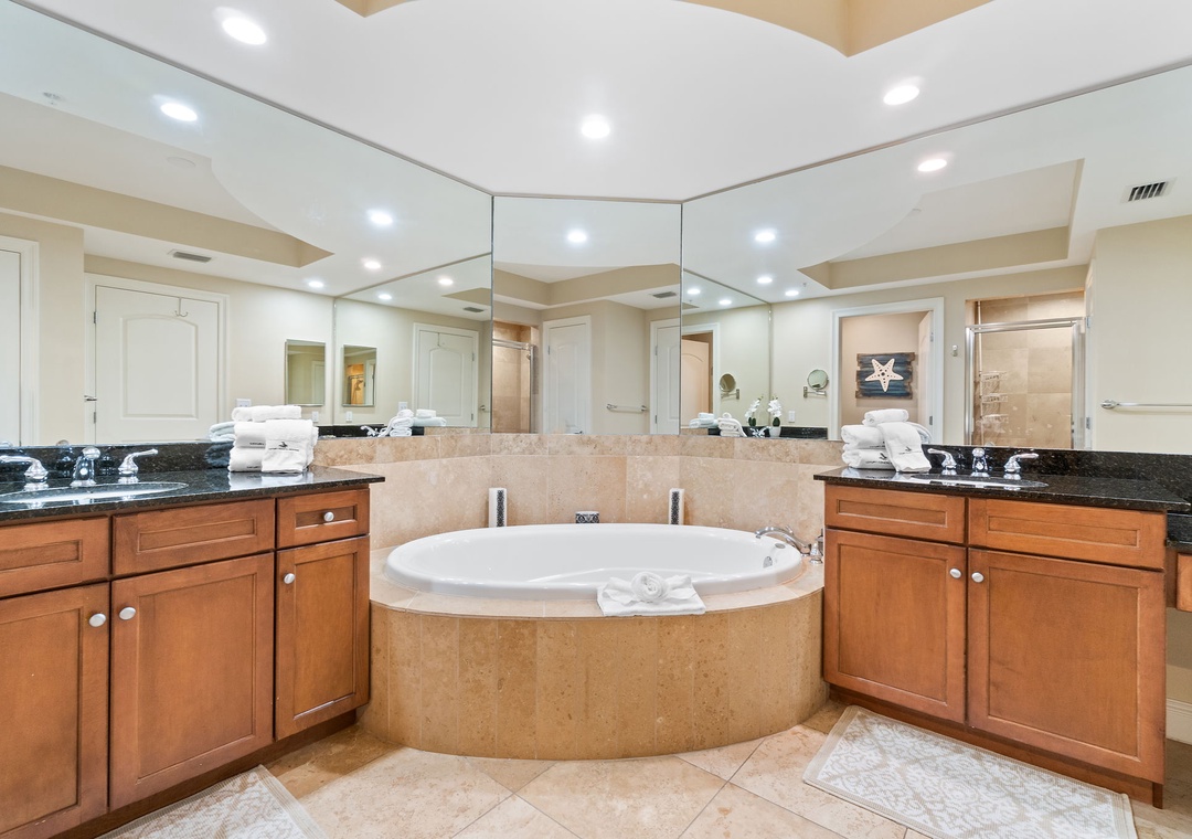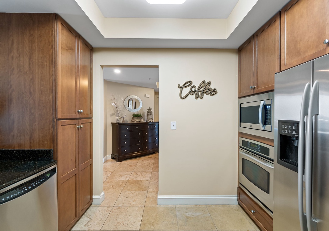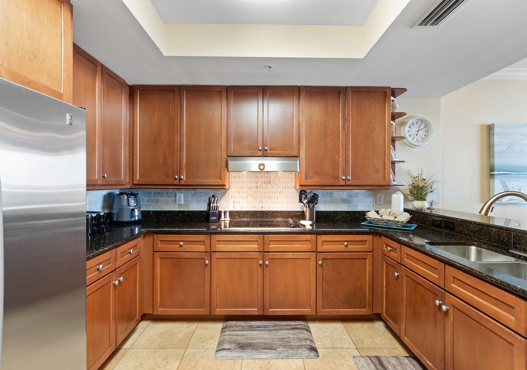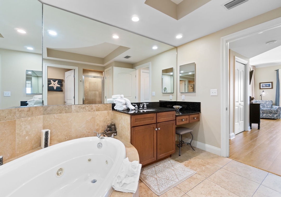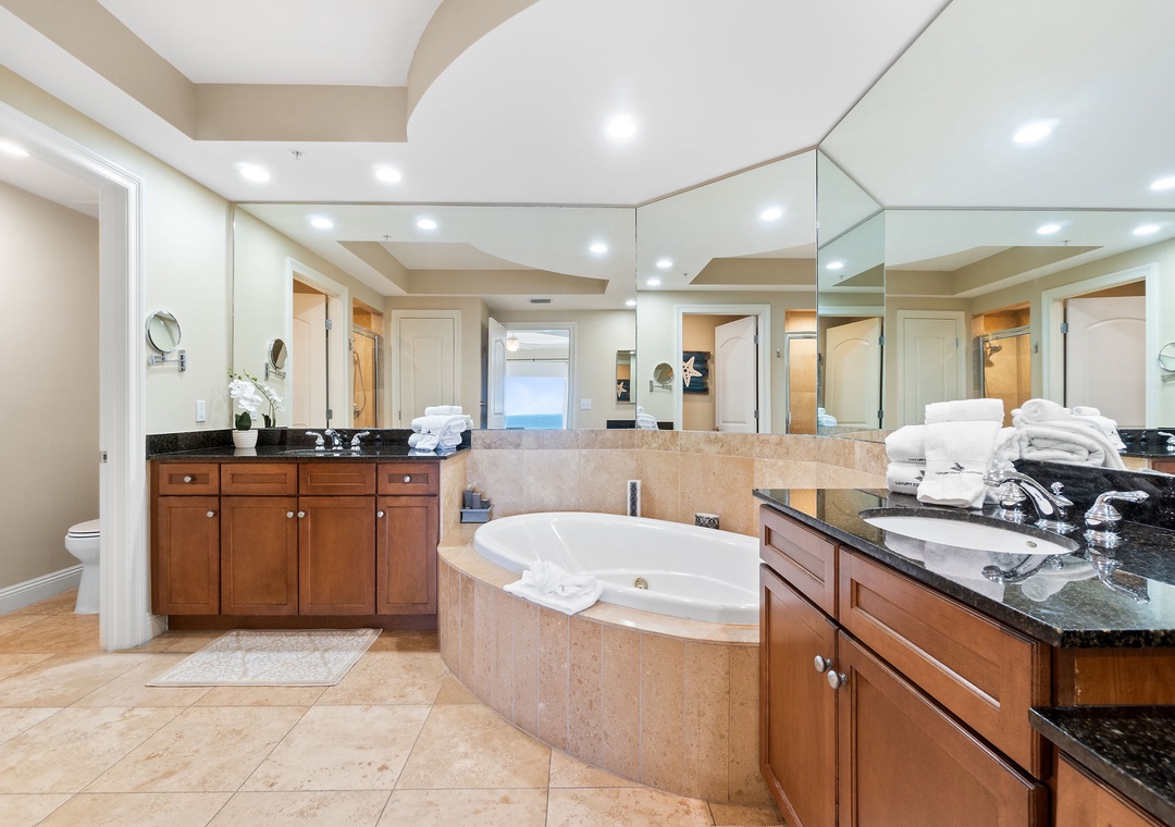 The gourmet kitchen is a chef’s dream, equipped with new stainless-steel appliances, including a side-by-side fridge with in-door water and ice dispenser, smooth top range, built-in wall oven, and microwave. Granite countertops and all the necessary cookware and utensils make meal prep a breeze. Gather around the dining table with seating for six and enjoy a delicious meal with family and friends. The master suite is a sanctuary of relaxation, featuring a plush king bed, a cozy sitting area by a large picture window, a flat-screen TV, and direct access to the beachfront balcony. The attached spa-like bathroom offers a jetted garden tub, a separate glass and travertine-tiled walk-in shower, twin vanities, and luxurious oversized bath towels. The guest bedrooms are equally inviting, with comfy beds, premium mattresses, flat-screen TVs, and attached baths. With a queen sleeper sofa in the living room, this unit comfortably accommodates up to 9 guests.