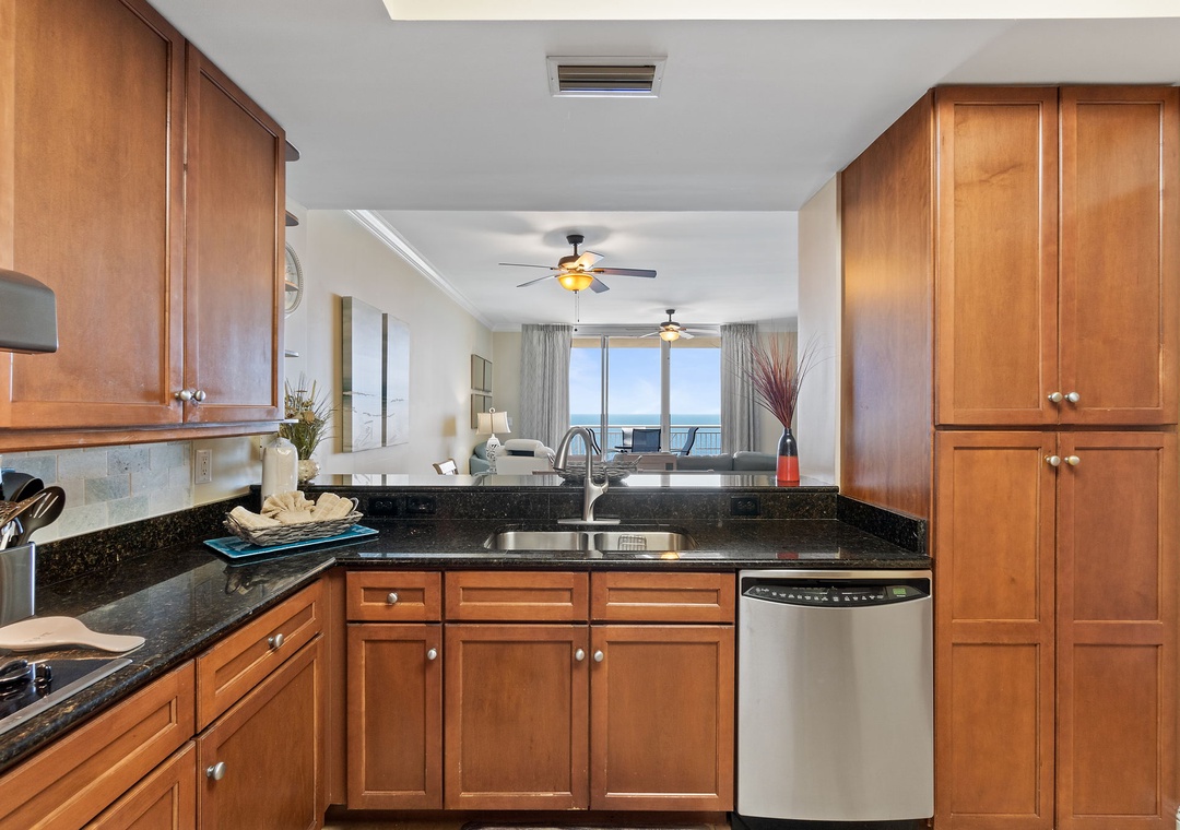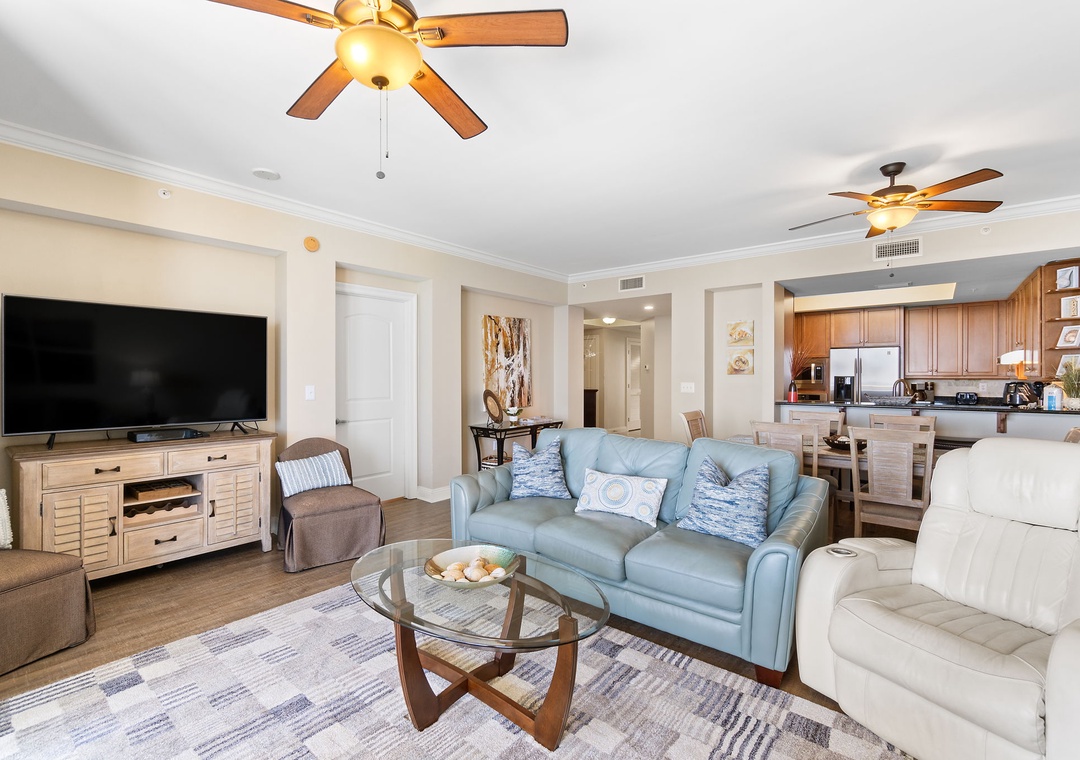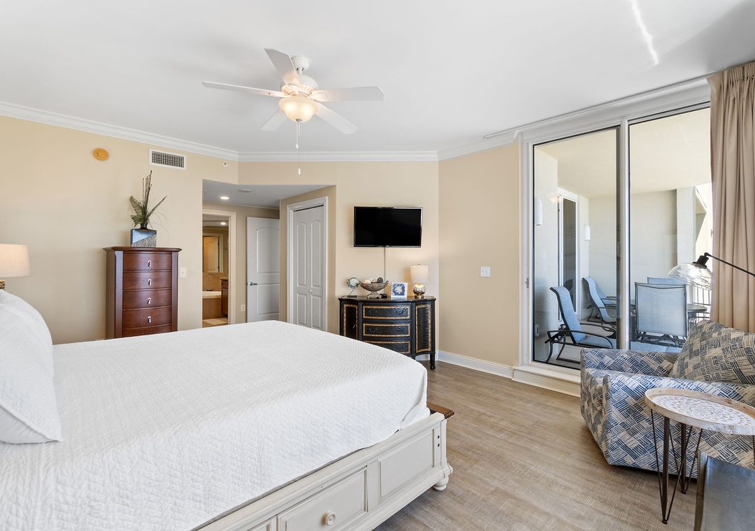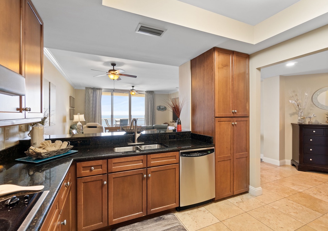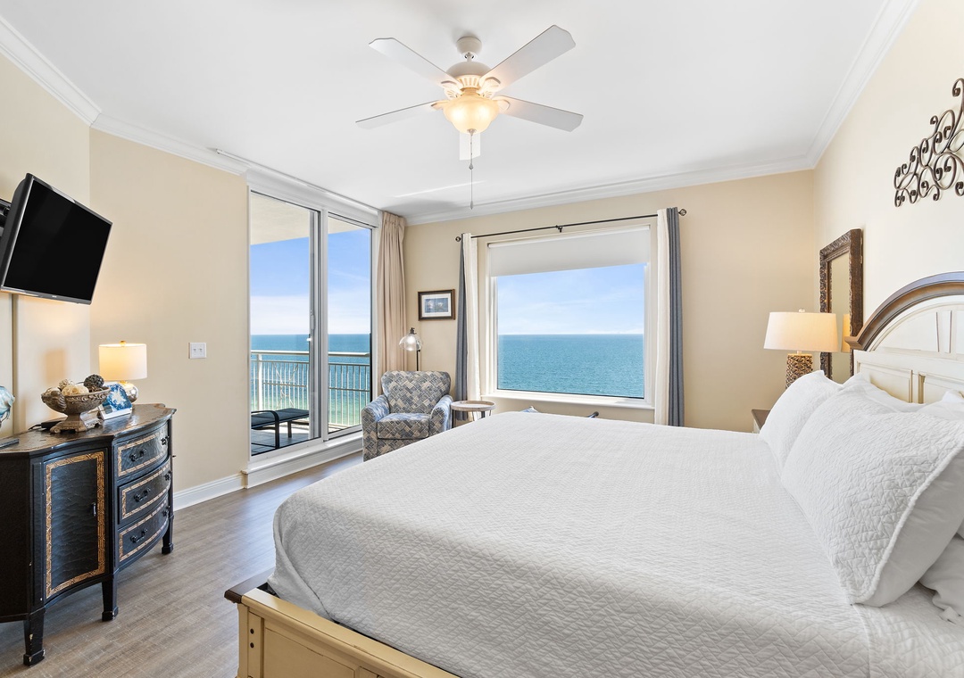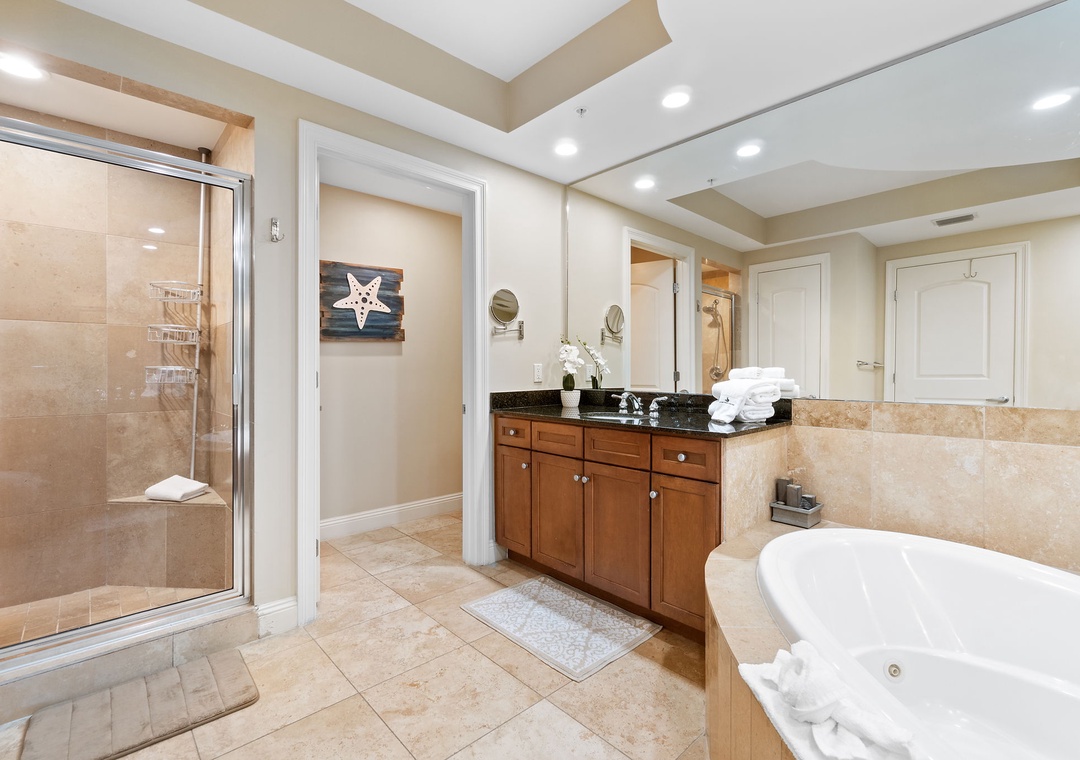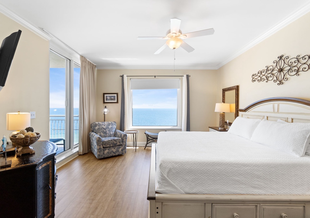 The gourmet kitchen is a chef’s dream, equipped with new stainless-steel appliances, including a side-by-side fridge with in-door water and ice dispenser, smooth top range, built-in wall oven, and microwave. Granite countertops and all the necessary cookware and utensils make meal prep a breeze. Gather around the dining table with seating for six and enjoy a delicious meal with family and friends. The master suite is a sanctuary of relaxation, featuring a plush king bed, a cozy sitting area by a large picture window, a flat-screen TV, and direct access to the beachfront balcony. The attached spa-like bathroom offers a jetted garden tub, a separate glass and travertine-tiled walk-in shower, twin vanities, and luxurious oversized bath towels. The guest bedrooms are equally inviting, with comfy beds, premium mattresses, flat-screen TVs, and attached baths. With a queen sleeper sofa in the living room, this unit comfortably accommodates up to 9 guests.