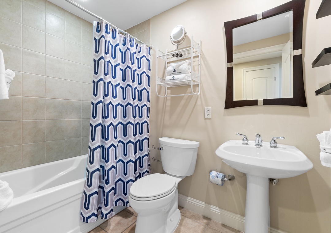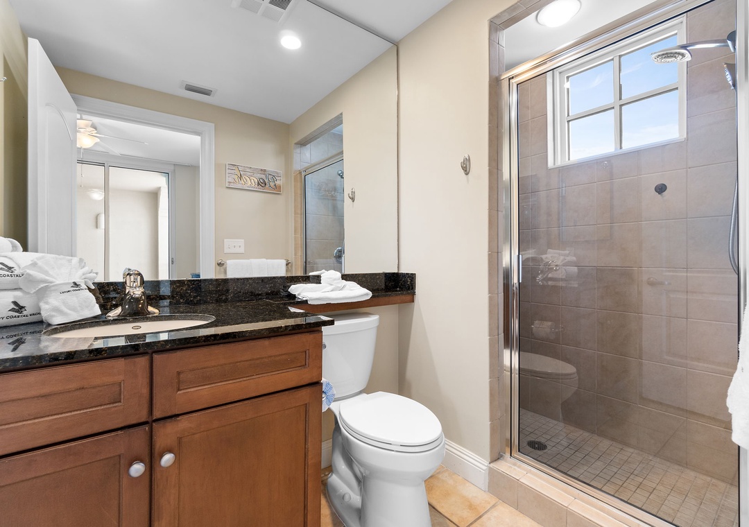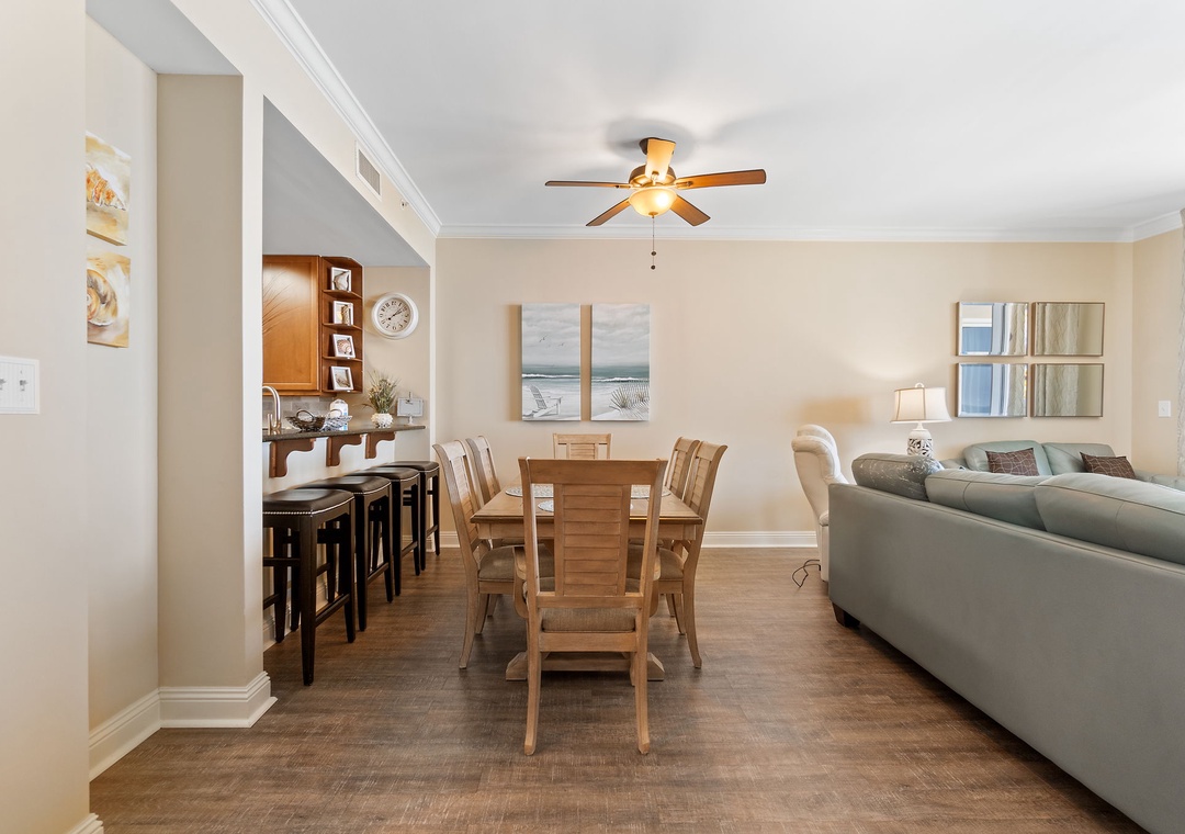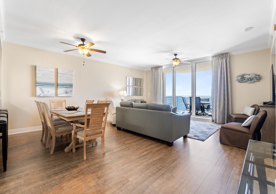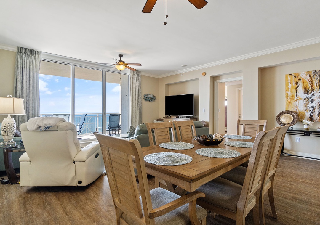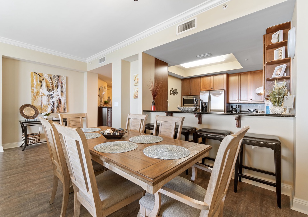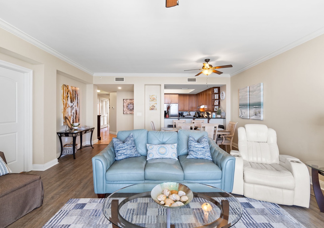 The gourmet kitchen is a chef’s dream, equipped with new stainless-steel appliances, including a side-by-side fridge with in-door water and ice dispenser, smooth top range, built-in wall oven, and microwave. Granite countertops and all the necessary cookware and utensils make meal prep a breeze. Gather around the dining table with seating for six and enjoy a delicious meal with family and friends. The master suite is a sanctuary of relaxation, featuring a plush king bed, a cozy sitting area by a large picture window, a flat-screen TV, and direct access to the beachfront balcony. The attached spa-like bathroom offers a jetted garden tub, a separate glass and travertine-tiled walk-in shower, twin vanities, and luxurious oversized bath towels. The guest bedrooms are equally inviting, with comfy beds, premium mattresses, flat-screen TVs, and attached baths. With a queen sleeper sofa in the living room, this unit comfortably accommodates up to 9 guests.