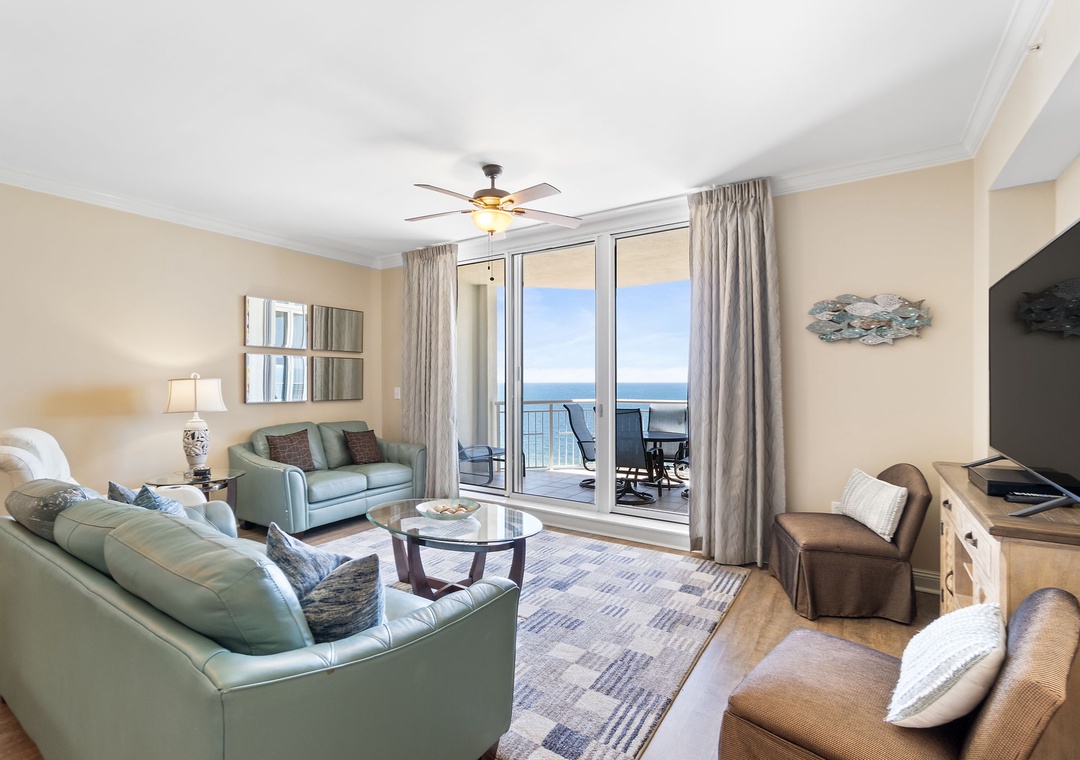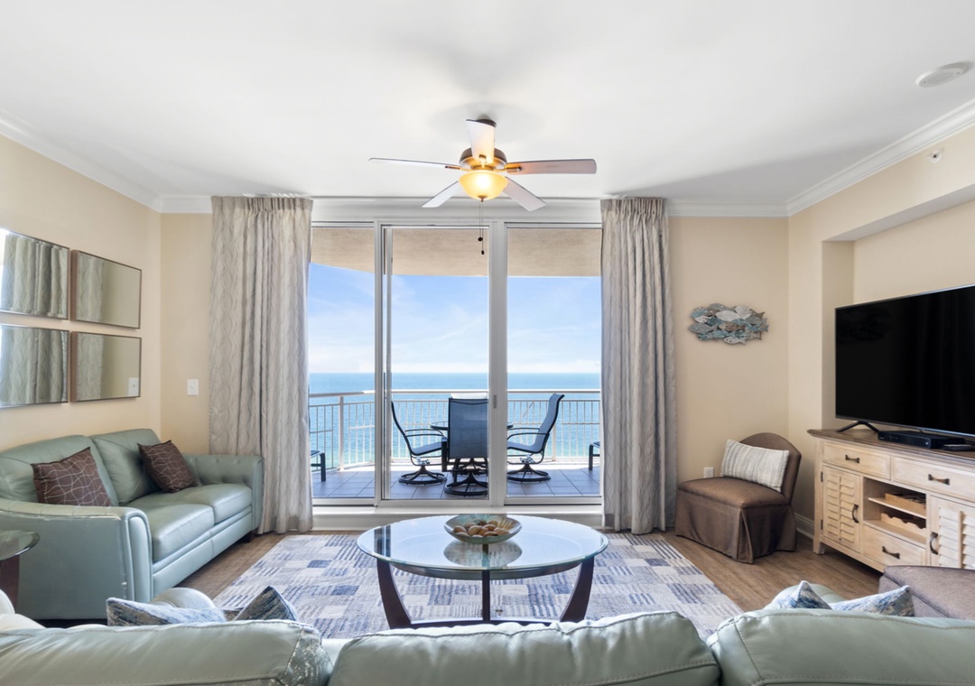 Step into luxury with this exquisite 14th-floor, 3-bedroom, 3-bath condo, offering nearly 2,000 square feet of modern elegance. Accessed through a private foyer, this contemporary retreat is thoughtfully designed with a perfect blend of style and comfort. The living area features plush designer furnishings, a large flat-screen TV, and travertine tile throughout. Floor-to-ceiling sliding glass doors flood the space with natural light and lead to a beachfront balcony where you can soak in breathtaking views.