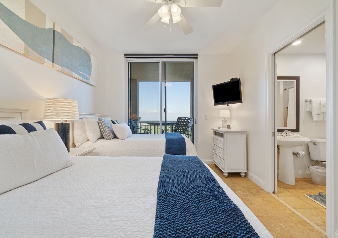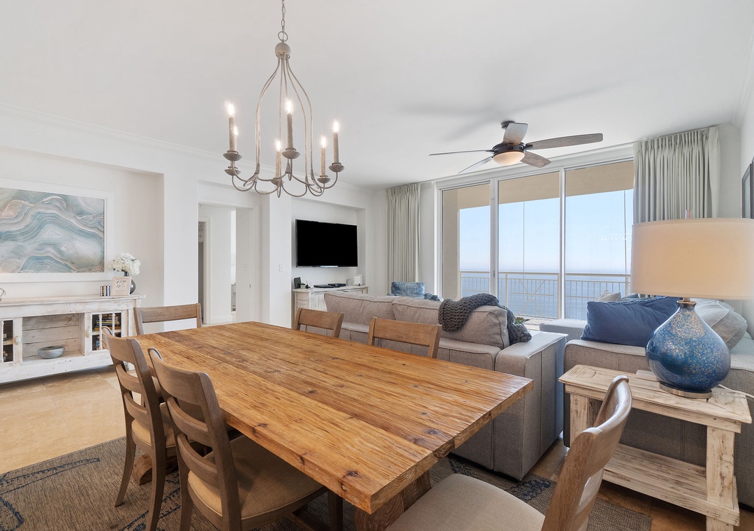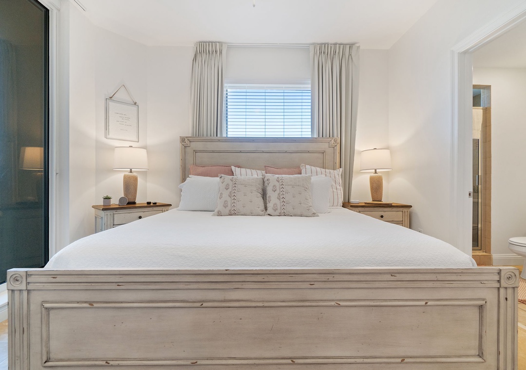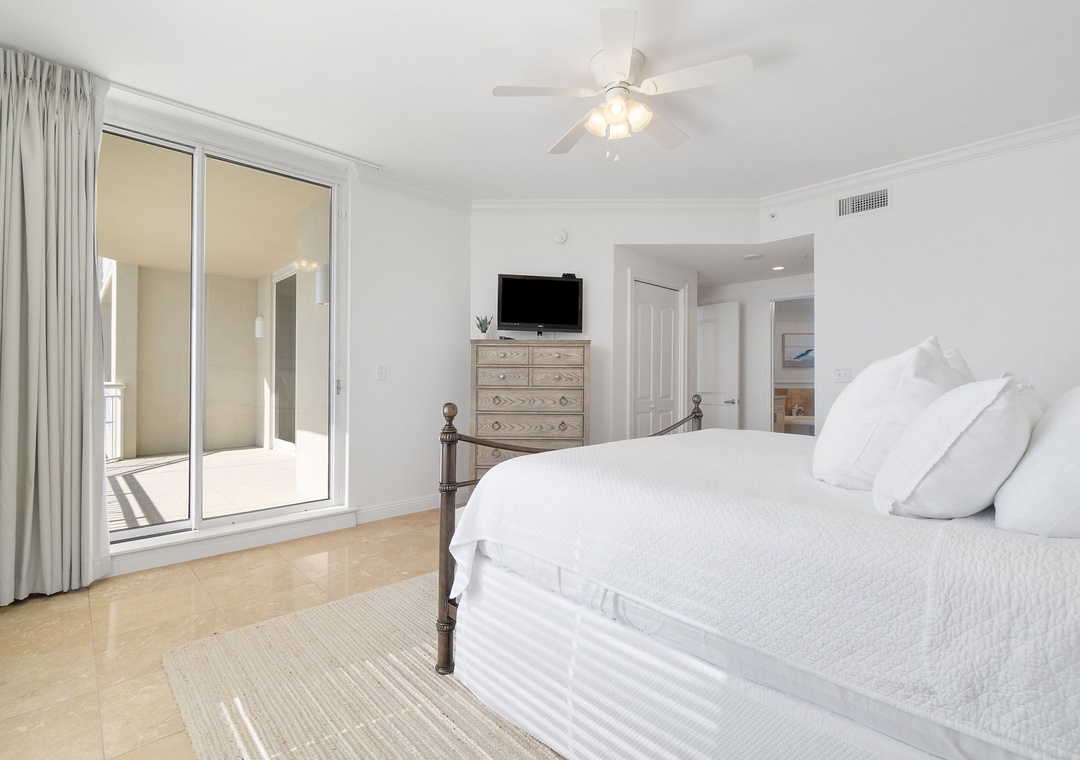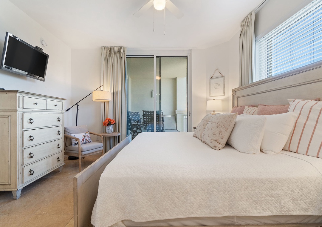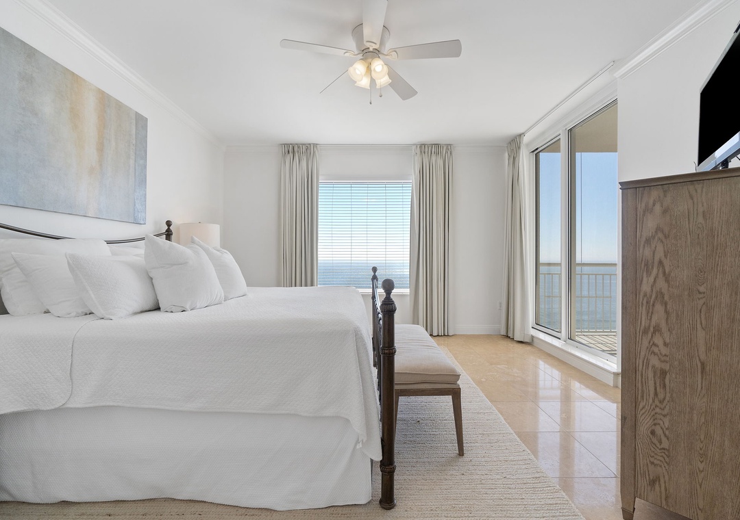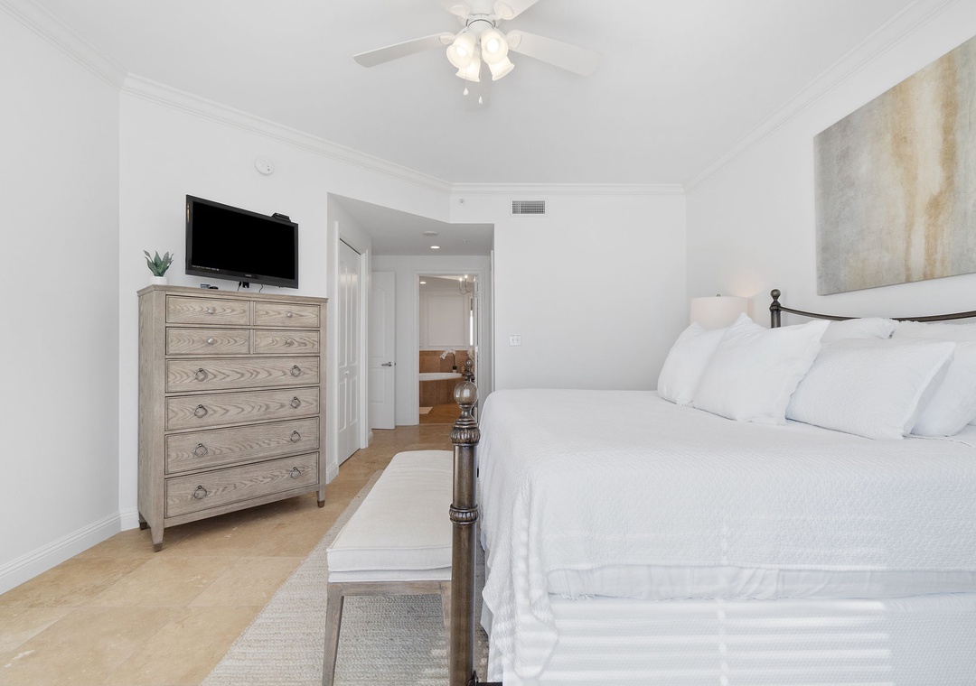 The gourmet kitchen is equipped with high-end custom cabinetry, stainless steel appliances, and all the cookware and utensils needed to create culinary masterpieces. Enjoy breakfast at the bar or dine at the beautiful wooden table with seating for six while watching the sky transform from tranquil blue to fiery pink. The master suite features a king-size bed with a top-of-the-line mattress, an LCD TV, and a large picture window showcasing breathtaking views. The luxurious attached bath includes a jetted tub, a separate glass-tiled shower, and double vanities. The second bedroom offers a plush king mattress, while the third bedroom has two queen beds, each with an attached bath, smart TV, and access to the north balcony with stunning views of Perdido Key.