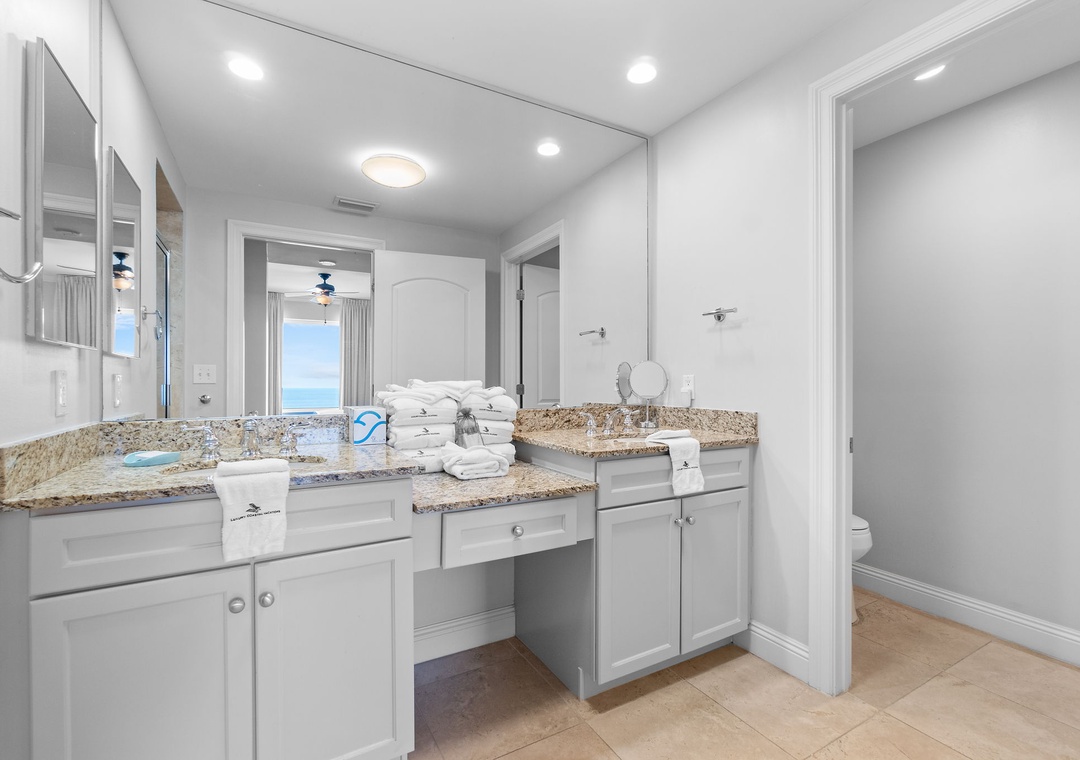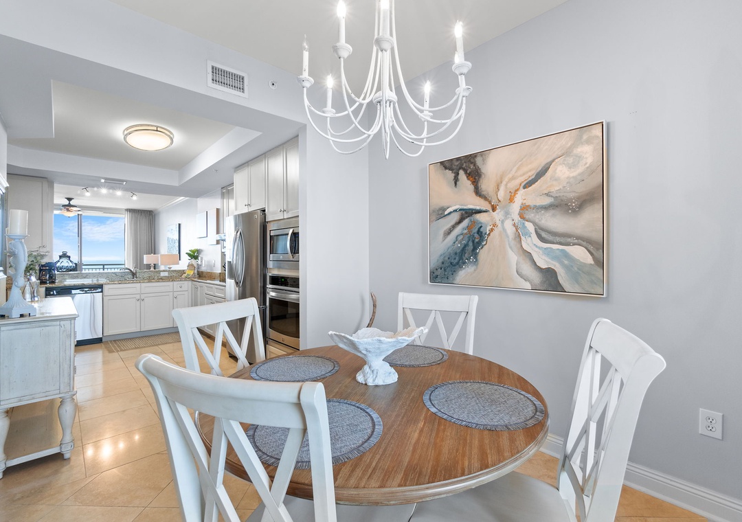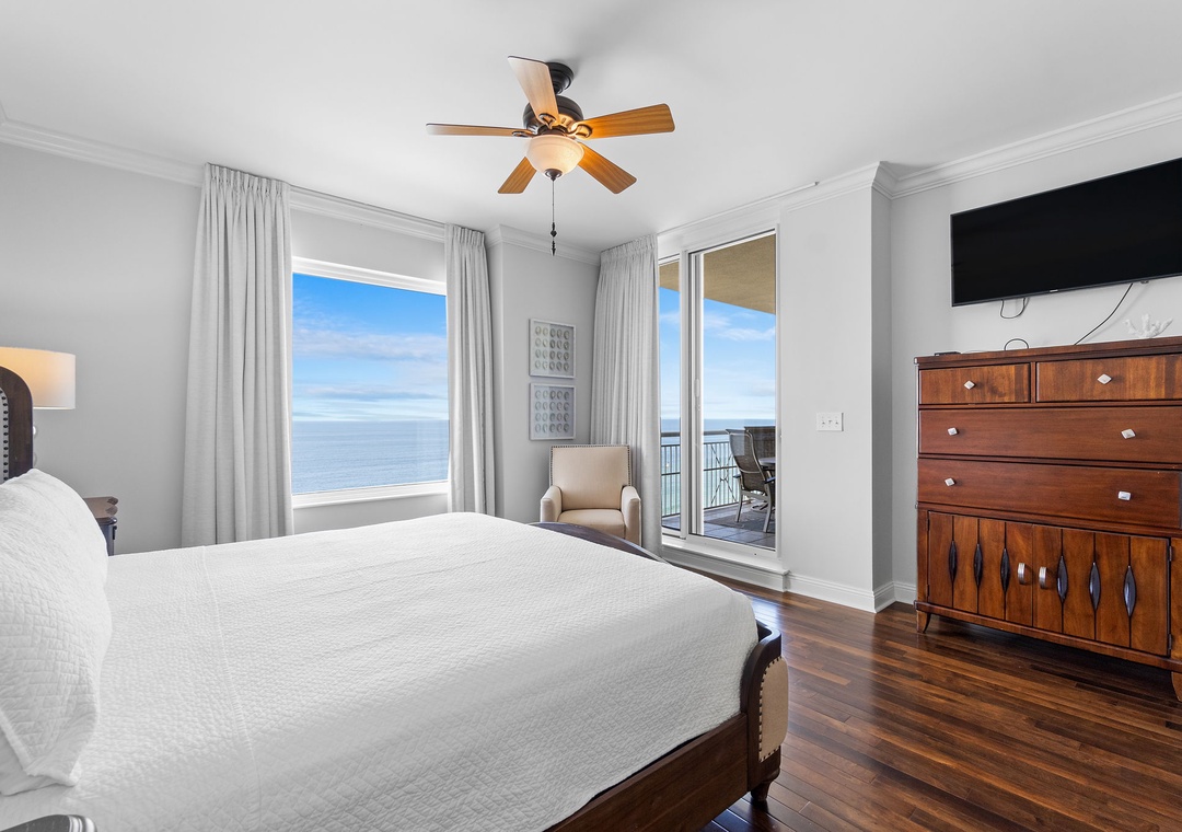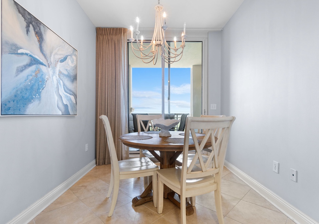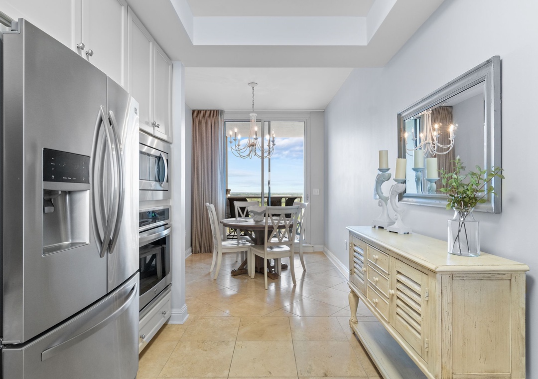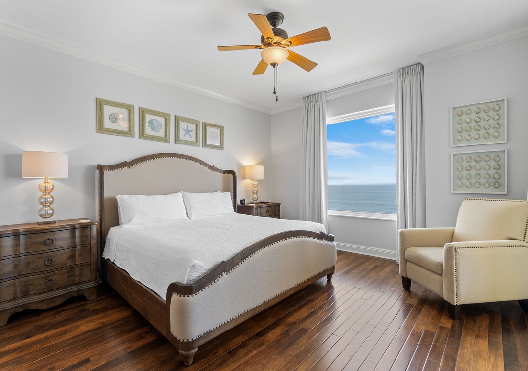 The luxury kitchen is fully equipped with upgraded stainless appliances, a breakfast bar, and a separate dining area with ample seating, leading to the north balcony. The Gulf-front master suite boasts hardwood floors, a premium king mattress, luxury linens, a flat-screen TV, and balcony access with incredible Gulf views. The master bath includes custom cabinetry, double vanities with granite countertops, and a glass walk-in shower. The second suite is equally impressive, with a king bed, luxury bedding, a flat-screen TV, and access to the north balcony with stunning views of Old River and the Intracoastal Waterway. Don't miss out on this perfect coastal getaway—book Indigo East 1504 today!