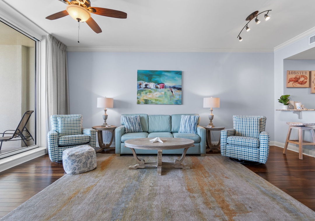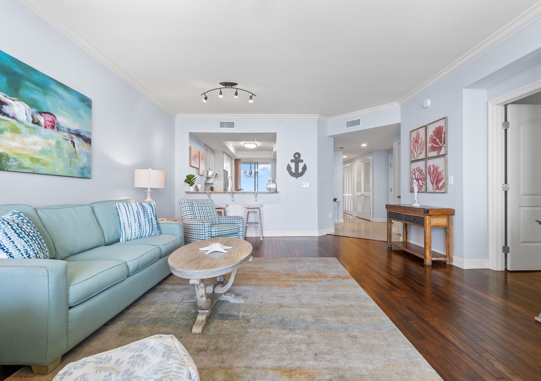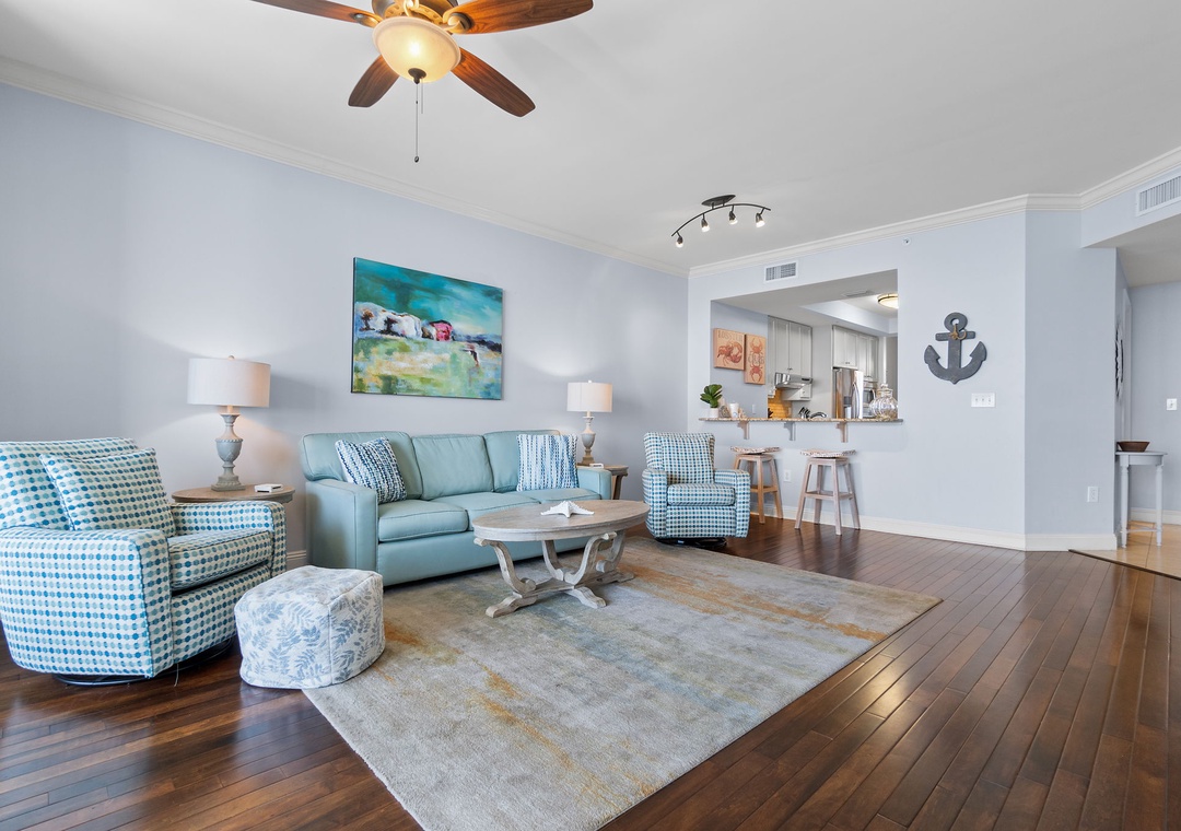 Experience your dream vacation in this stunning 2-bedroom, 2-bath, 15th-floor Indigo condo, offering over 1,600 square feet of beach-chic luxury. Adorned in bright aqua hues and calming neutrals, this coastal retreat exudes a spa-like atmosphere. The living room features a plush sofa, cushioned chairs, and a large smart TV, with floor-to-ceiling sliding glass doors that open to a spacious beachfront balcony, perfect for enjoying the breathtaking Gulf views from your private terrace.