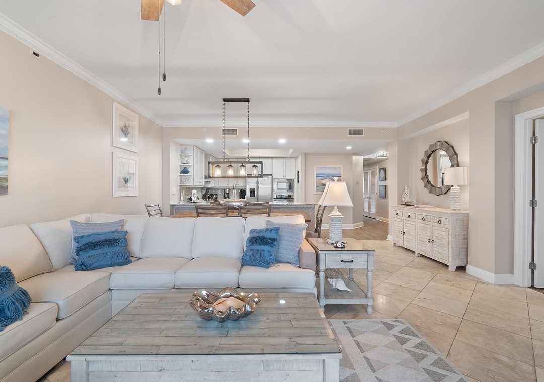 Experience the ultimate luxury vacation at Indigo East Resort in this beautifully renovated 3-bedroom, 3-bath condo on the 17th floor. As you step out of the private elevator into your personal foyer, you'll be greeted by breathtaking Gulf views and nearly 2,000 square feet of upscale living space. The professionally decorated living area features a spacious sectional sofa with a queen sleeper, additional seating, and a dining area with seating for eight, plus four more at the breakfast bar. The open-concept gourmet kitchen, equipped with high-end KitchenAid and GE Profile appliances, granite countertops, and premium cookware, is perfect for creating memorable meals.