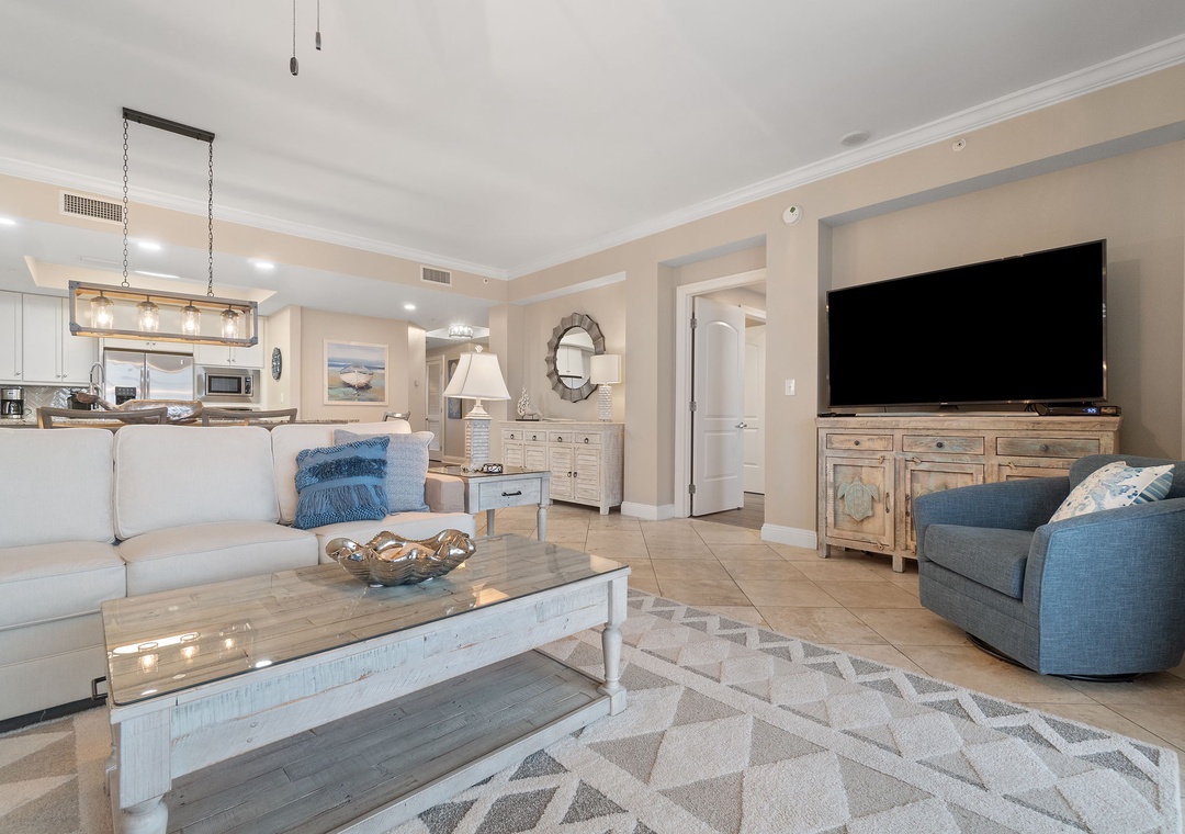 Wake up to stunning Gulf views from the master bedroom, which opens directly to a furnished balcony where you can enjoy coffee or wine while listening to the waves. The master suite includes a king bed, 50” LED HDTV, and a luxurious bath with a jetted tub, double vanity, and travertine floors. The second bedroom also features a king bed and private bath, while the third bedroom offers a queen bed and its own bath, both with balcony access and LED HDTVs. With a queen sleeper sofa in the living room, this condo comfortably accommodates up to eight guests. Additional conveniences include an in-unit laundry room with a large washer and dryer, and easy access to a trash chute just outside your door.