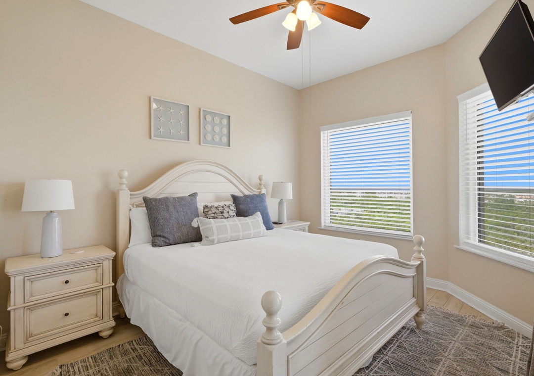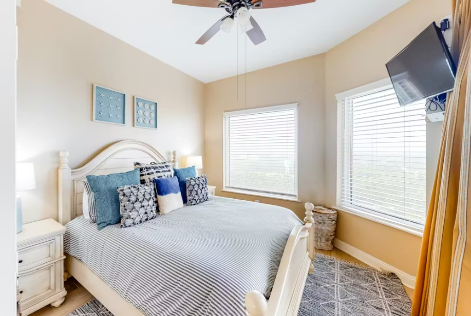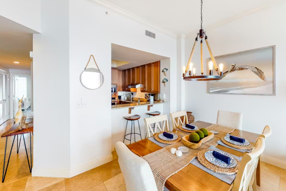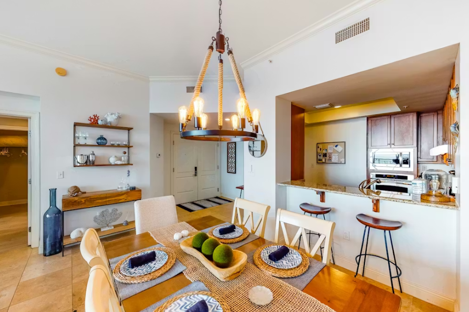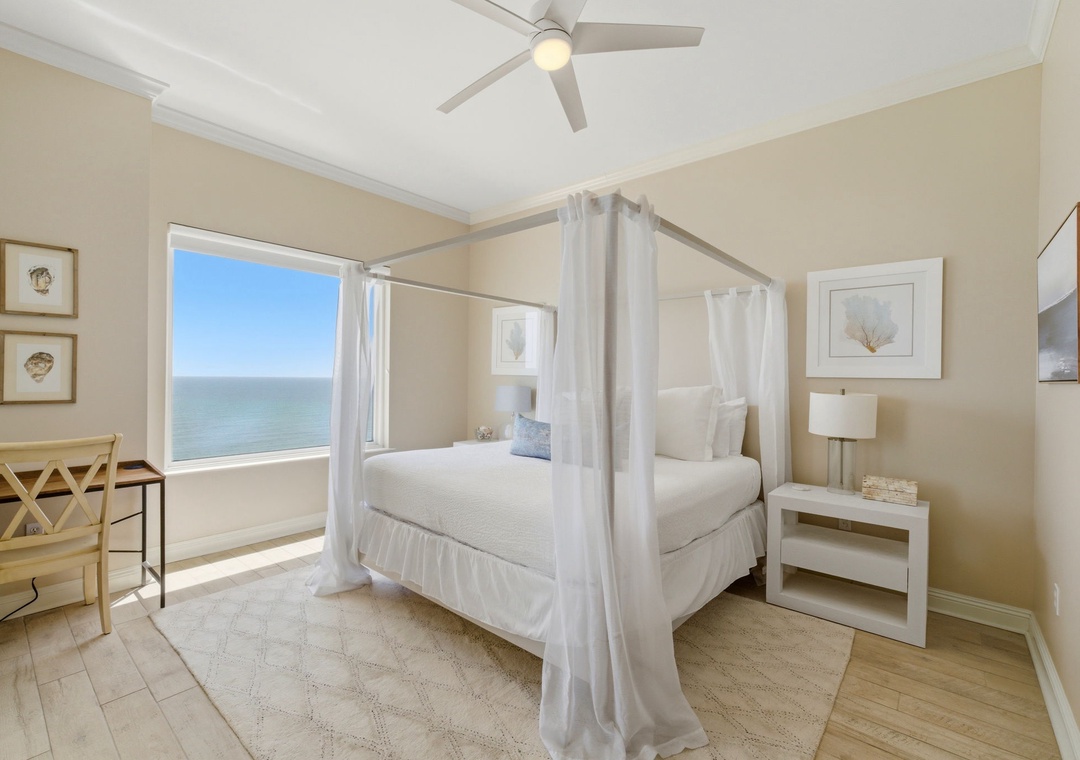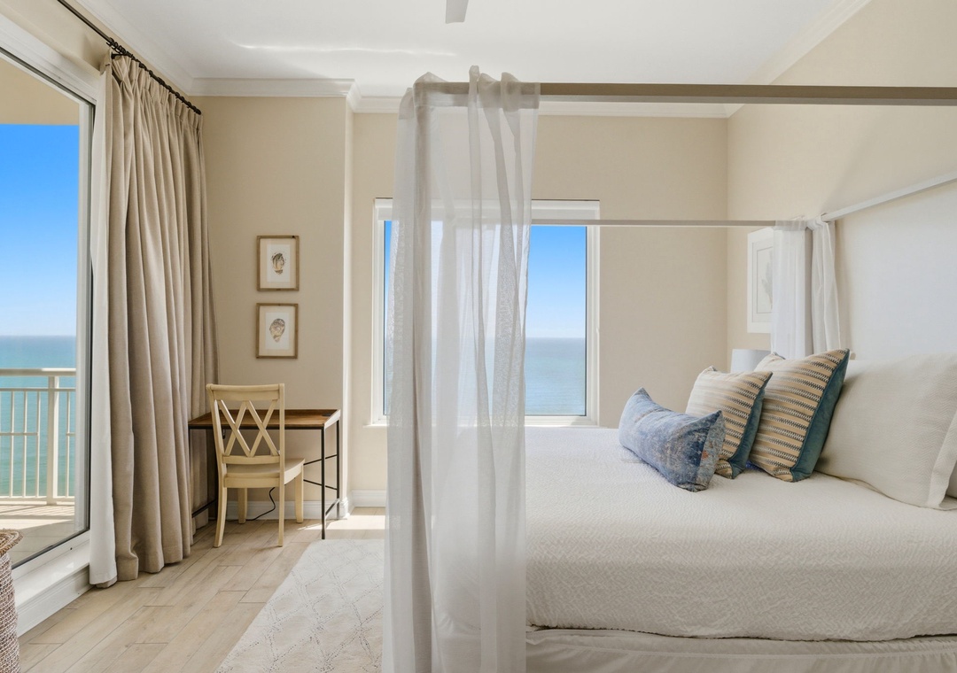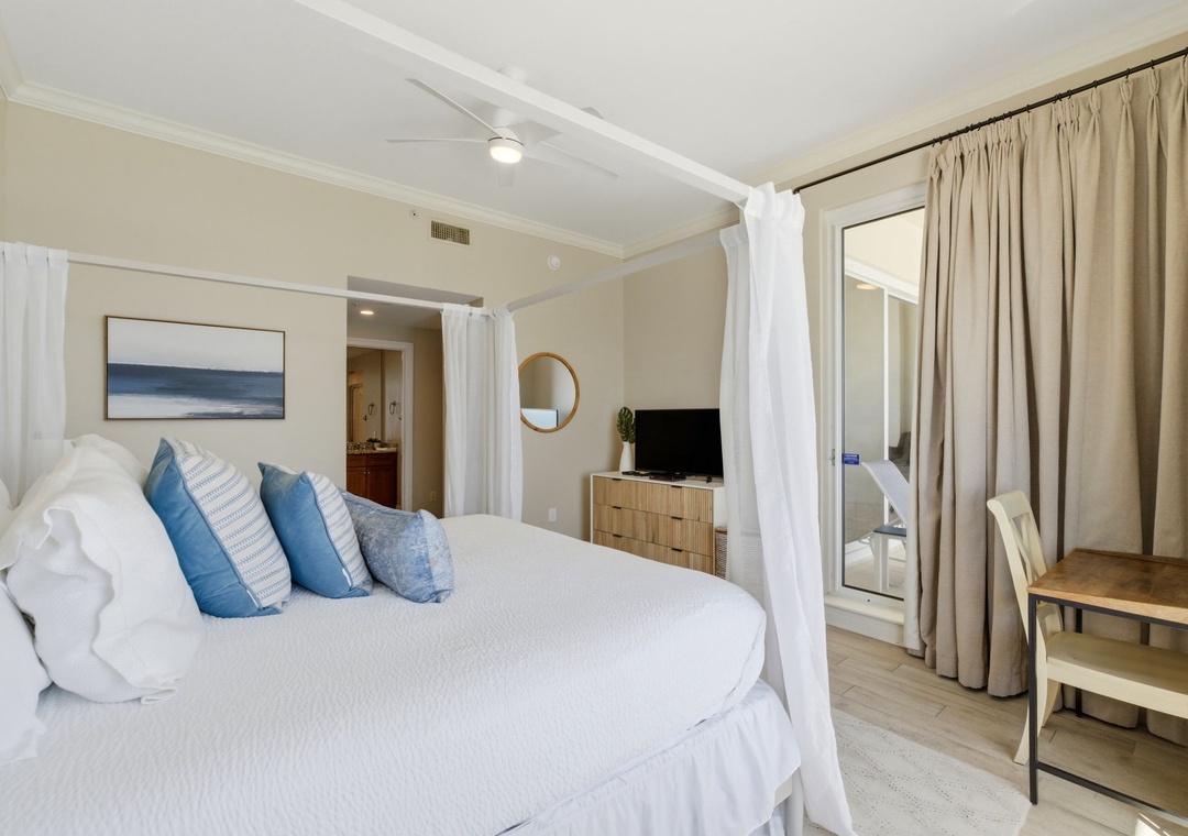The luxury kitchen is fully equipped with upgraded stainless appliances and all of the cookware needed to craft a delicious meal. The dining table offers seating for 6, and there is additional seating at the breakfast bar. The Gulf-front master suite boasts hardwood floors, a premium king mattress, luxury linens, a flat-screen TV, and balcony access with incredible Gulf views. The master bath includes double vanities with granite countertops, and a glass walk-in shower. The second suite is equally impressive, with a king bed, luxury bedding, a flat-screen TV, and access to the north balcony with stunning views of Old River and the Intracoastal Waterway. Don't miss out on this perfect coastal getaway—book Indigo East 2003 today!