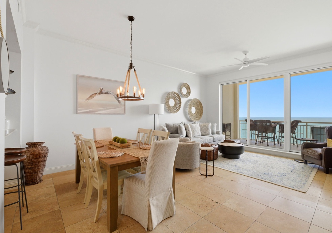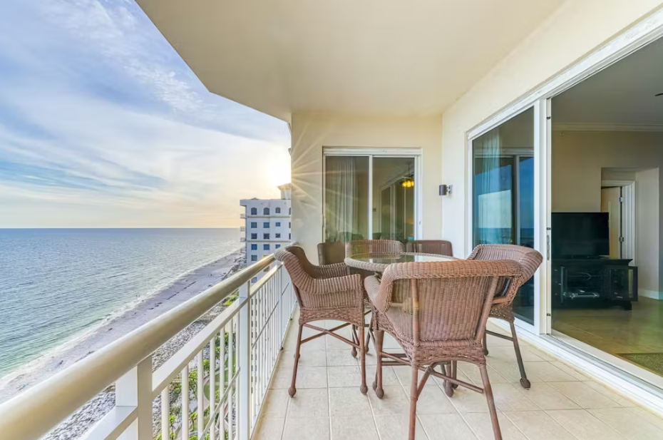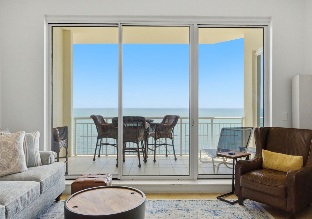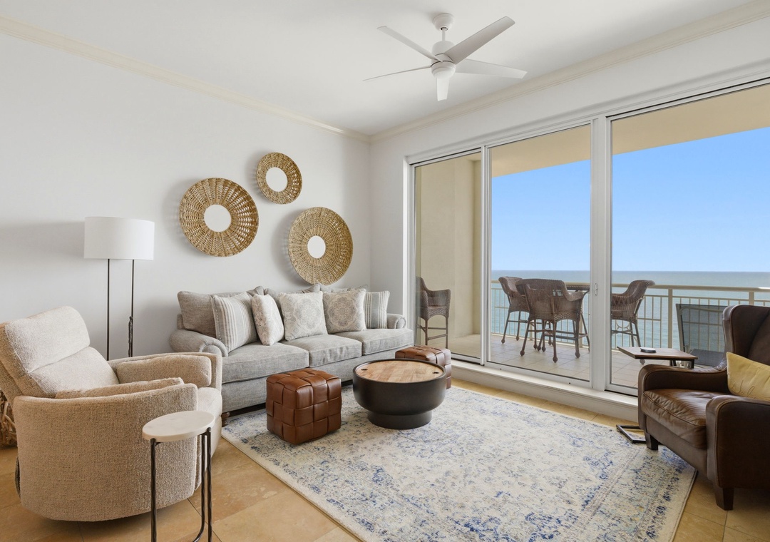Experience your dream vacation in this stunning 2-bedroom, 2-bath, 20th-floor Indigo condo, offering over 1,600 square feet of beach-chic luxury. This coastal retreat exudes a spa-like atmosphere. The living room features a plush sofa, cushioned chairs, and a large smart TV, with floor-to-ceiling sliding glass doors that open to a spacious beachfront balcony, perfect for enjoying the breathtaking Gulf views from your private terrace.
