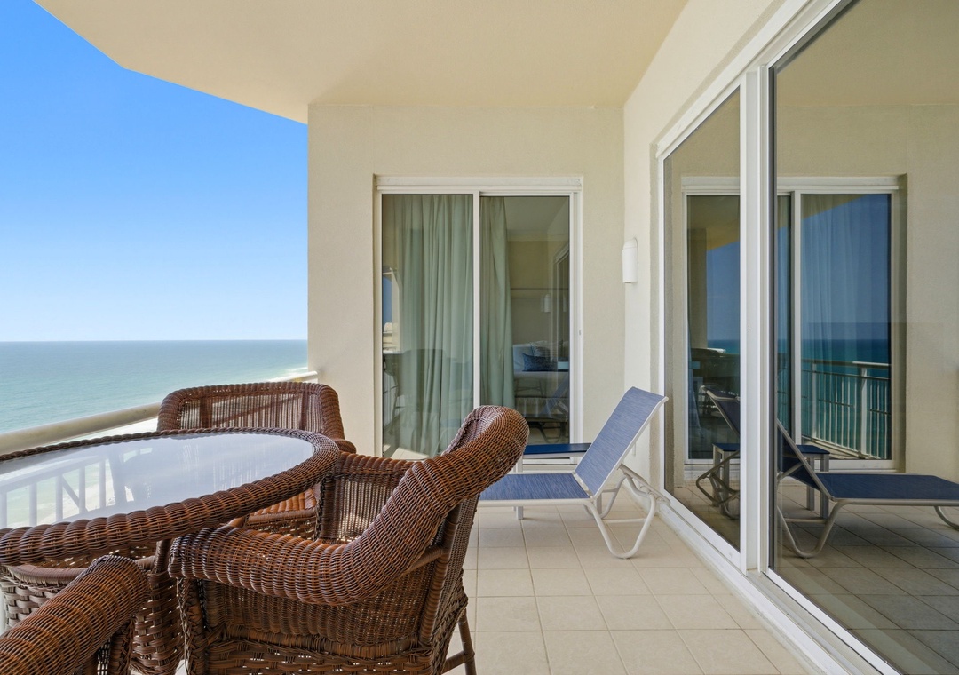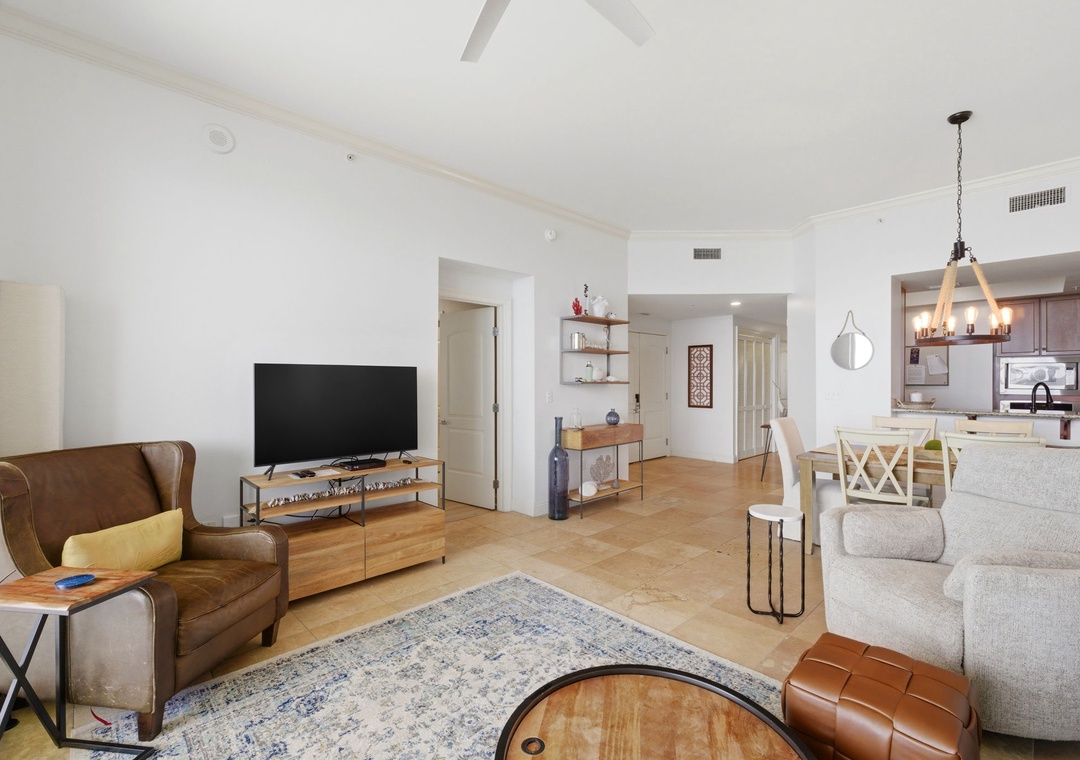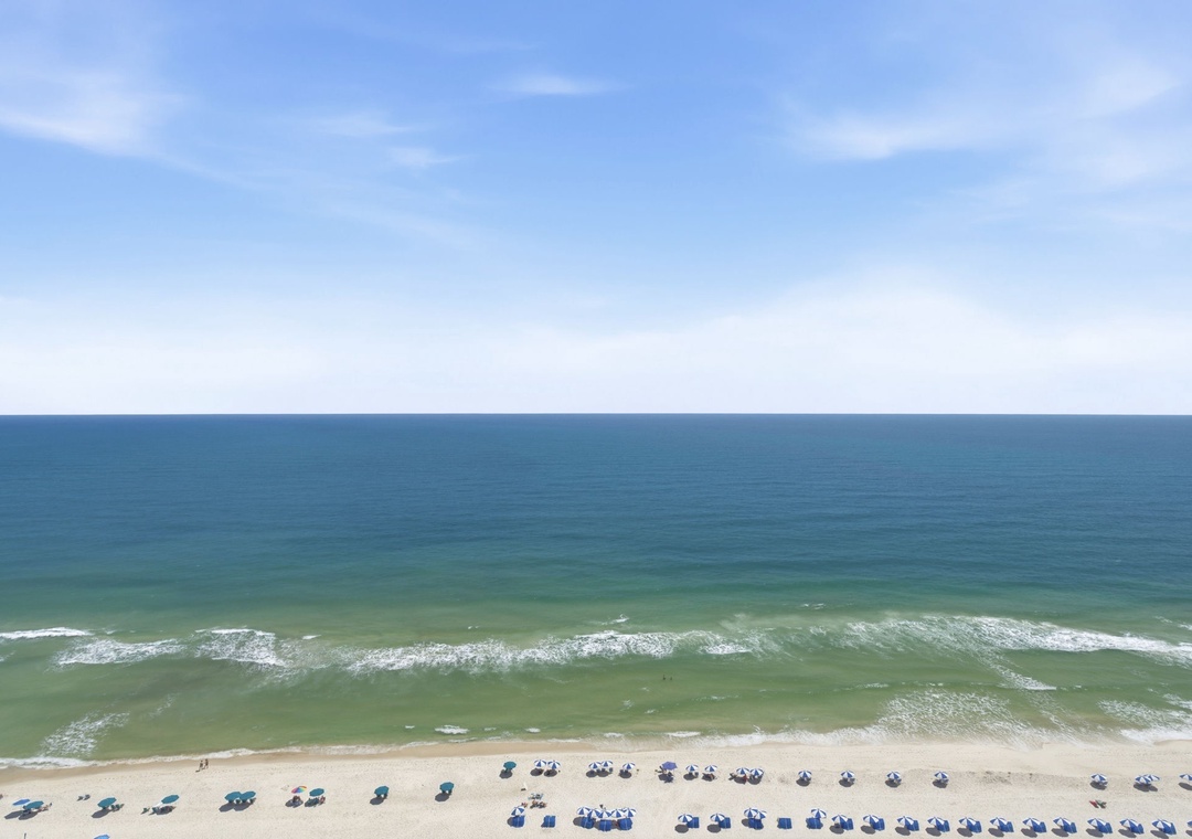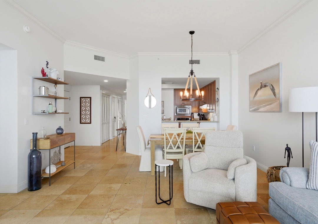 Experience your dream vacation in this stunning 2-bedroom, 2-bath, 20th-floor Indigo condo, offering over 1,600 square feet of beach-chic luxury. This coastal retreat exudes a spa-like atmosphere. The living room features a plush sofa, cushioned chairs, and a large smart TV, with floor-to-ceiling sliding glass doors that open to a spacious beachfront balcony, perfect for enjoying the breathtaking Gulf views from your private terrace.
