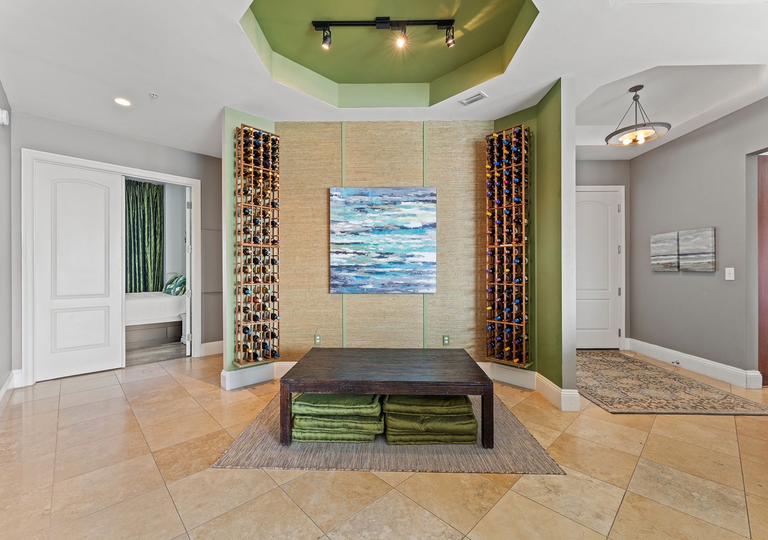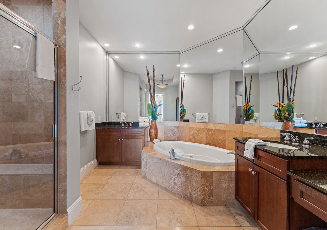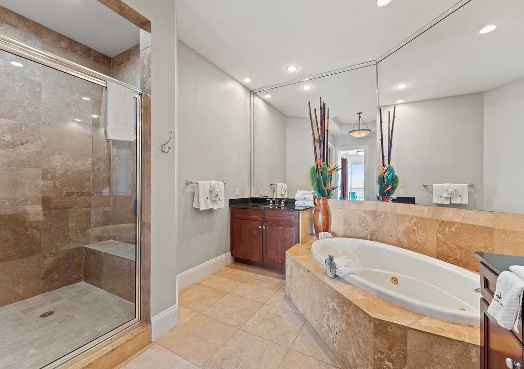 The grand master suite offers a king bed, sitting area, beachfront balcony access, and an opulent ensuite bath with a jetted tub, walk-in travertine shower, and double vanities. Each of the additional king bedrooms has its own private bath and balcony access, ensuring comfort and privacy for all guests. As an added perk, this penthouse includes exclusive access to a private poolside cabana with air conditioning, a bath, a bar area, and a lanai, plus garage parking for two cars. Experience the ultimate in style, relaxation, and coastal beauty at Indigo Resort!