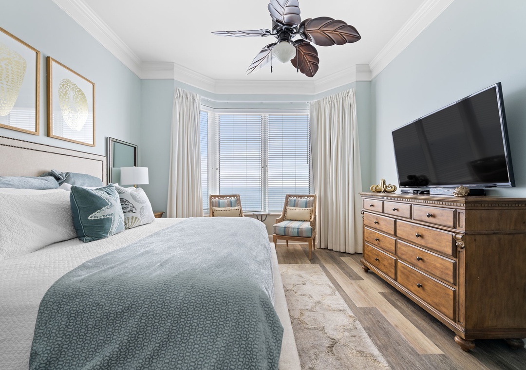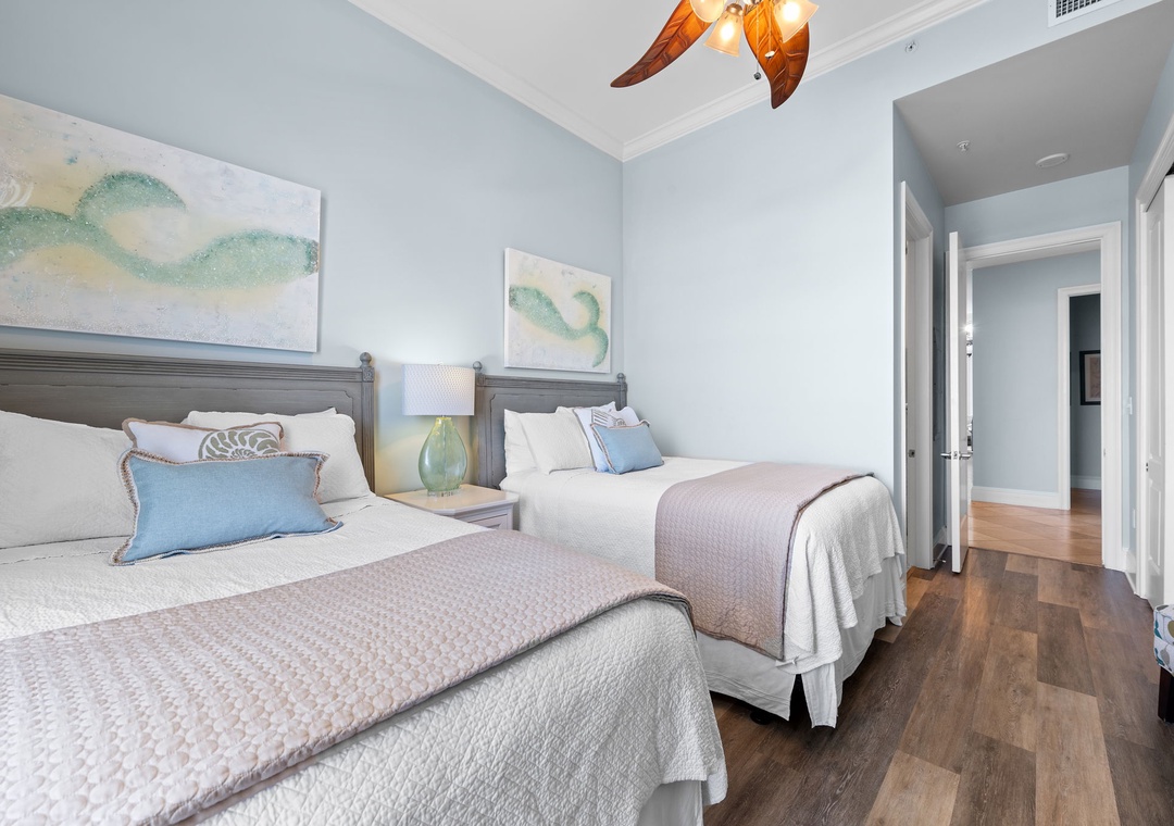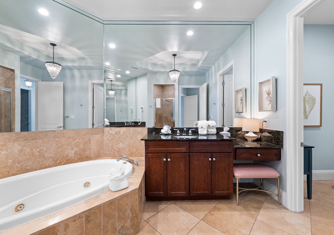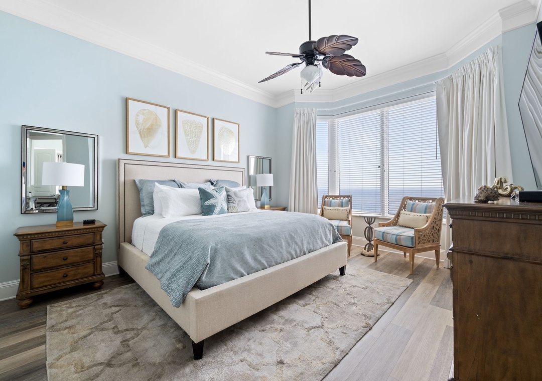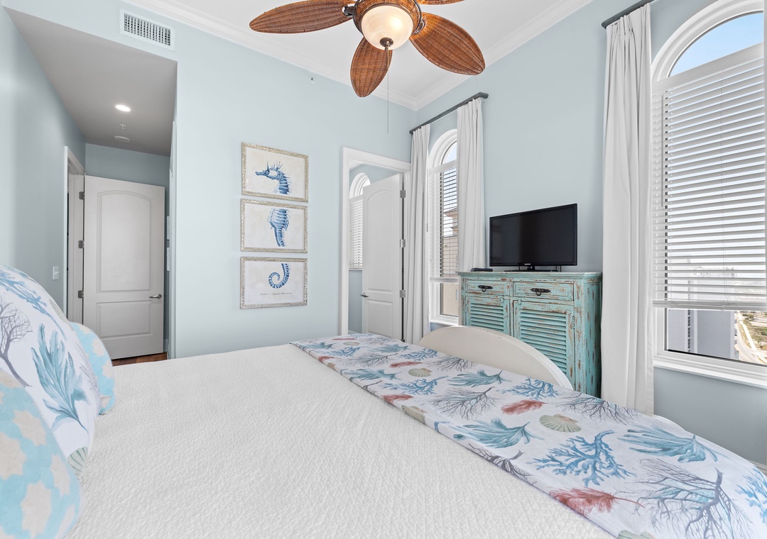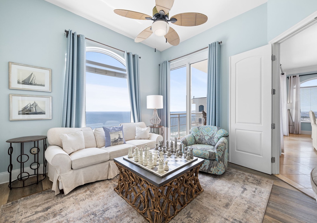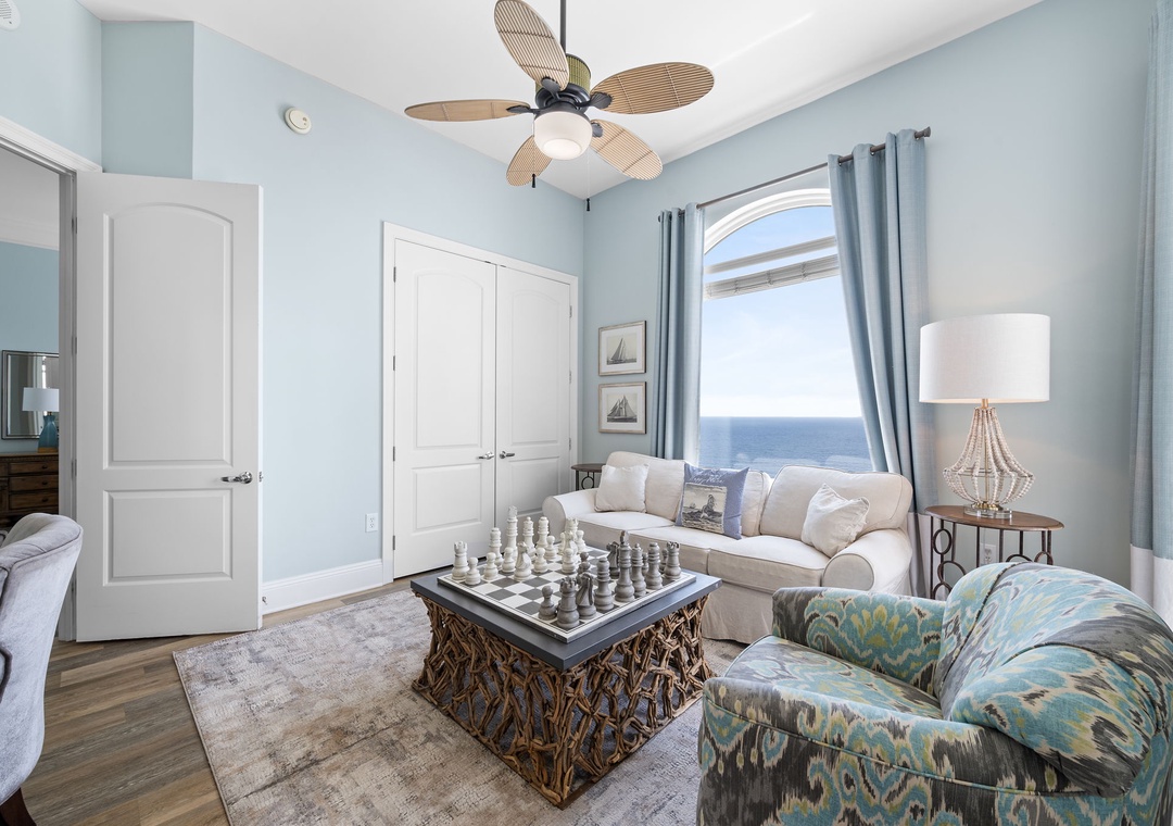 The master suite offers a luxurious retreat with a king bed, walk-in closet, and an ensuite bathroom featuring a jetted garden tub, walk-in travertine shower, and double vanities. Each of the additional bedrooms also includes private baths, with two king beds and two full beds spread across the rooms, ensuring ample space for up to 12 guests. This penthouse also includes a bonus den with a queen sleeper sofa and a gaming station for entertainment. With private beach access, lavish amenities, and unparalleled views, this penthouse offers the perfect getaway for your next beach vacation!