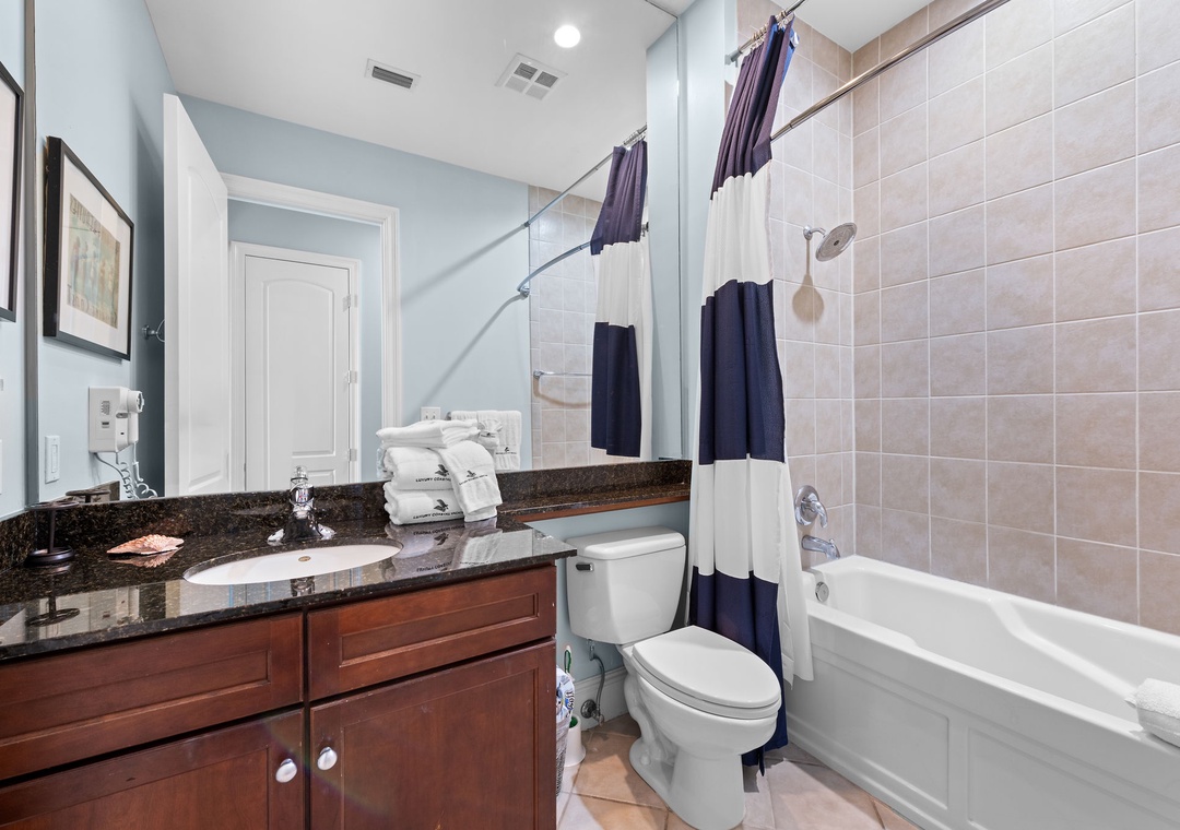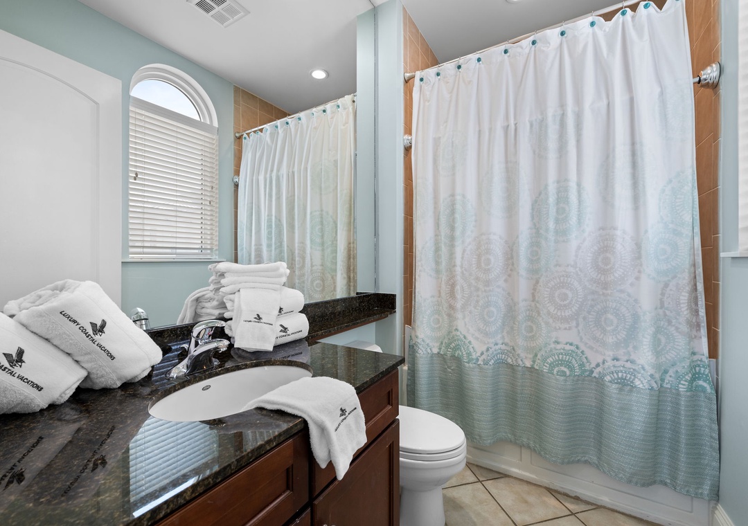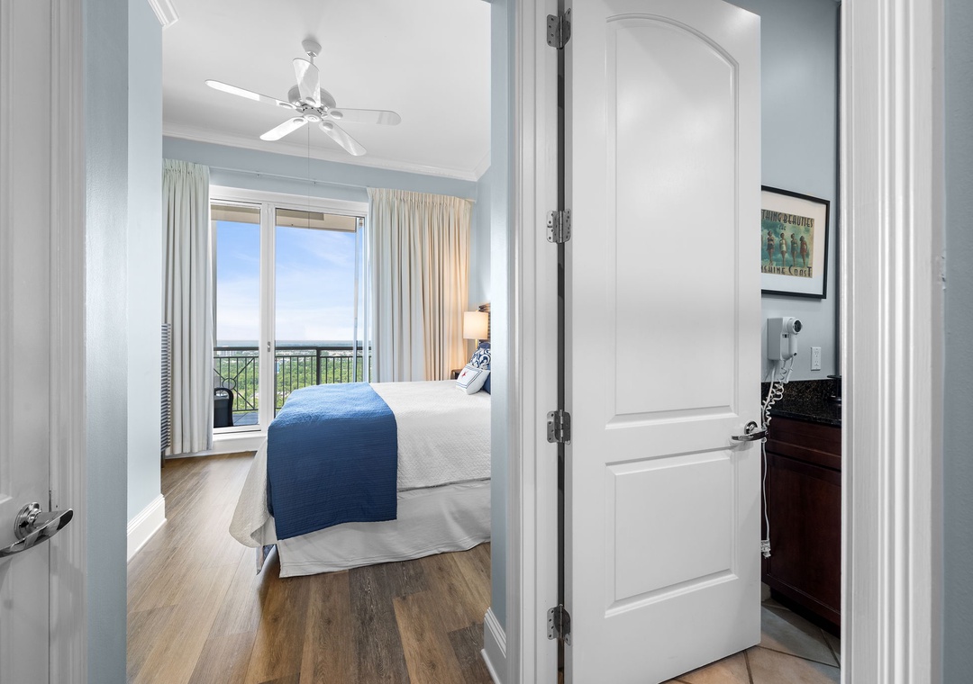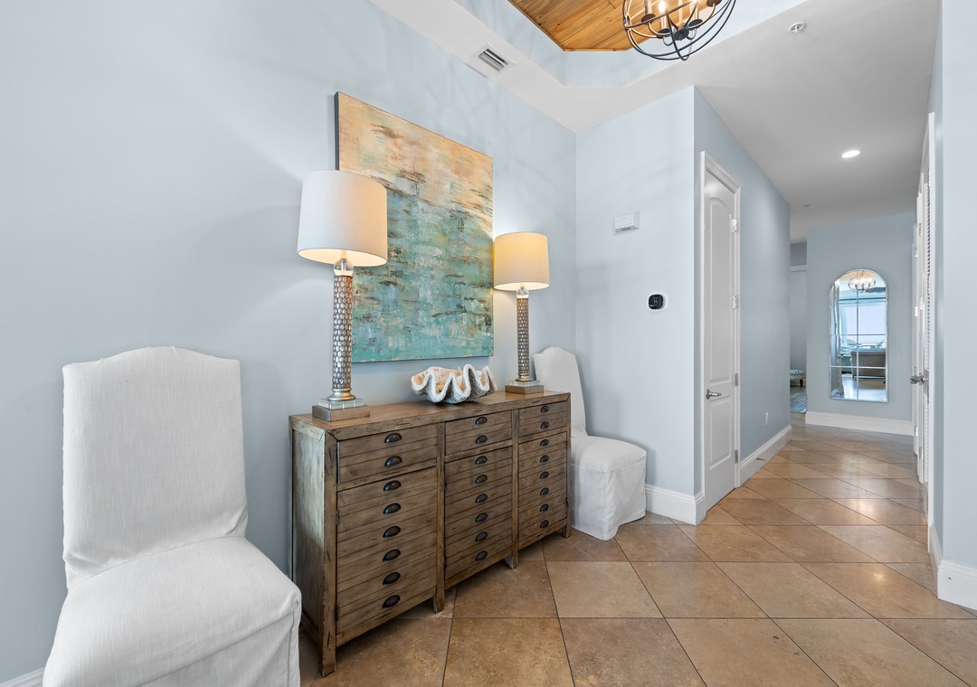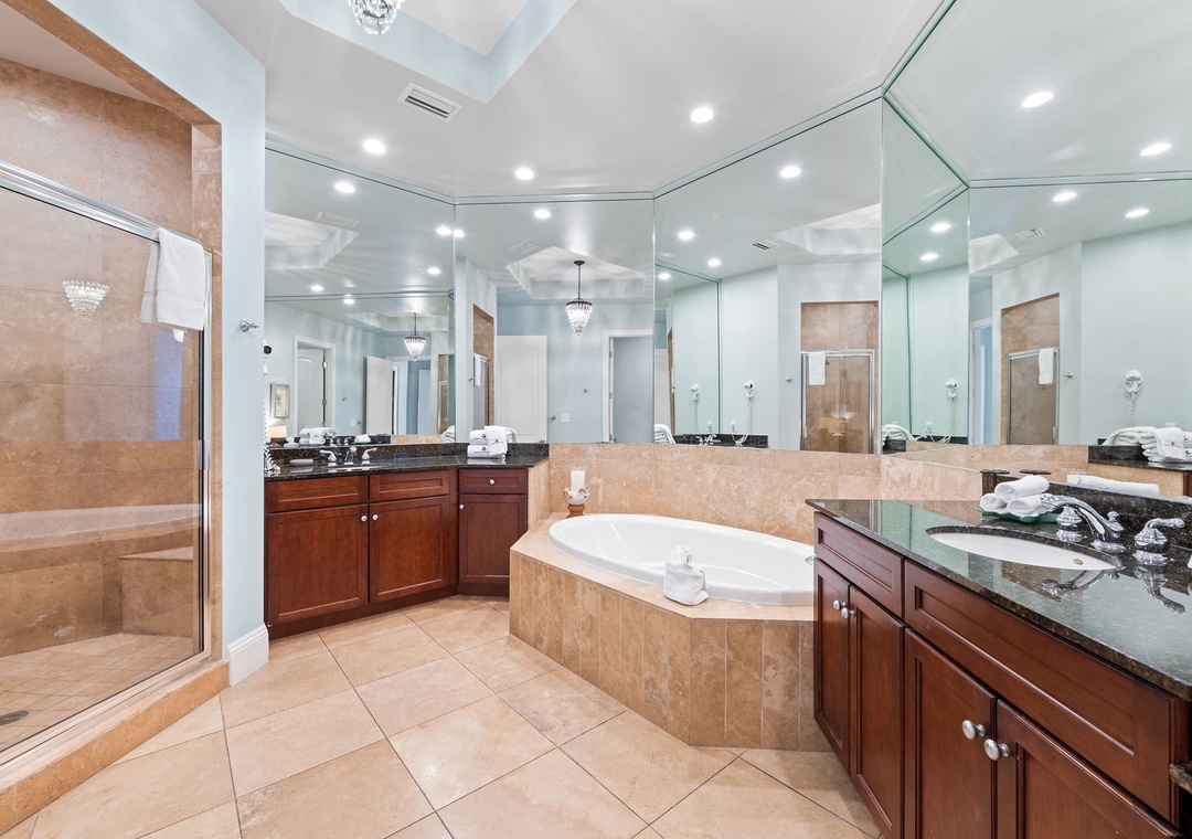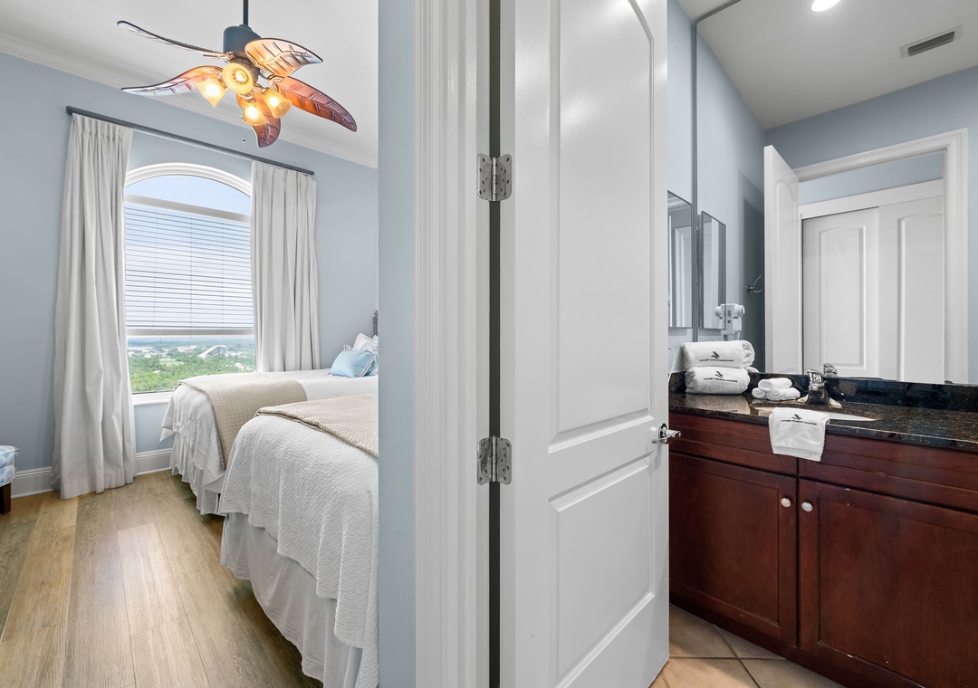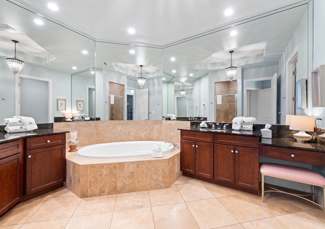 The master suite offers a luxurious retreat with a king bed, walk-in closet, and an ensuite bathroom featuring a jetted garden tub, walk-in travertine shower, and double vanities. Each of the additional bedrooms also includes private baths, with two king beds and two full beds spread across the rooms, ensuring ample space for up to 12 guests. This penthouse also includes a bonus den with a queen sleeper sofa and a gaming station for entertainment. With private beach access, lavish amenities, and unparalleled views, this penthouse offers the perfect getaway for your next beach vacation!