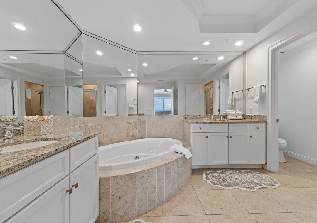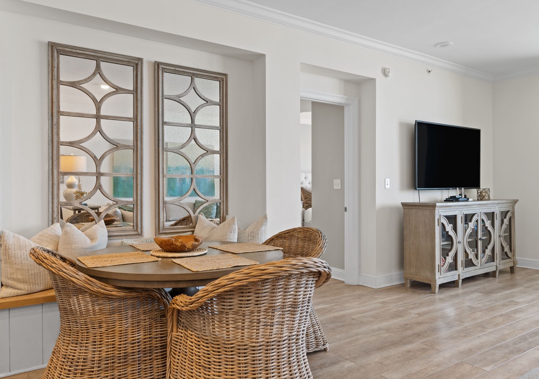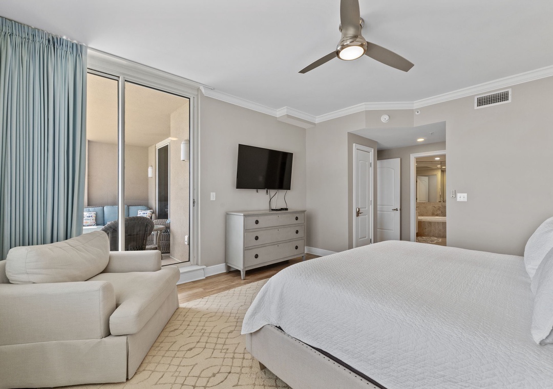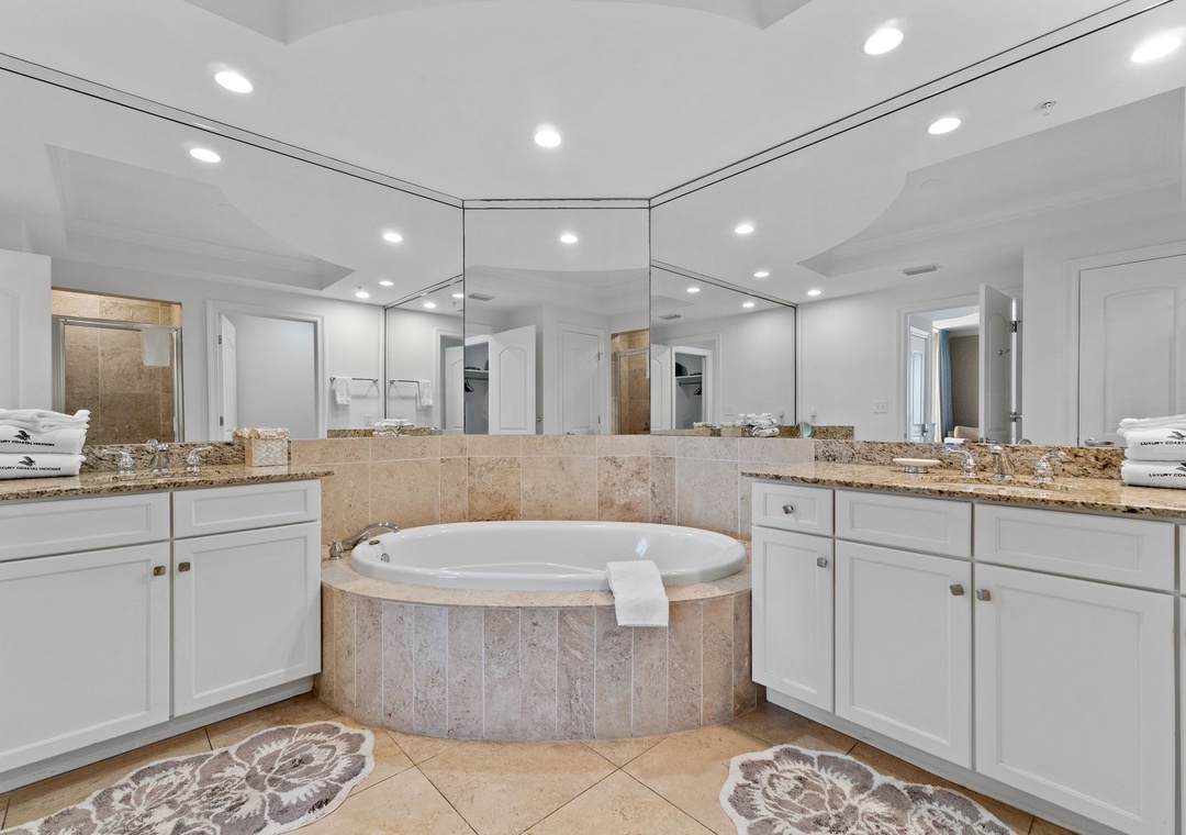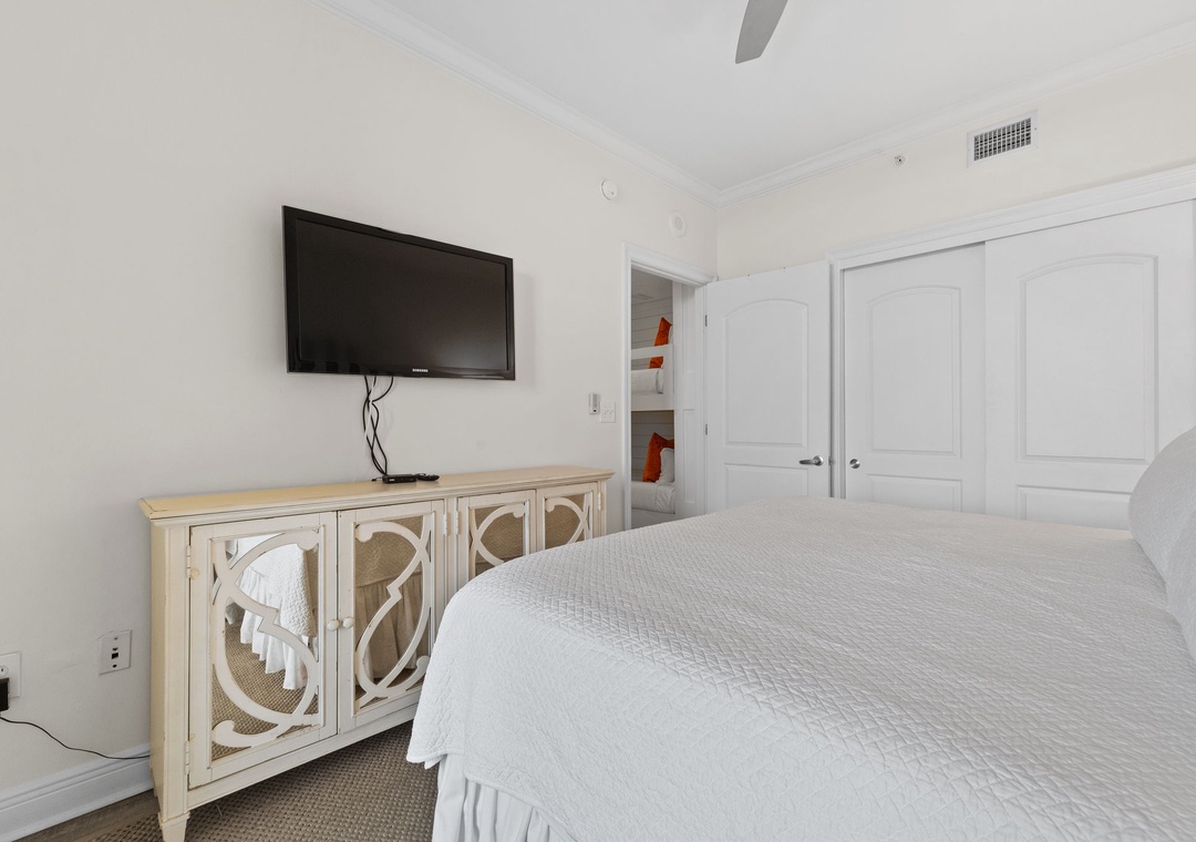 The primary suite offers a plush king bed, flat-screen TV, and balcony access, while the spa-like bathroom features a jetted garden tub, walk-in glass shower, and twin vanities. The guest bedrooms are equally inviting, both with premium king mattresses, flat-screen TVs, and attached baths.. There is also a twin over twin bunk alcove, allowing this unit to comfortably accommodate up to 8 guests.