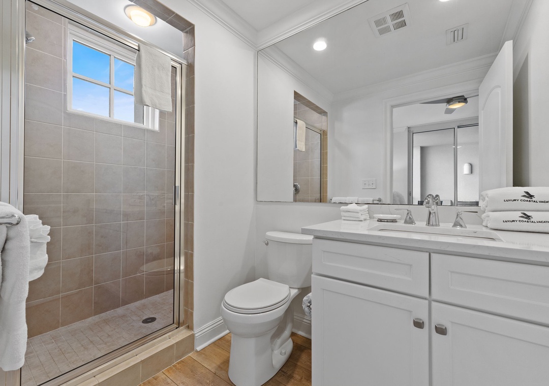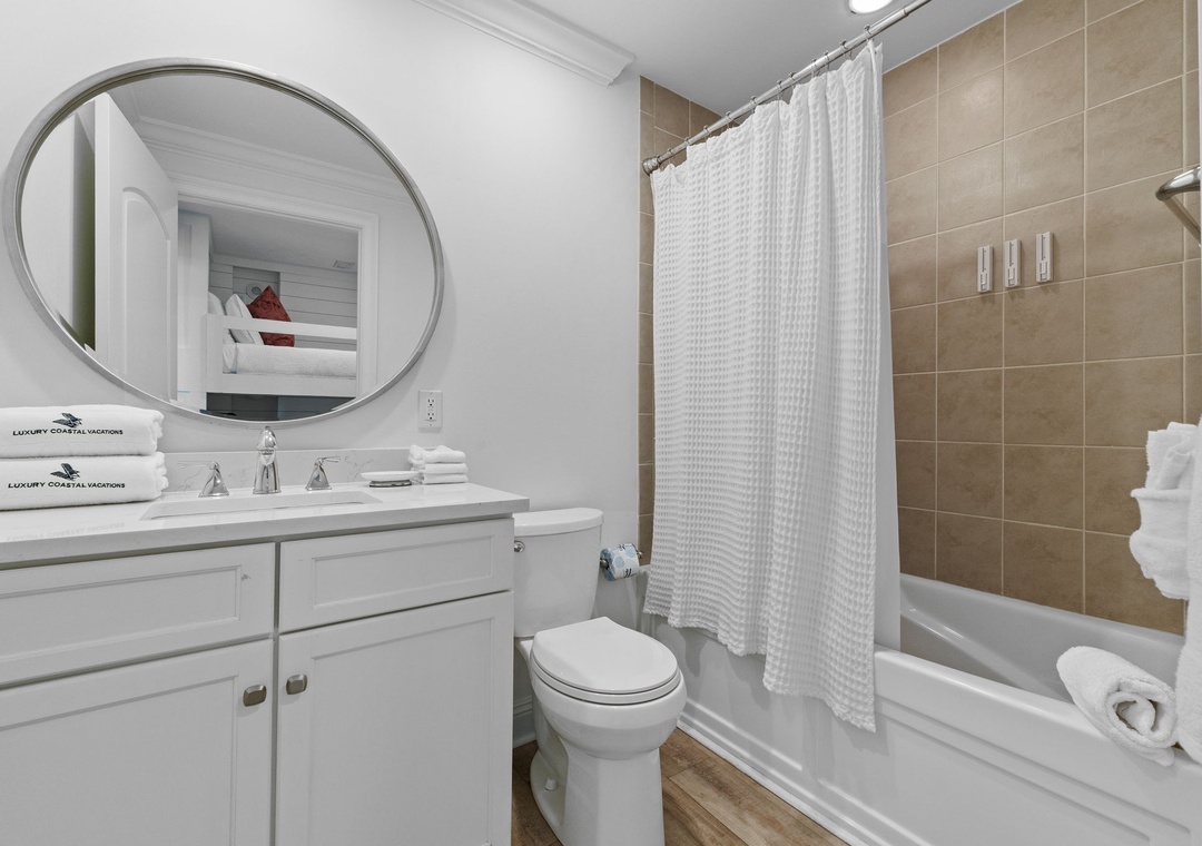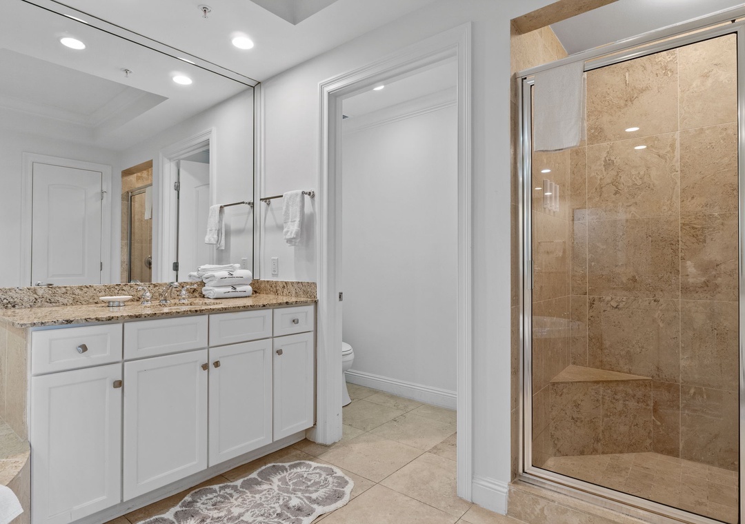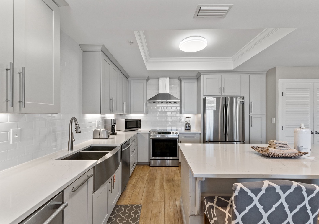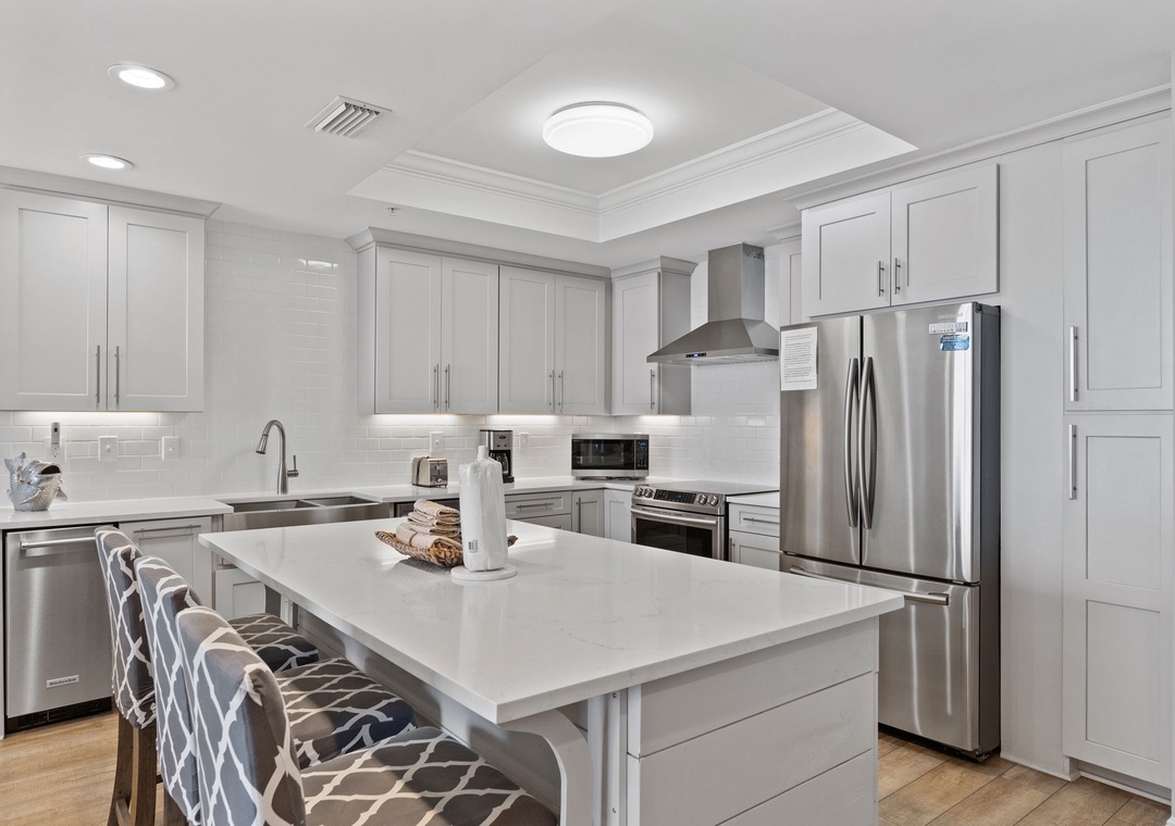 The primary suite offers a plush king bed, flat-screen TV, and balcony access, while the spa-like bathroom features a jetted garden tub, walk-in glass shower, and twin vanities. The guest bedrooms are equally inviting, both with premium king mattresses, flat-screen TVs, and attached baths.. There is also a twin over twin bunk alcove, allowing this unit to comfortably accommodate up to 8 guests.