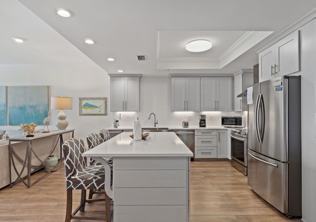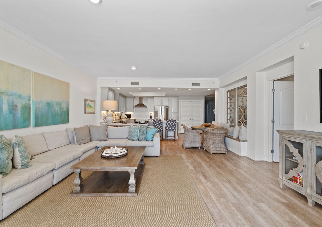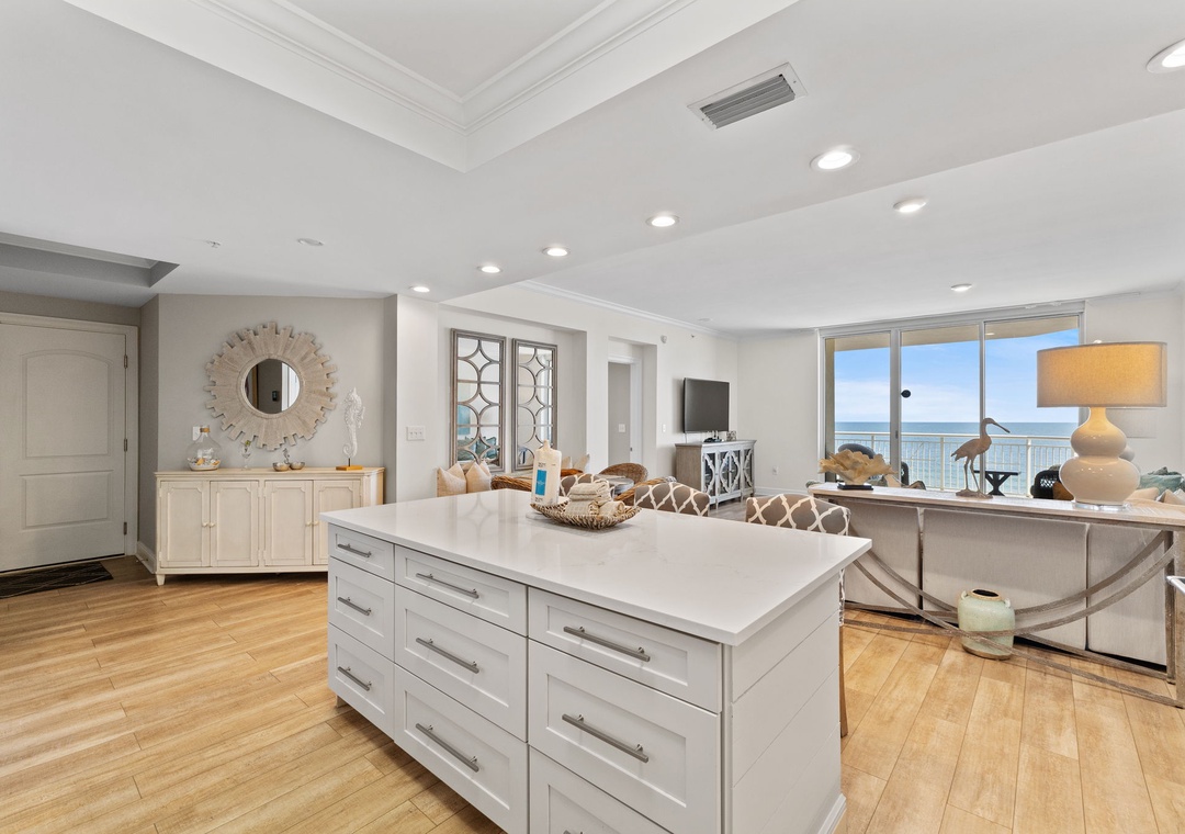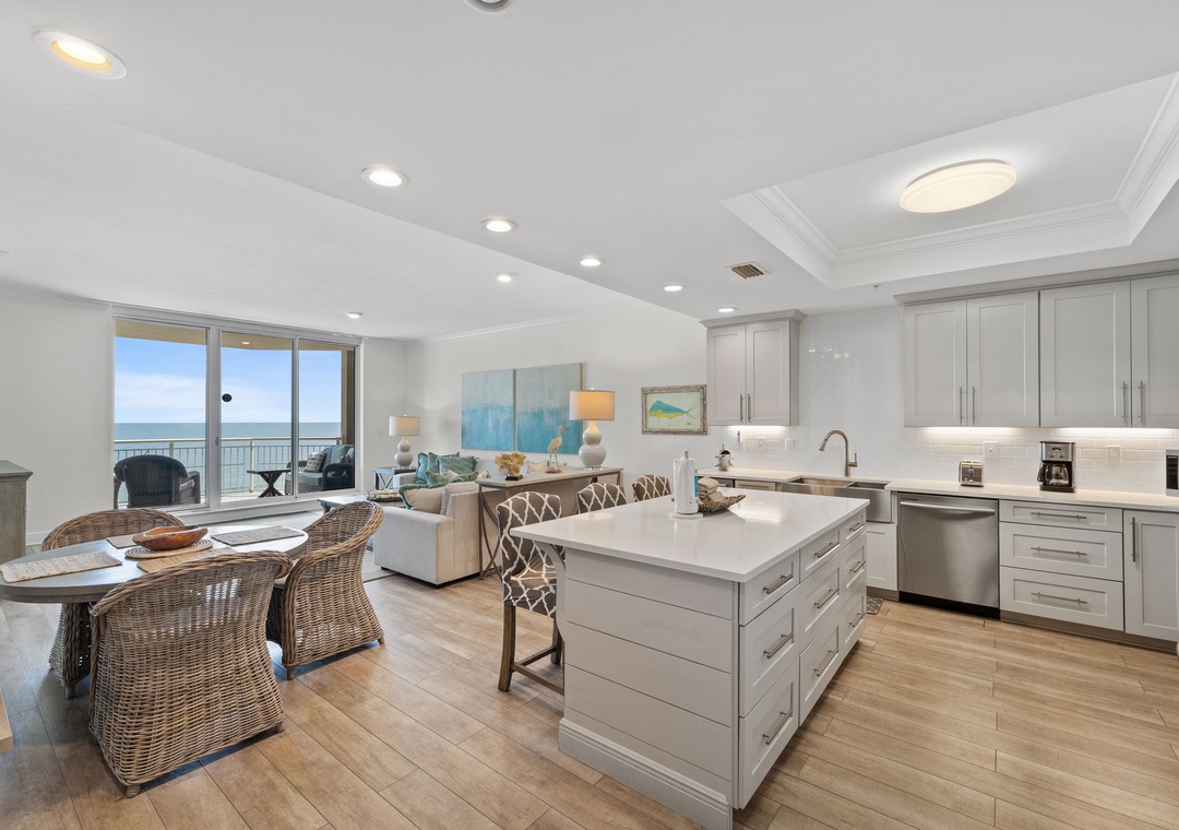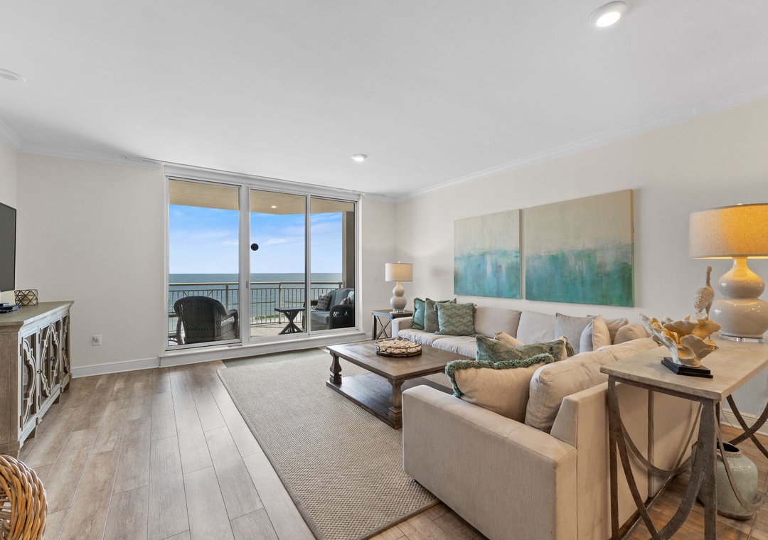 Step into luxury in this beautiful 6th-floor, 3-bedroom, 3-bath condo, offering nearly 2,000 square feet of contemporary comfort. Nautically inspired décor enhances the modern living area, which features a cozy sectional sofa, a large flat-screen TV, and floor-to-ceiling sliding glass doors that open to a beachfront balcony. Let the gentle waves and coastal breeze wash over you as you relax in this serene retreat.