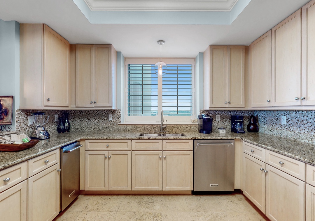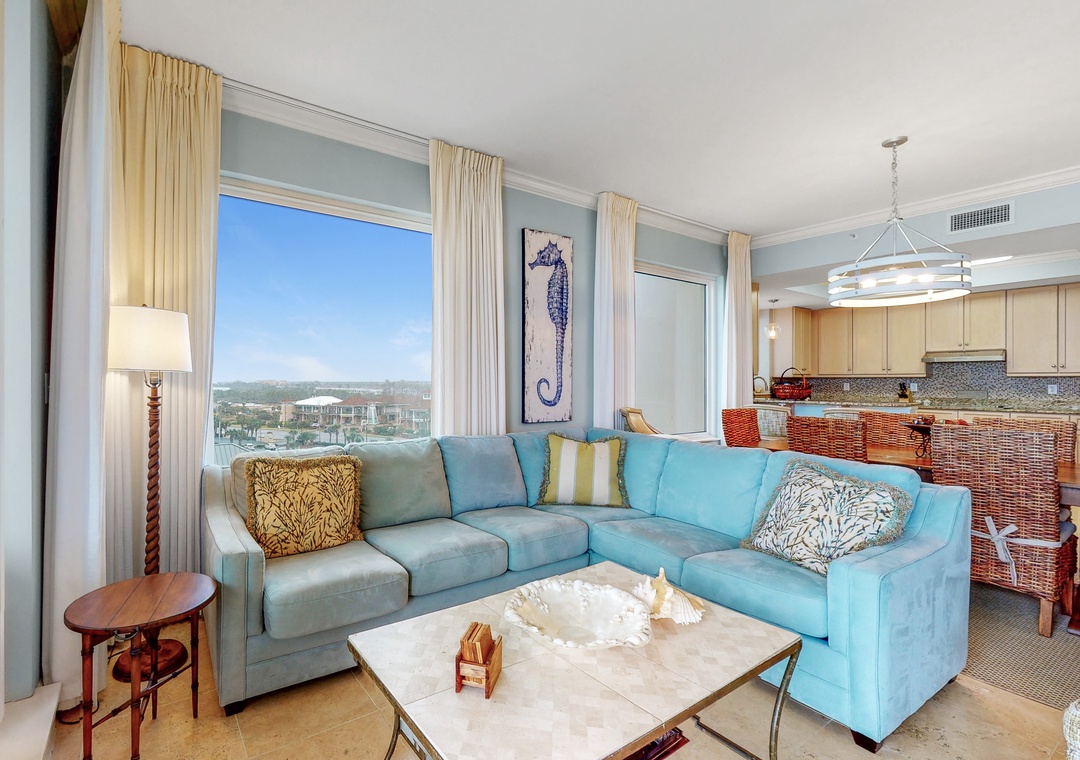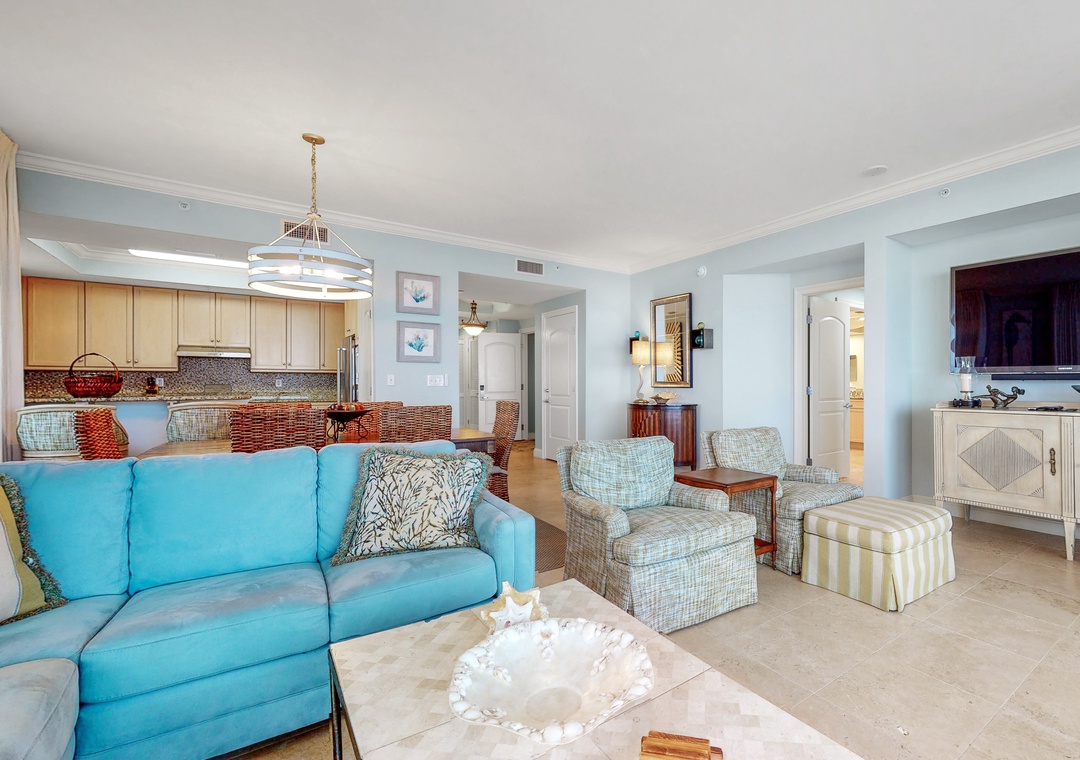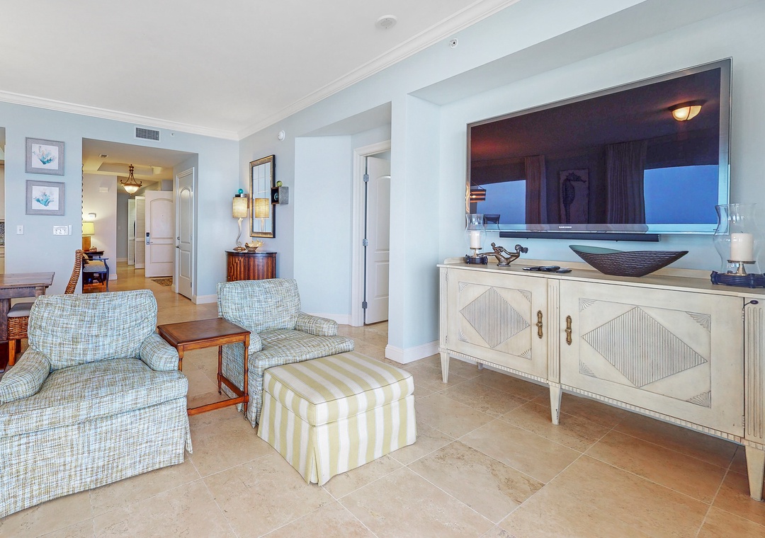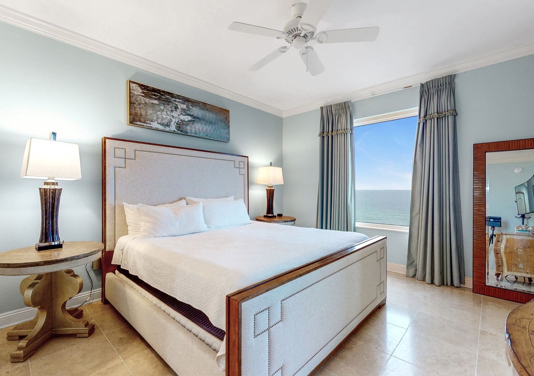 The living room features floor-to-ceiling glass doors that open to an expansive Gulf-front terrace, inviting you to relax and enjoy the refreshing sea breeze. The gourmet kitchen is equipped with granite countertops, custom cabinetry, and stainless-steel appliances, perfect for preparing meals, with a dining area that seats six. The master suite boasts a king bed and attached bath, while the second bedroom also has a king bed, and the remaining two offer queen beds. A queen sleeper sofa in the living room accommodates up to 10 guests. With a full-size washer and dryer and plush oversized bath towels, this Indigo unit promises a luxurious and comfortable stay in Perdido Key.