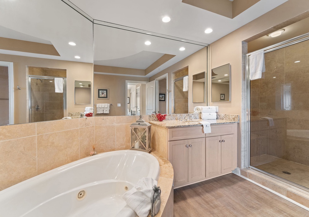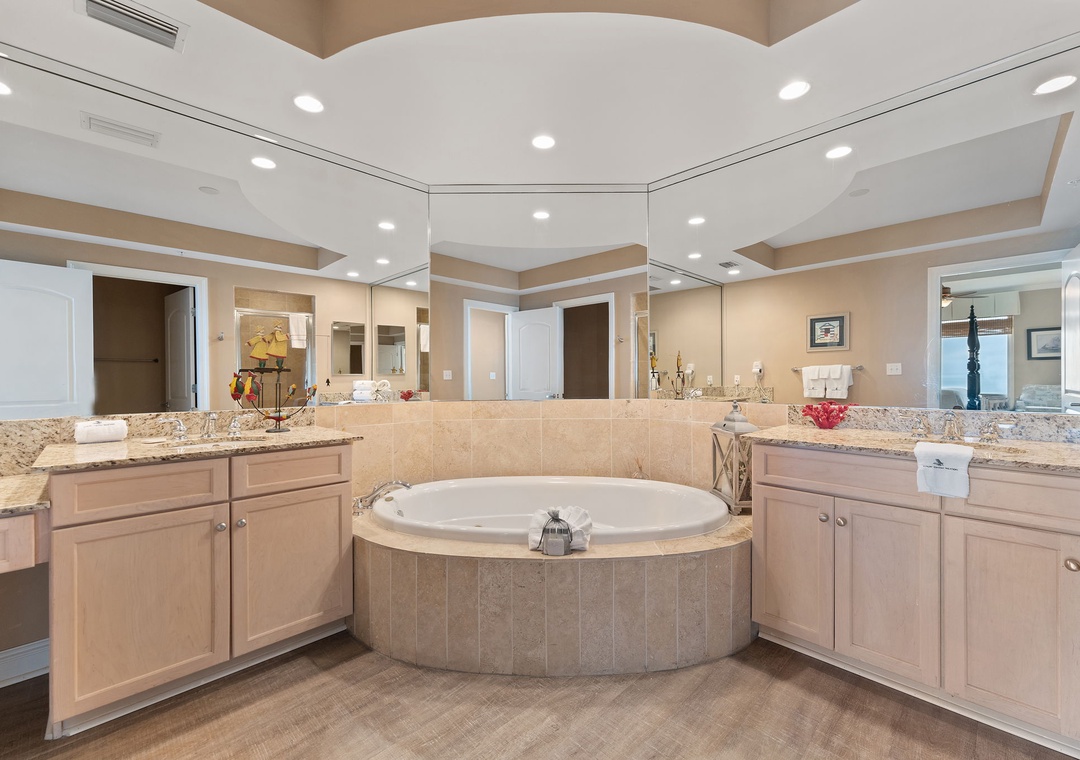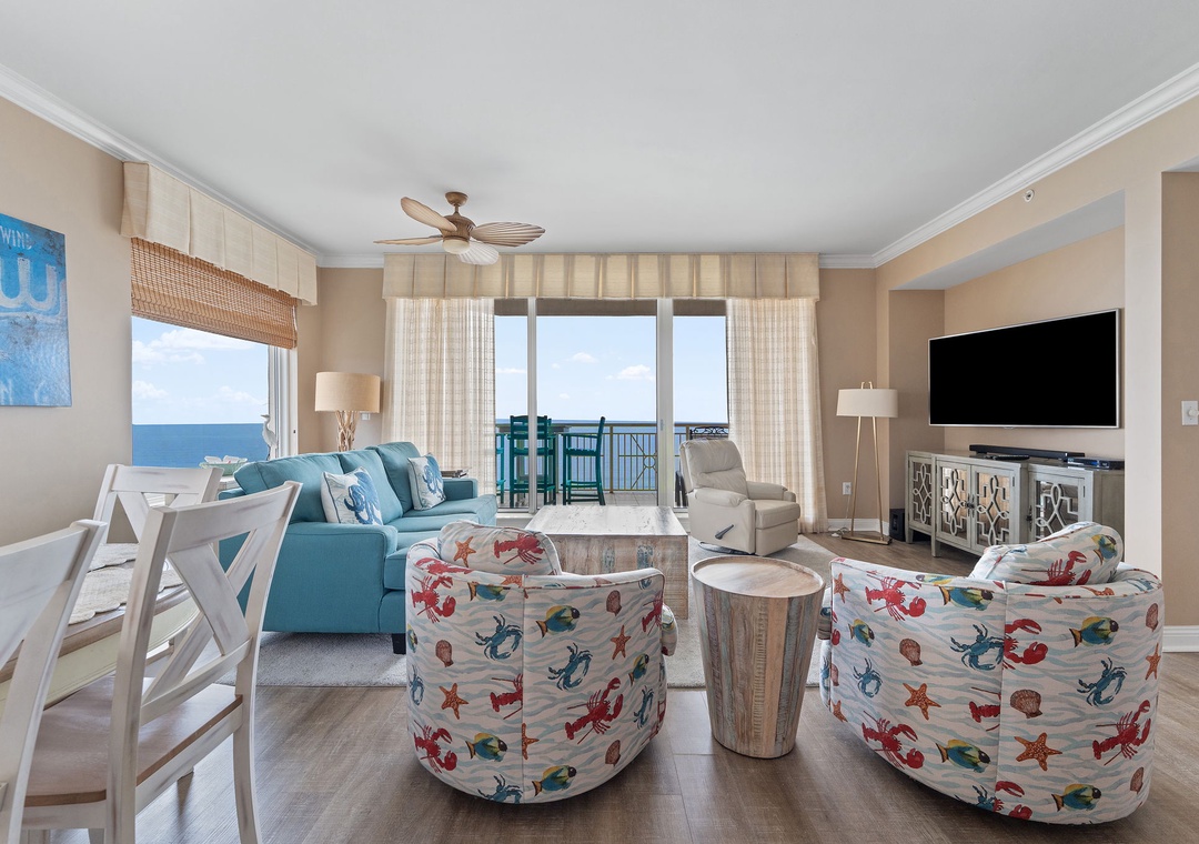 The gourmet kitchen is a chef's dream, boasting GE Profile appliances, granite countertops, custom wood cabinetry, and a breakfast bar. The dining room comfortably seats six, while the bonus den provides additional sleeping space with a queen sleeper sofa and a large HDTV, making it a perfect hangout for kids or teens. The oversized gulf-front balcony invites you to relax with chaise loungers and an outdoor dining table for four, perfect for morning coffee or al fresco dining. The master suite features a king-size bed, luxurious linens, and a glamorous attached bath with a jetted garden tub and separate glass shower. With plush bedding and flat-screen TVs in every bedroom, this Indigo unit offers a perfect blend of luxury and comfort for the vacation of your dreams.