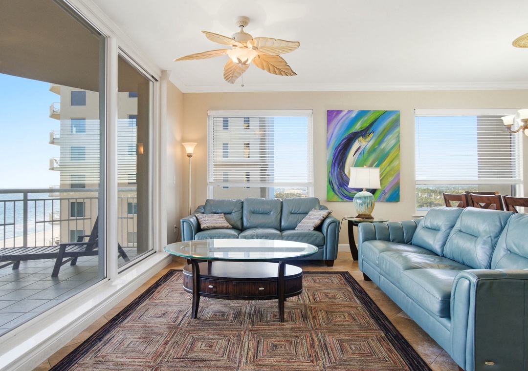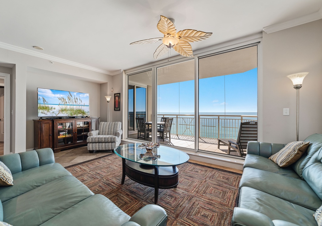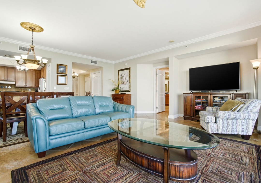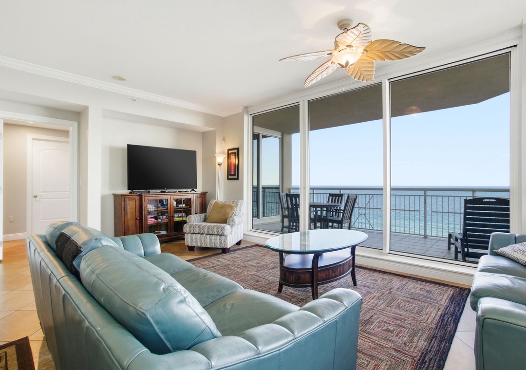 Make your dream vacation a reality in our beautifully decorated 9th-floor corner unit at Indigo East, featuring 4 bedrooms and 4 baths. Nestled on a pristine stretch of the Gulf Coast, this resort offers unparalleled luxury and style, with panoramic views of sugar-white sands and shimmering emerald waters that set the stage for an unforgettable getaway. The spacious open-concept layout combines elegance and comfort, highlighted by a living area with ample seating and a large flat-screen TV, all with direct access to the expansive Gulf-front balcony through floor-to-ceiling sliding glass doors.