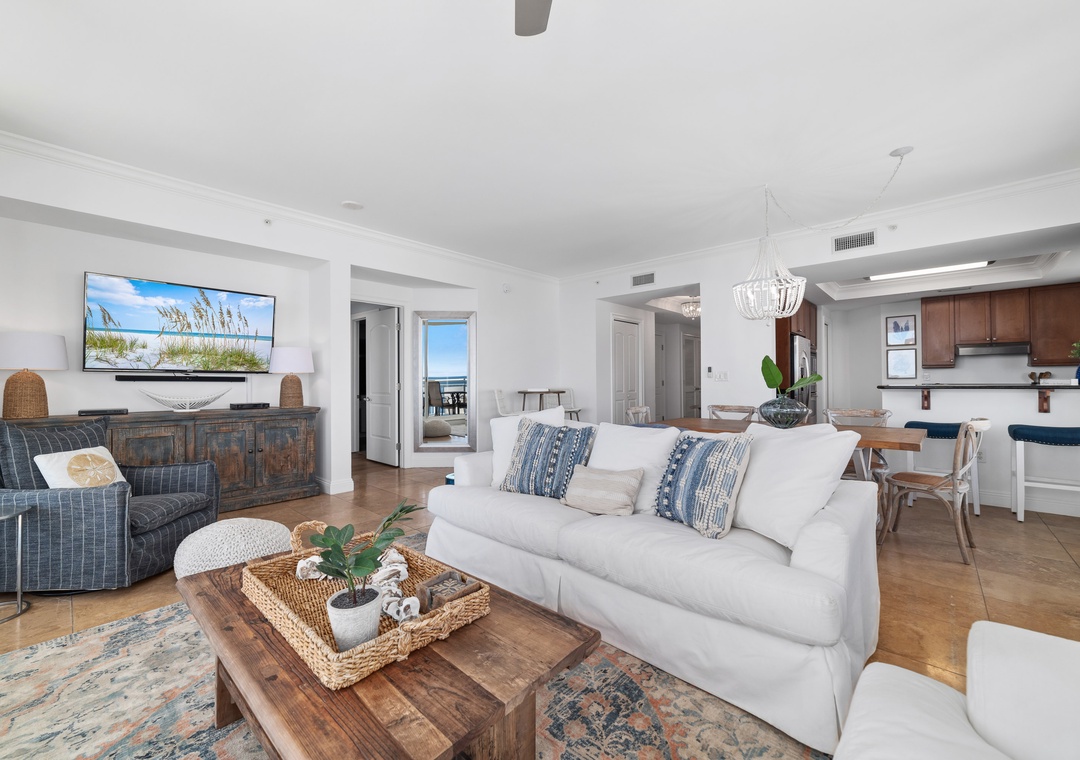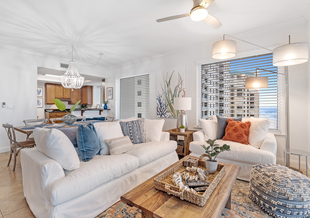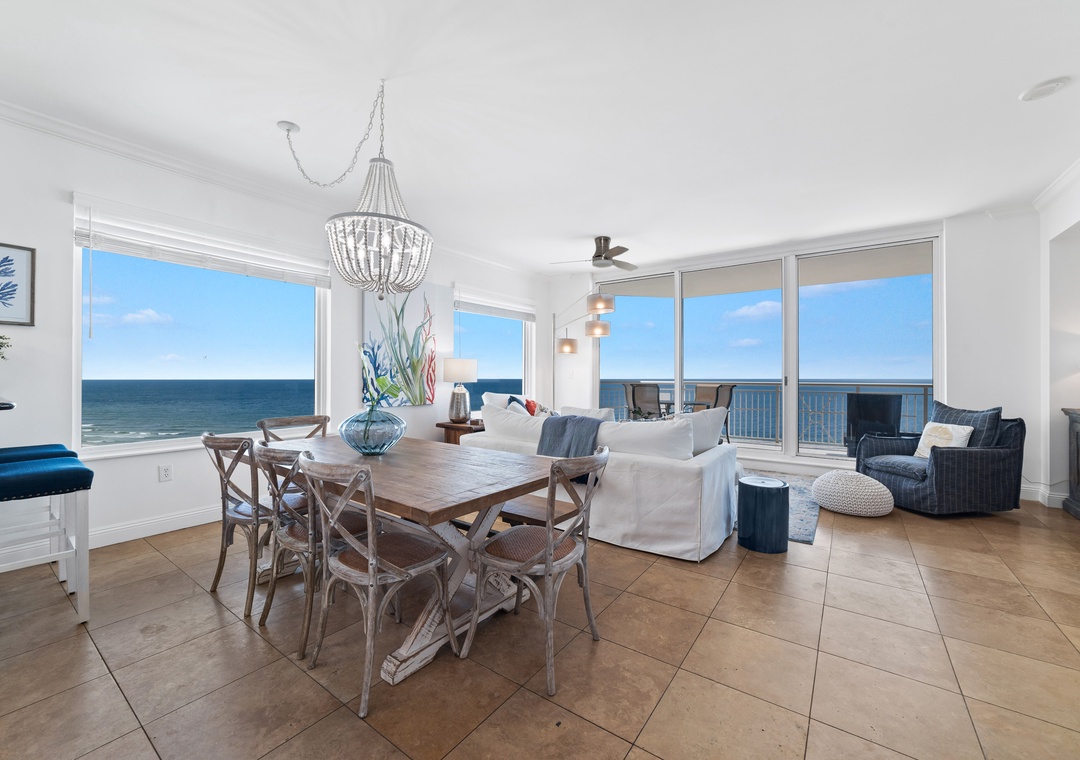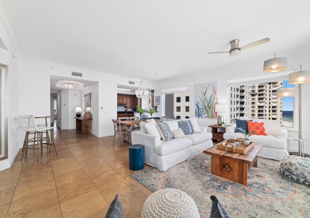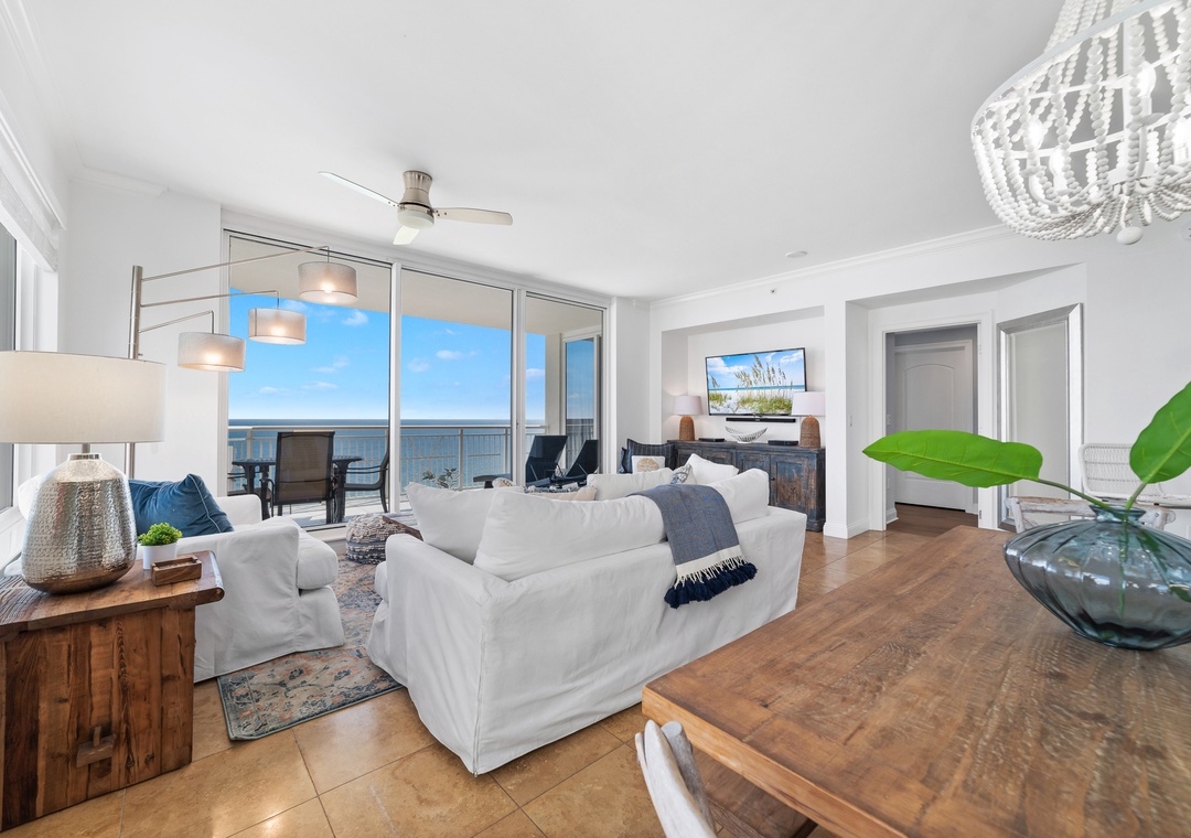 Completely renovated and styled in a modern coastal design, this 4-bedroom, 4-bath retreat on the 11th floor of Indigo West in Perdido Key offers the ultimate Gulf Coast getaway. Located in the highly sought-after East corner of the West tower, the unit boasts spectacular, unobstructed views of the shimmering coastline. The light and airy living space, with its clean white walls, blue accents, and rustic wood finishes, welcomes you with natural textures and a cozy atmosphere. The oversized living room features a plush sofa, love seat, and large screen TV, perfect for relaxing after a day at the beach. A dining area with seating for eight and a stunning wood bead chandelier offers a perfect space for family meals, while extra windows flood the unit with natural light. Step out onto the oversized balcony, complete with dining furniture and loungers, and enjoy breathtaking views from sunrise to sunset.