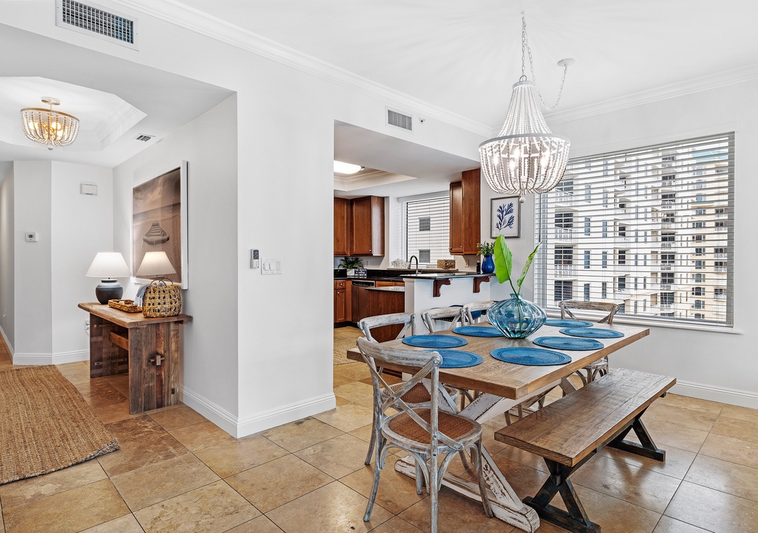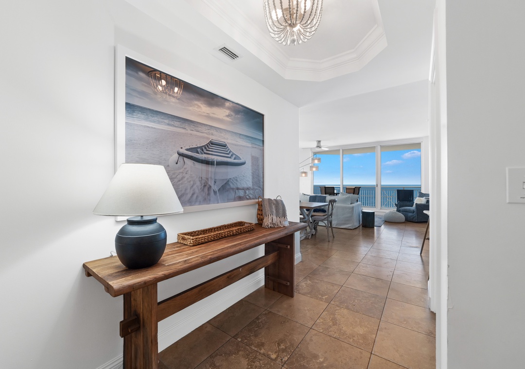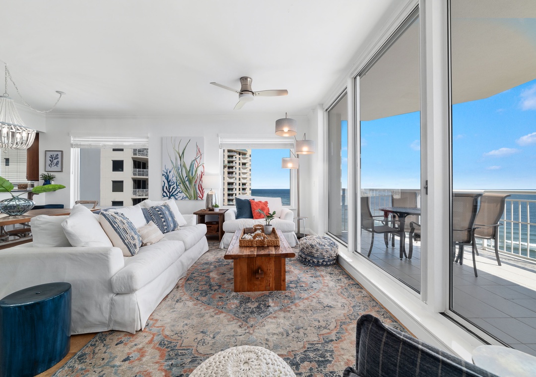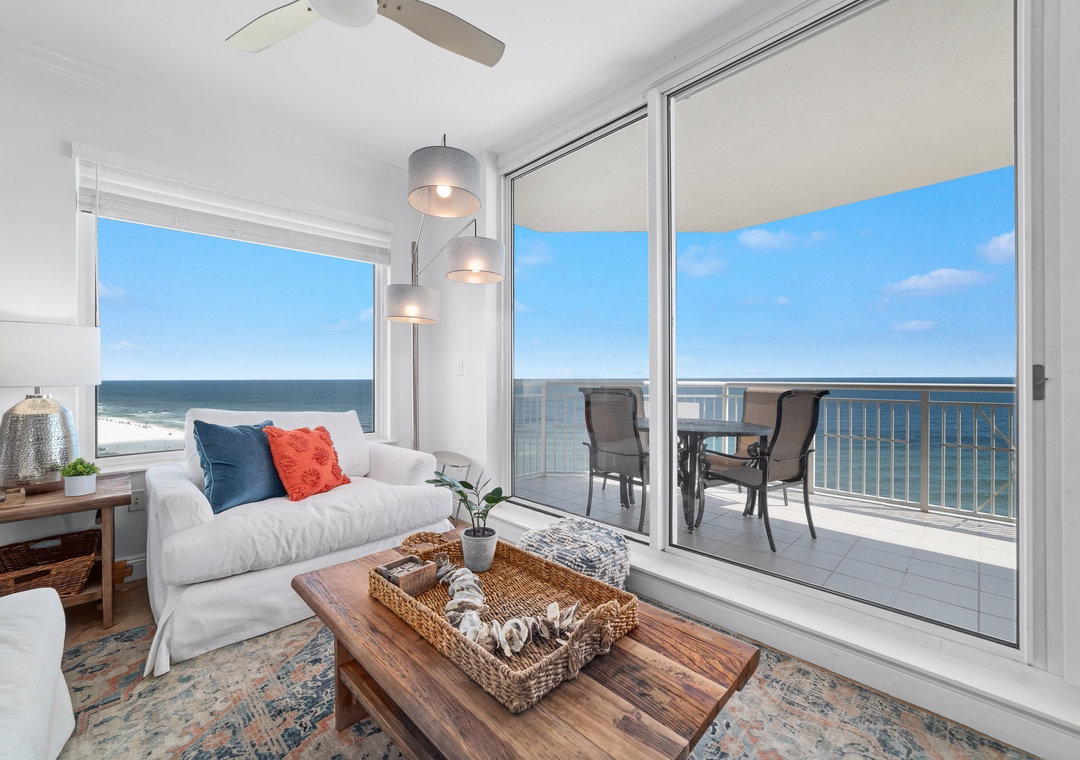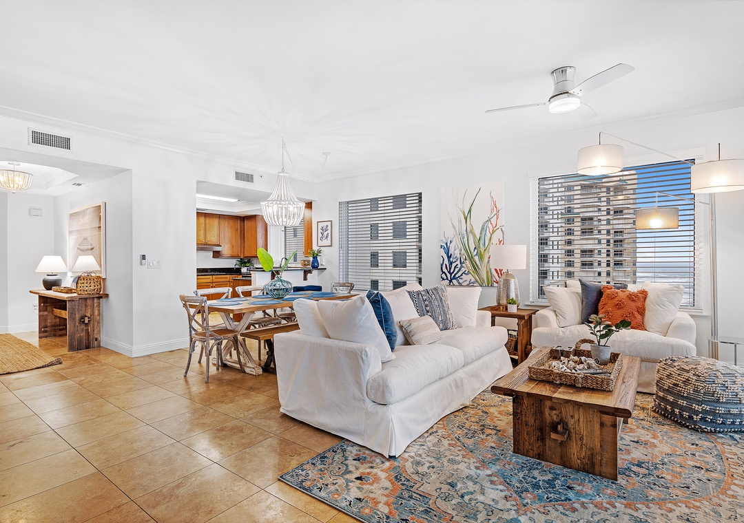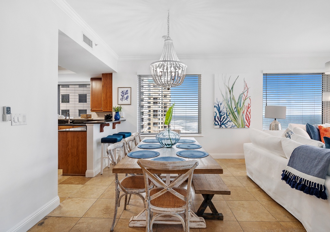 Completely renovated and styled in a modern coastal design, this 4-bedroom, 4-bath retreat on the 11th floor of Indigo West in Perdido Key offers the ultimate Gulf Coast getaway. Located in the highly sought-after East corner of the West tower, the unit boasts spectacular, unobstructed views of the shimmering coastline. The light and airy living space, with its clean white walls, blue accents, and rustic wood finishes, welcomes you with natural textures and a cozy atmosphere. The oversized living room features a plush sofa, love seat, and large screen TV, perfect for relaxing after a day at the beach. A dining area with seating for eight and a stunning wood bead chandelier offers a perfect space for family meals, while extra windows flood the unit with natural light. Step out onto the oversized balcony, complete with dining furniture and loungers, and enjoy breathtaking views from sunrise to sunset.